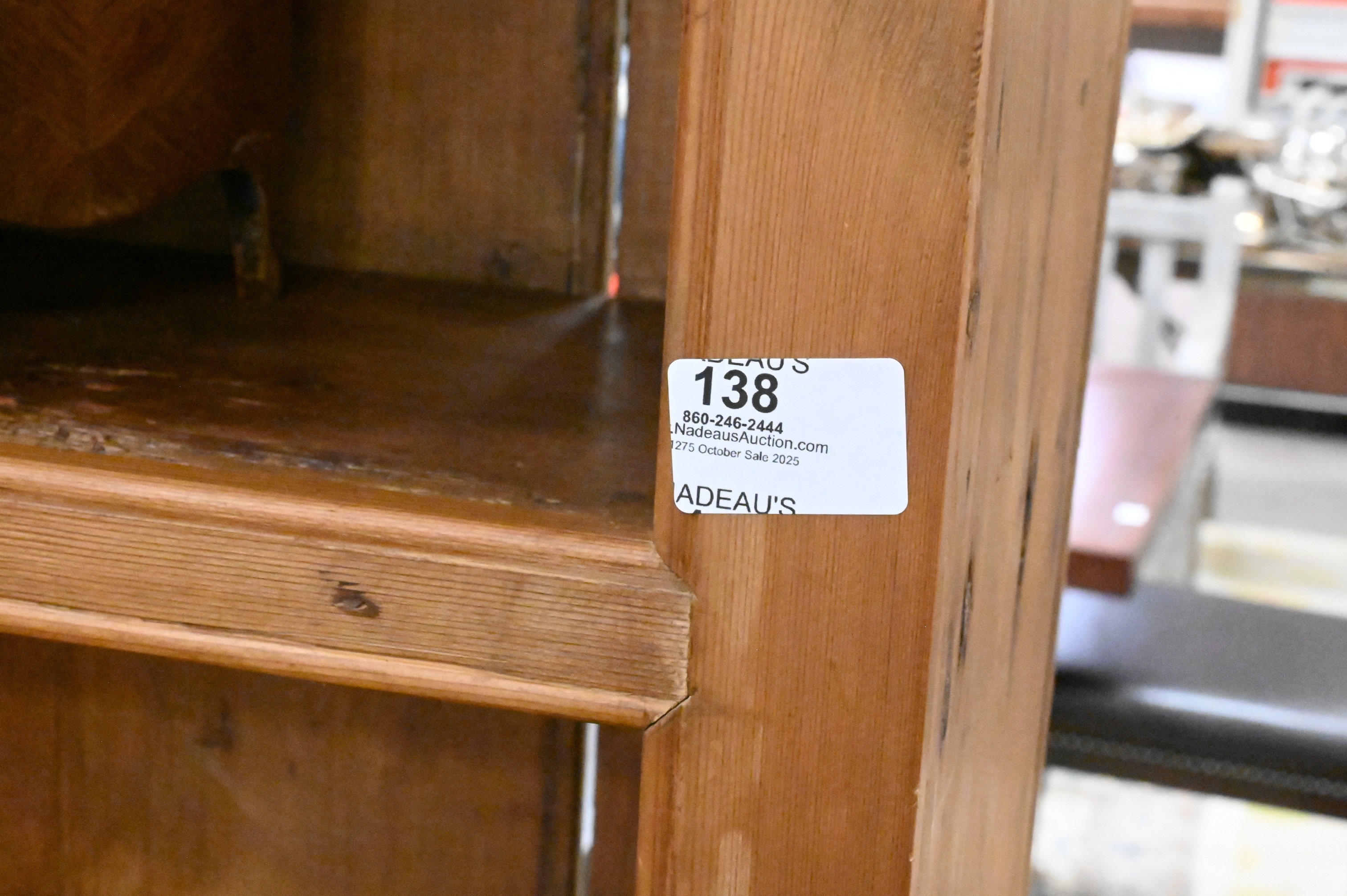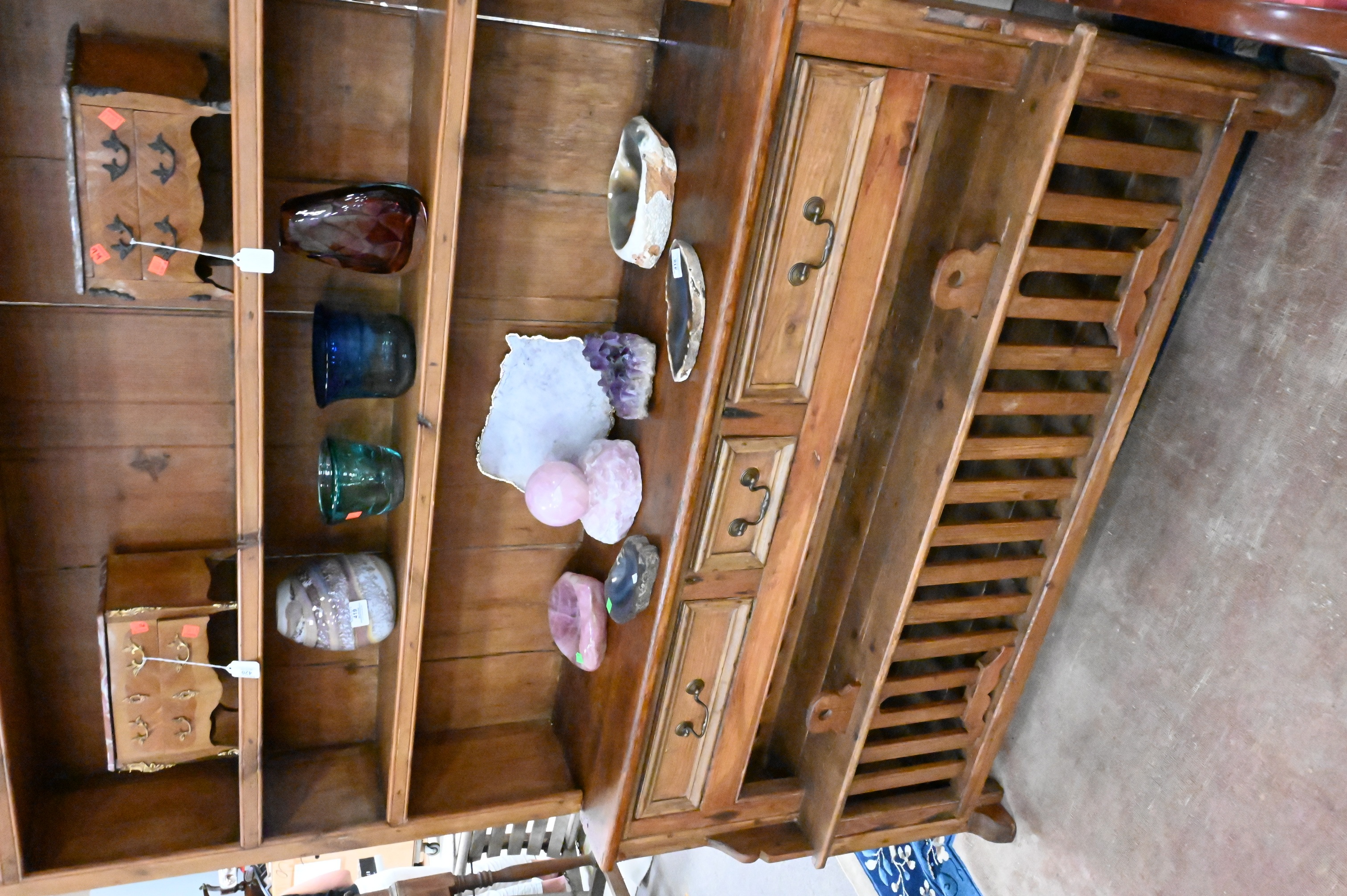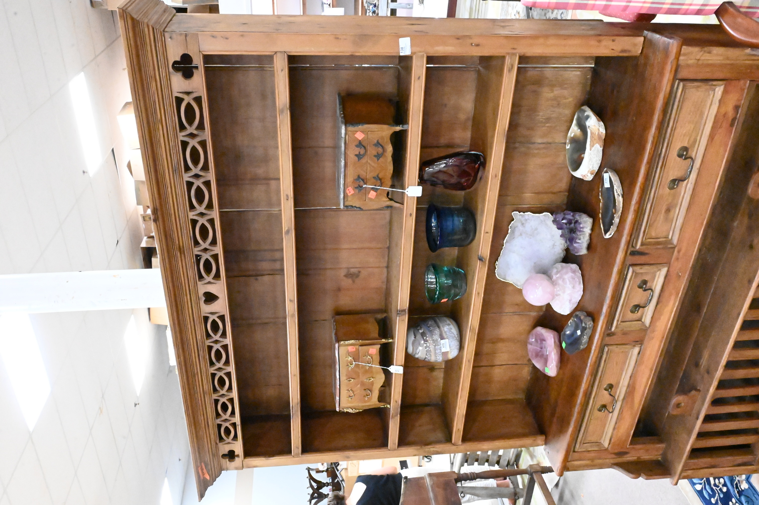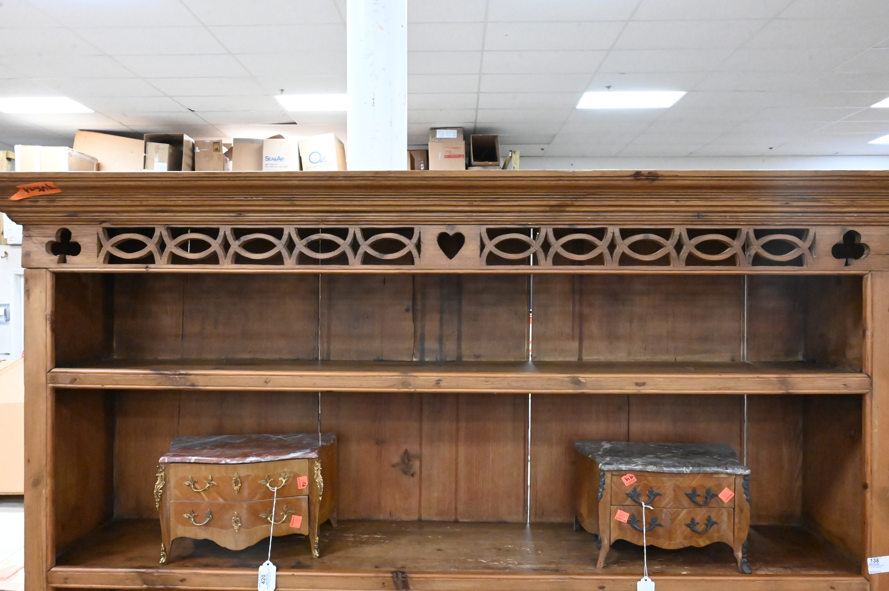 open top with heart and clover motif, four shelves over three drawers traveling down to double sliding chicken door and coup