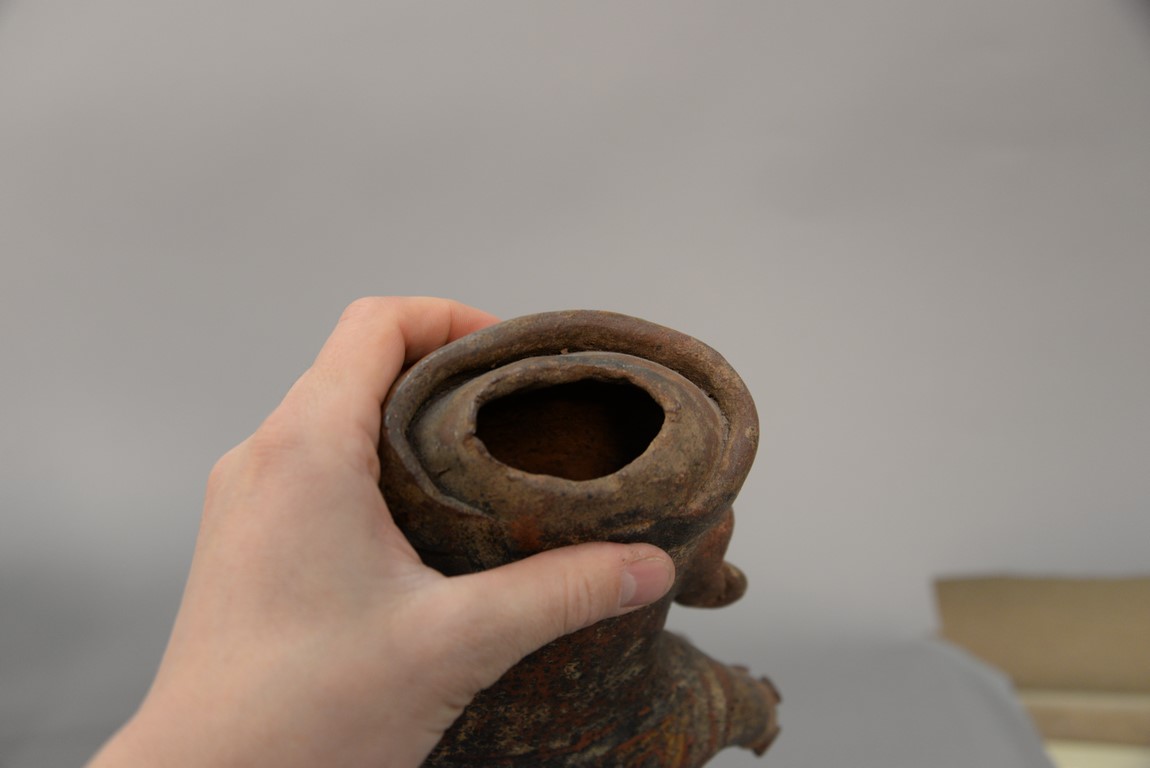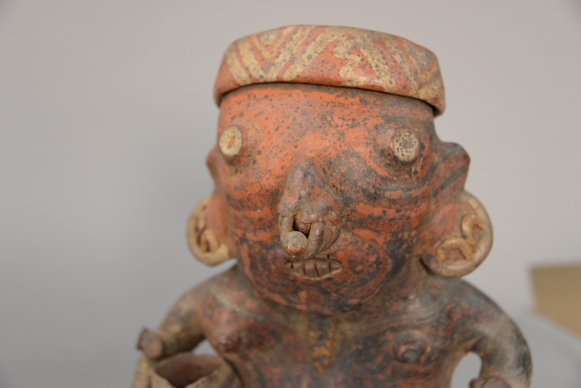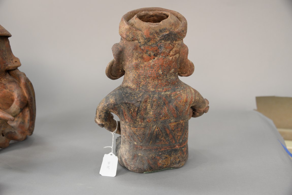 Lot 138: Large South American clay pottery seated figure in the form of a vessel having red and white paint. ht. 11 in.