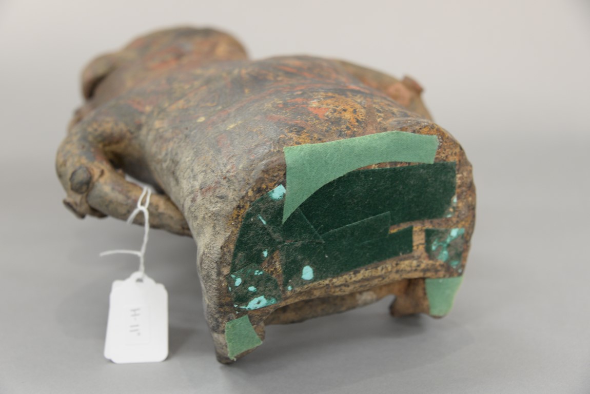 Large South American clay pottery seated figure in the form of a vessel having red and white paint. ht. 11 in.