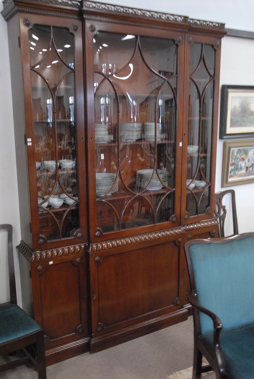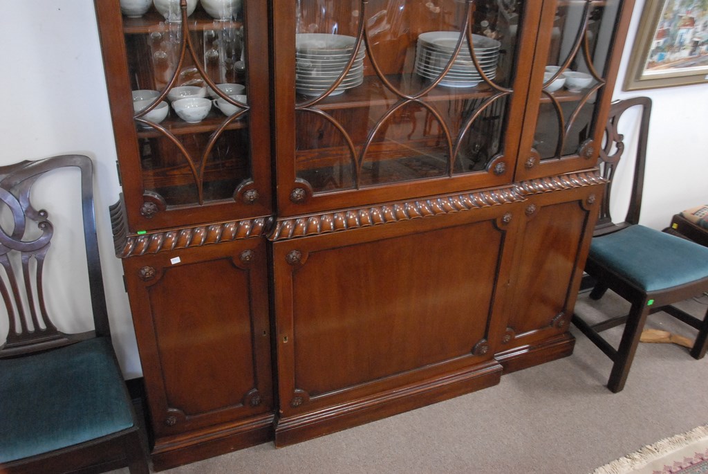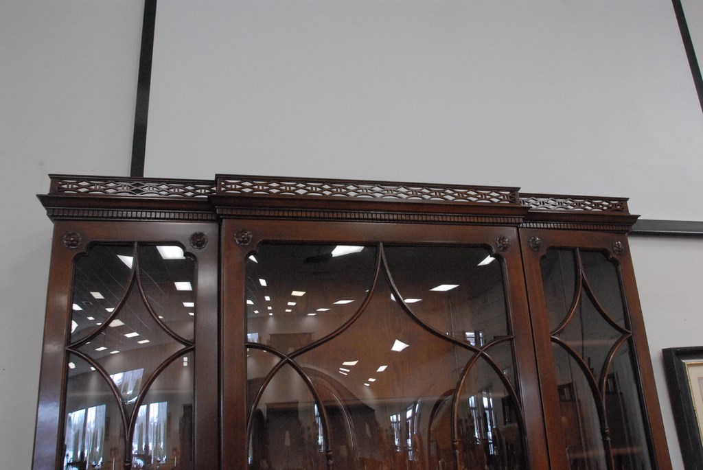 Lot 138: Mahogany benchmade breakfront in four parts having pierce carved gallery and three bubble glass doors over three doors on plain base…