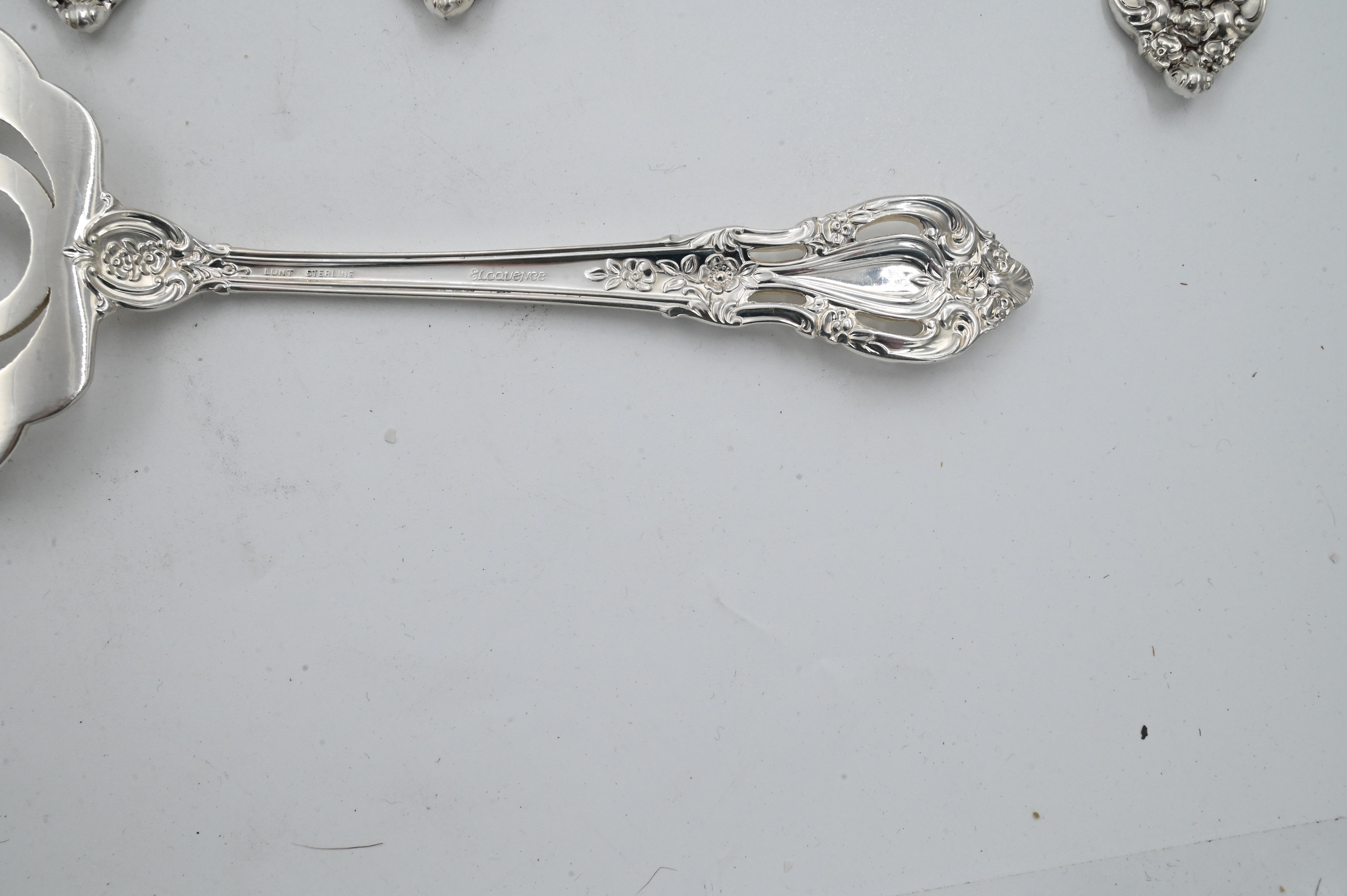 to include one fish server and two asparagus servers in Quintessence pattern, one large serving spoon, three asparagus servers, one fish server, and one salad spoons in Eloquence pattern