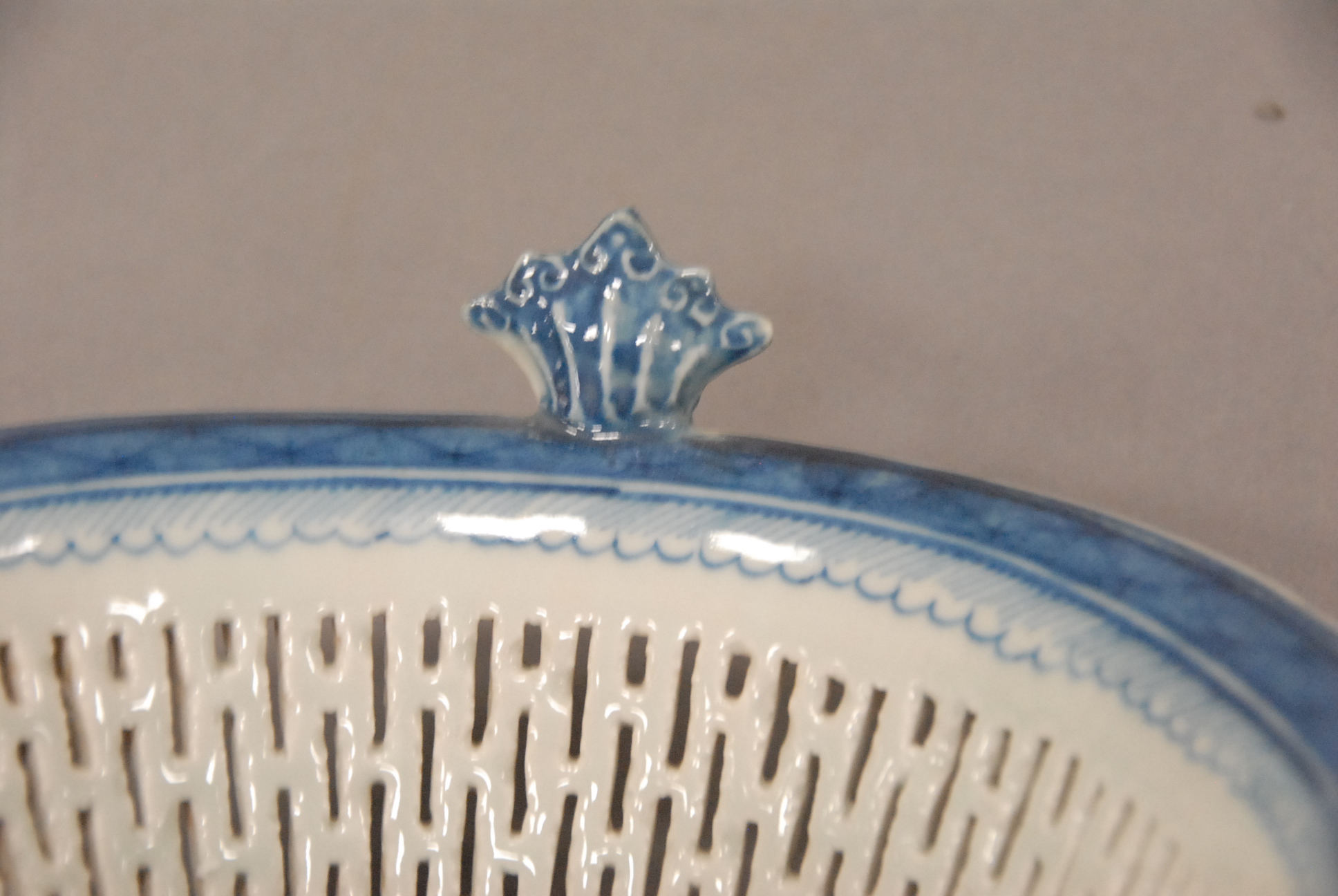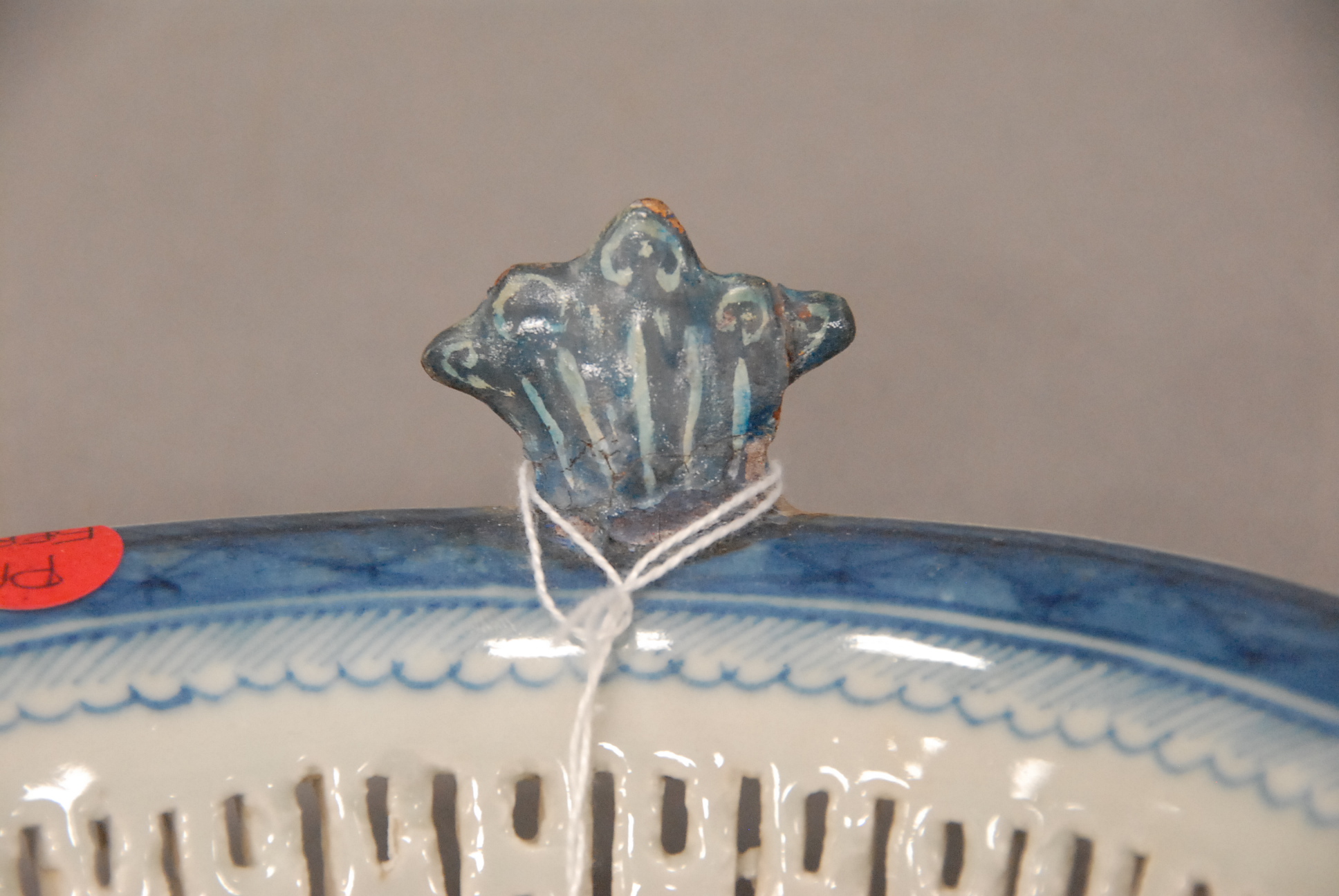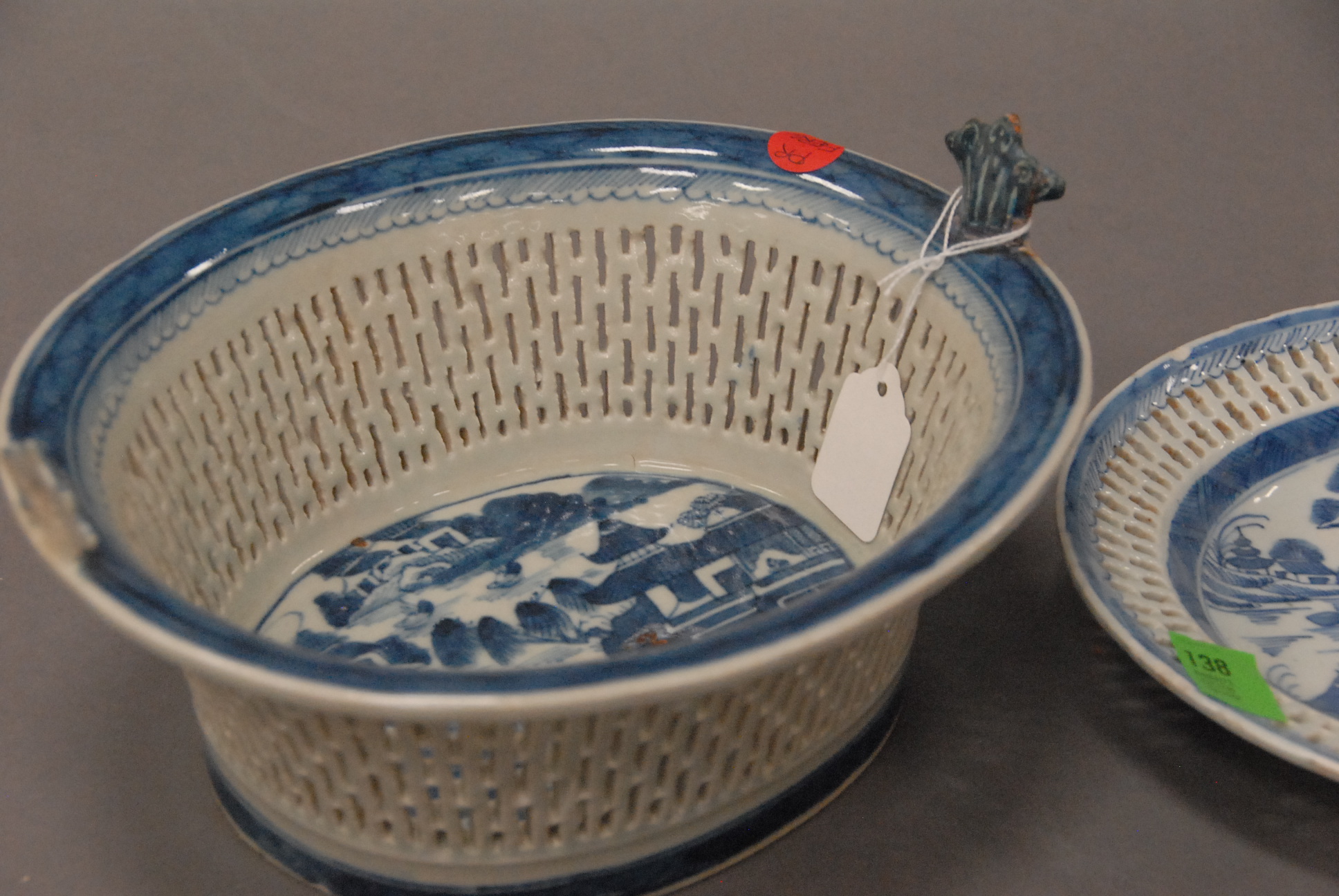 Reticulated Canton oval bowl and under plate, small chip on under plate, dish has a repaired handle.