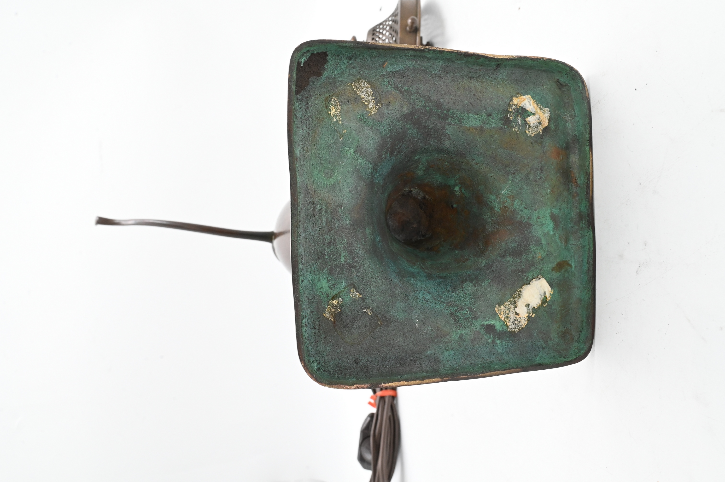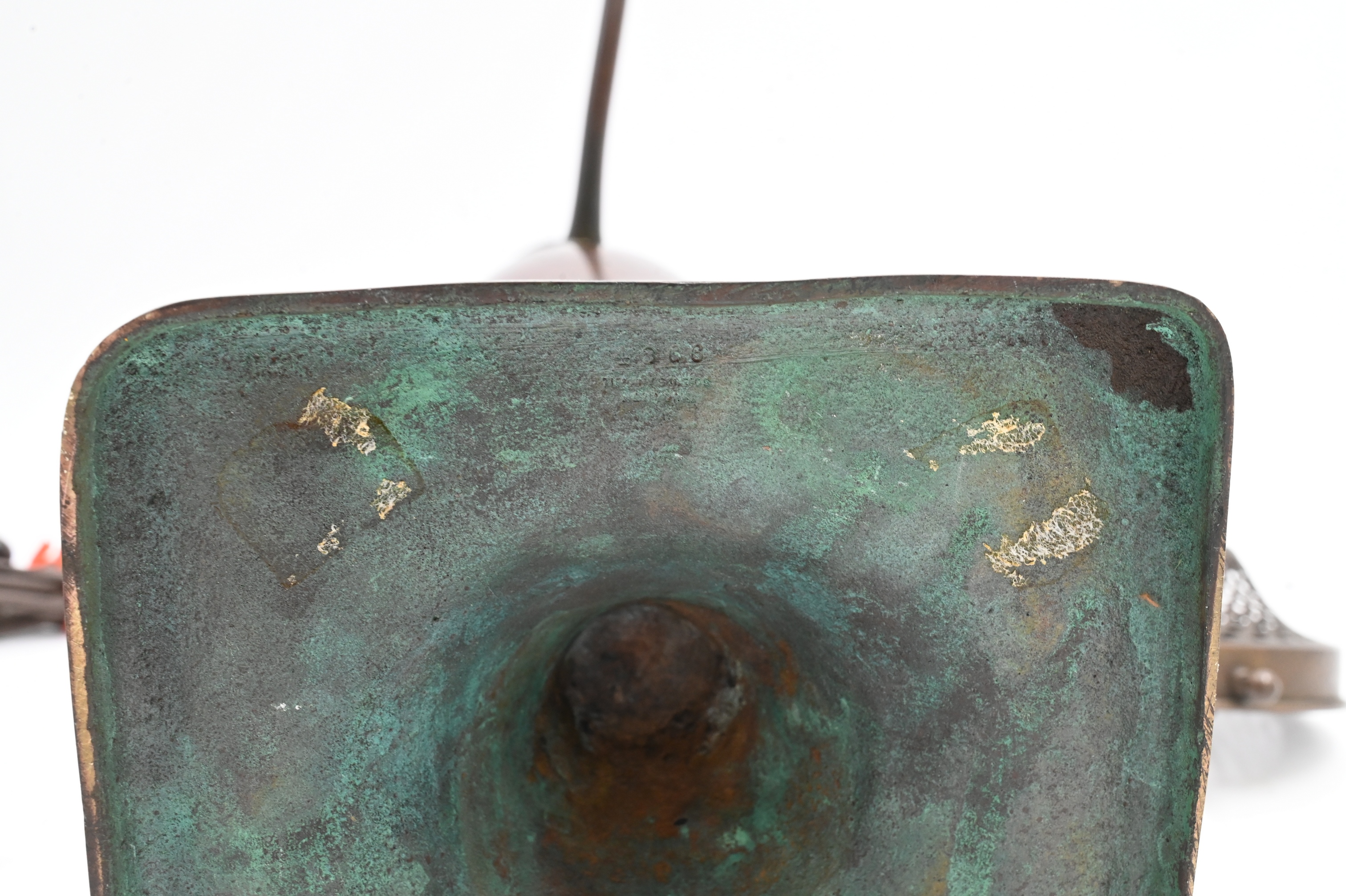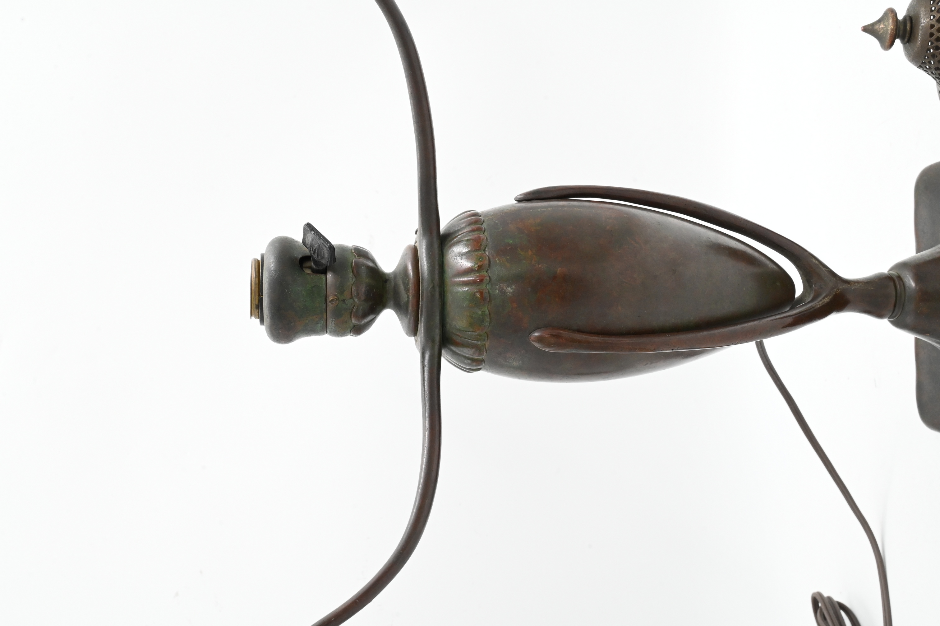model #444 of amphora vase form supported by three arms all over square base, in dark brown and green patina, along with shade finial, impressed mark to base Tiffany Studios New York, along with heavily broken shade