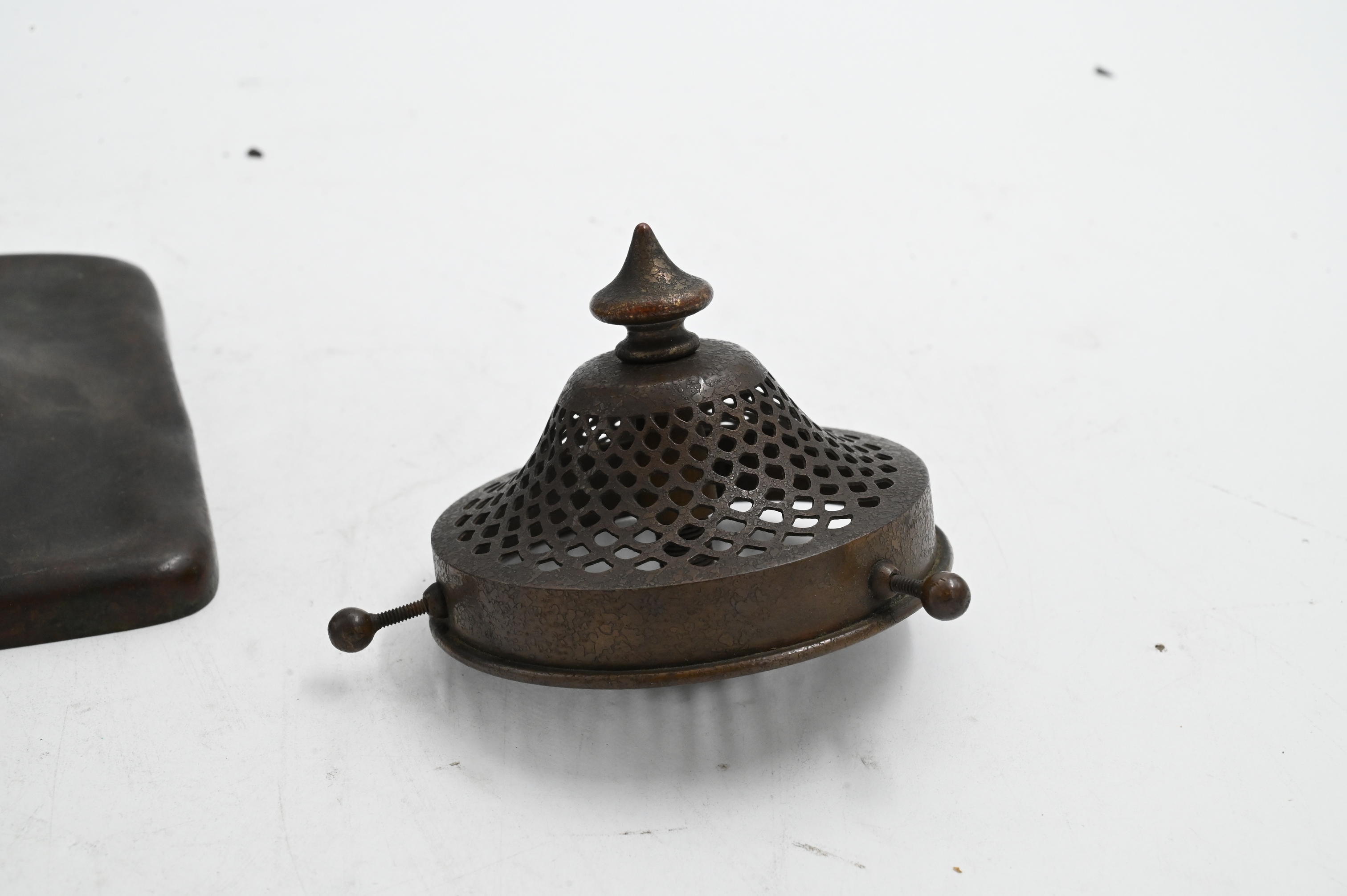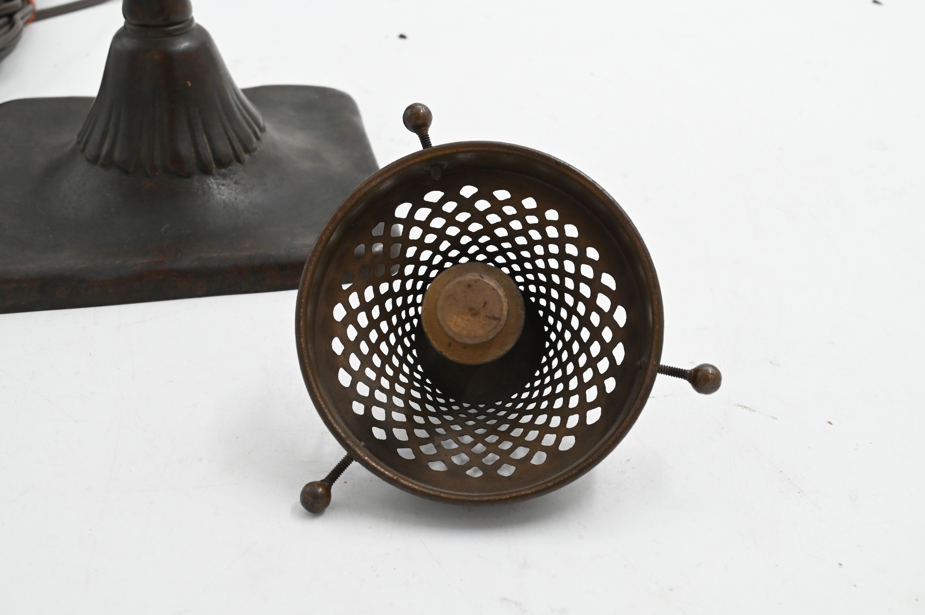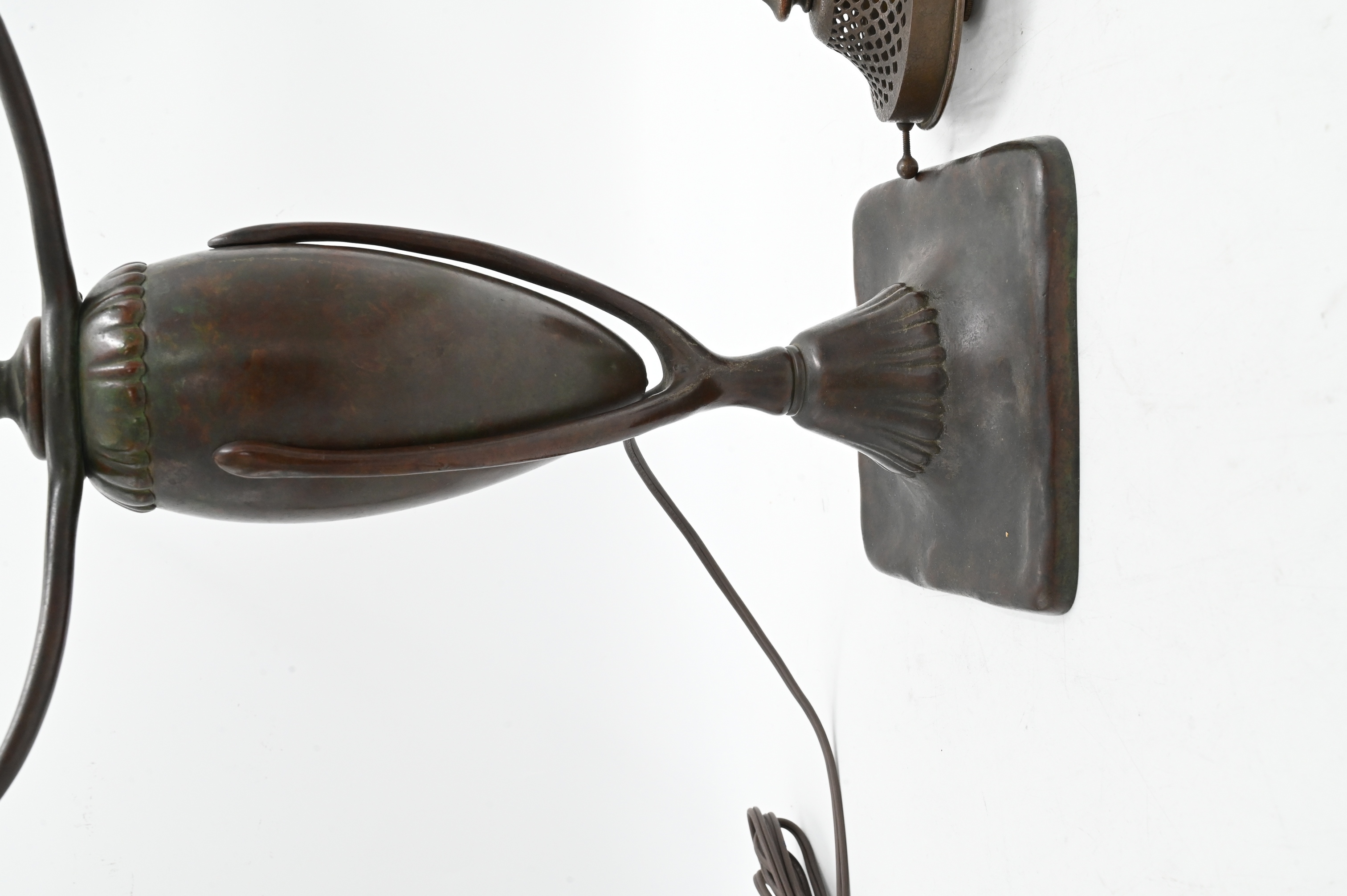 model #444 of amphora vase form supported by three arms all over square base, in dark brown and green patina, along with shade finial, impressed mark to base Tiffany Studios New York, along with heavily broken shade