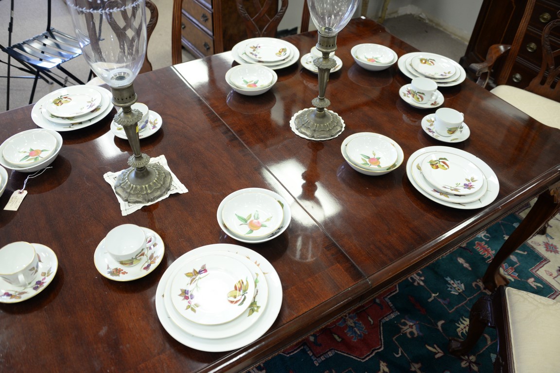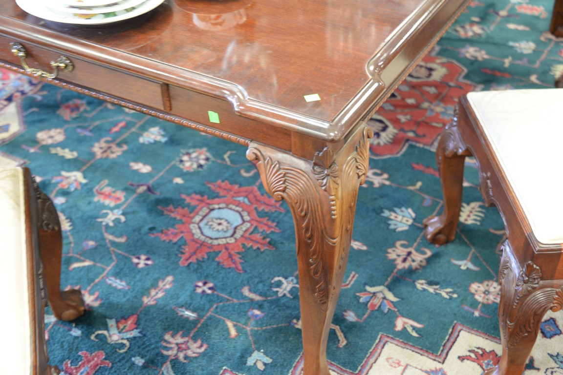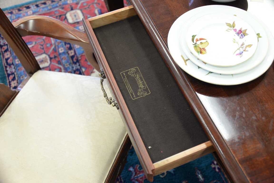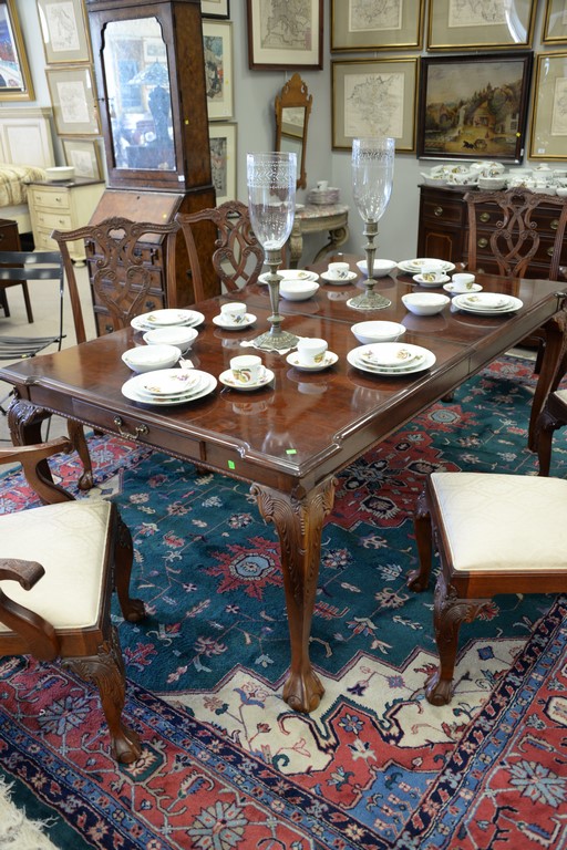 Lot 138A: Stoneleigh mahogany banded inlaid dining table having ball and claw feet with two 24 inch leaves. ht. 29 1/2in., top closed: 76 x 4…