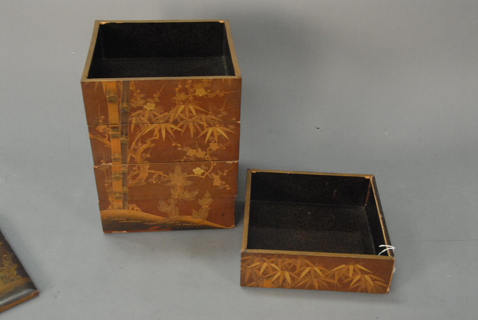 Lot 138C: Japanese five-tier ‘Jubako’ lacquered box, Meiji period, late 19th century. ht. 16in. wd. 10in. dp. 9in.
