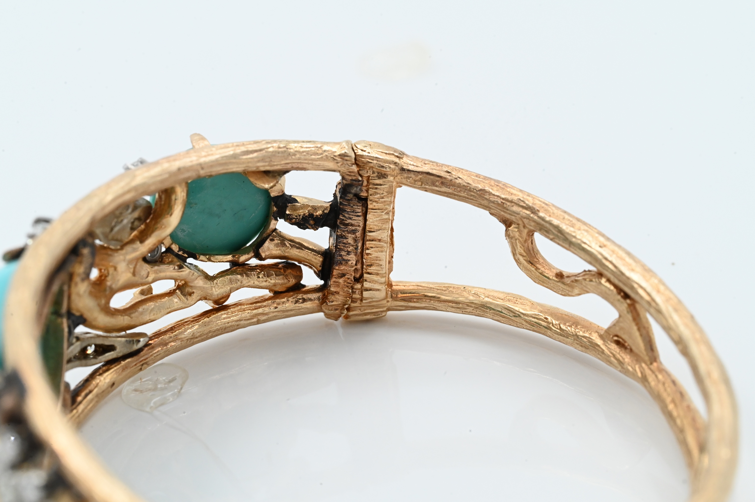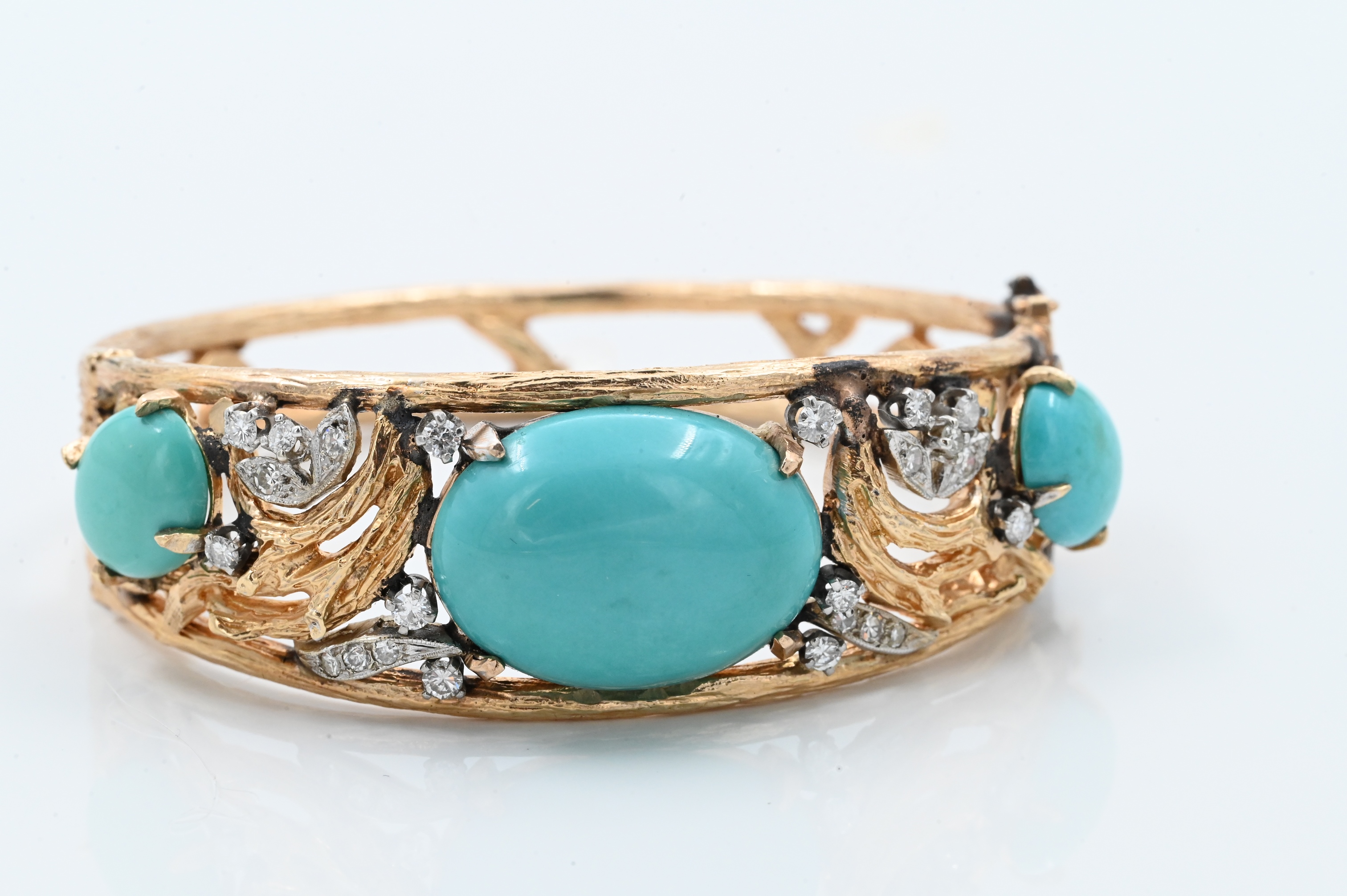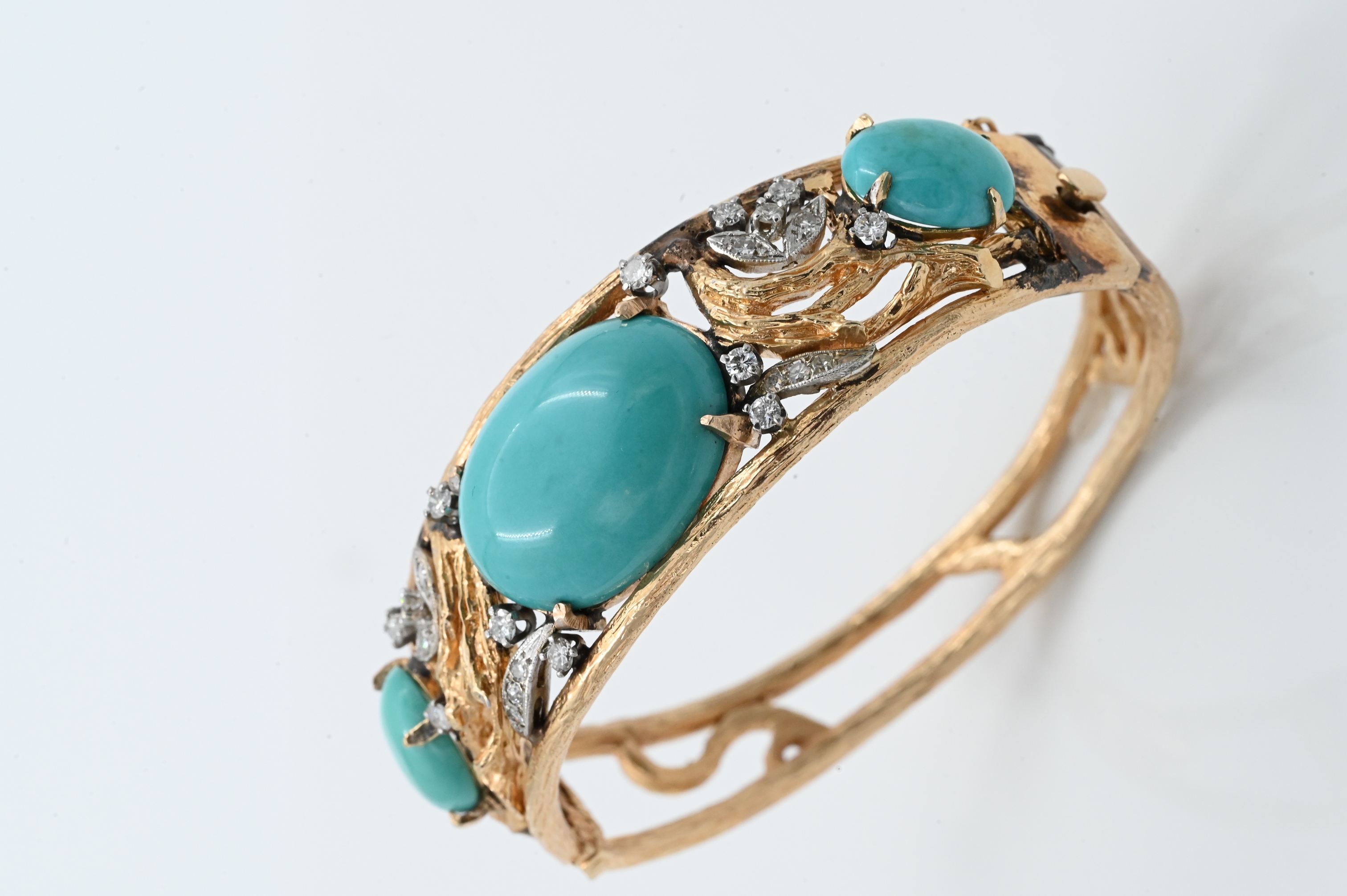 having oval cabochon cut turquoise and diamonds, in openwork design