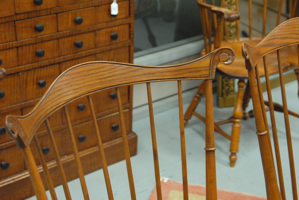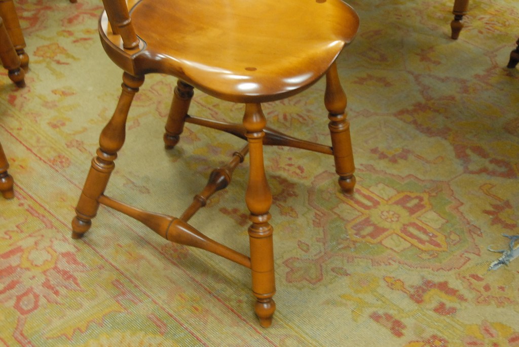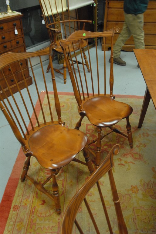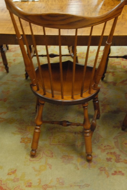Lot 139: D. R. Dimes set of twelve fan back Windsor style chairs with bold turned legs signed on bottom D. R. Dimes, like new condition.