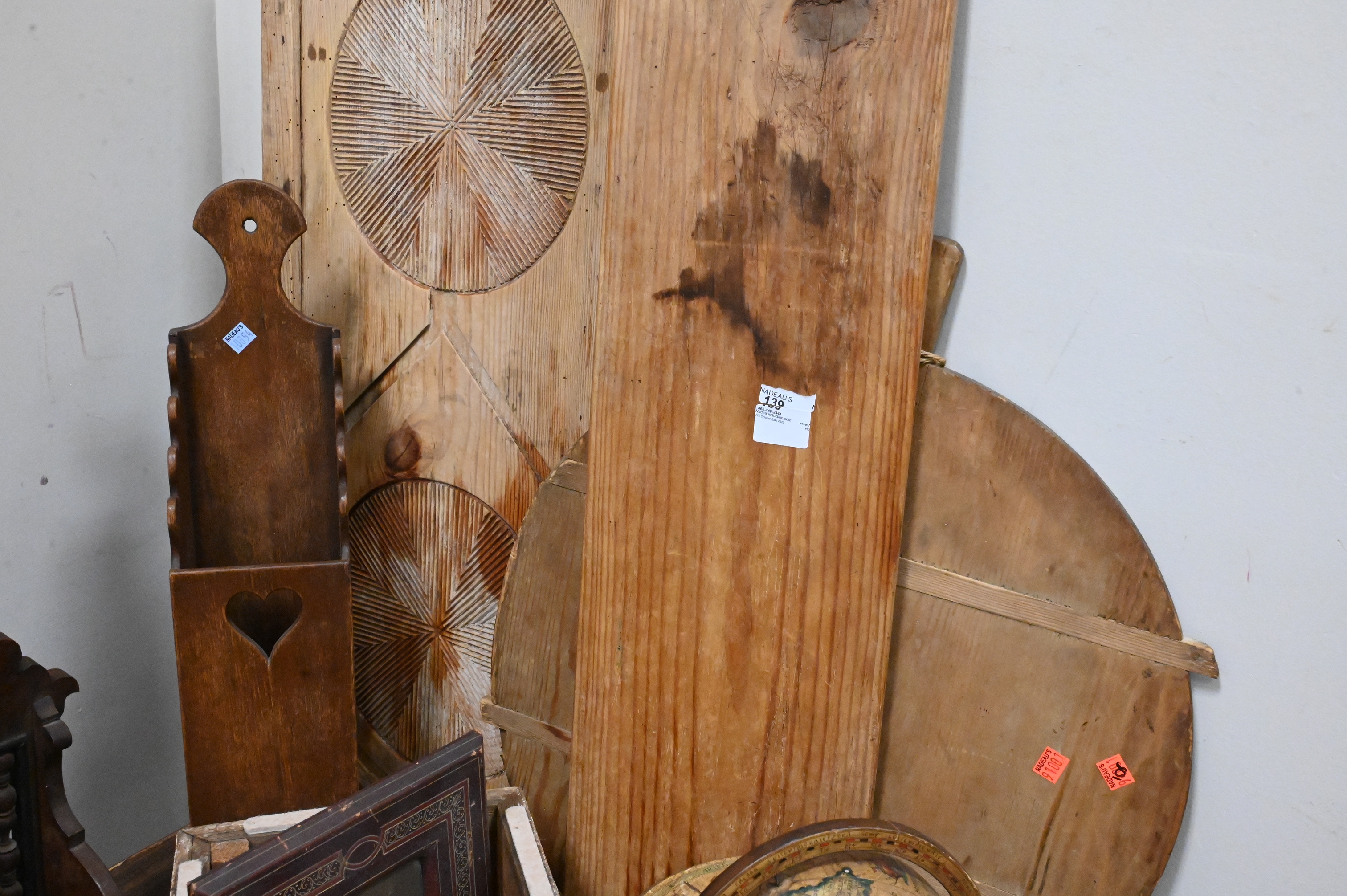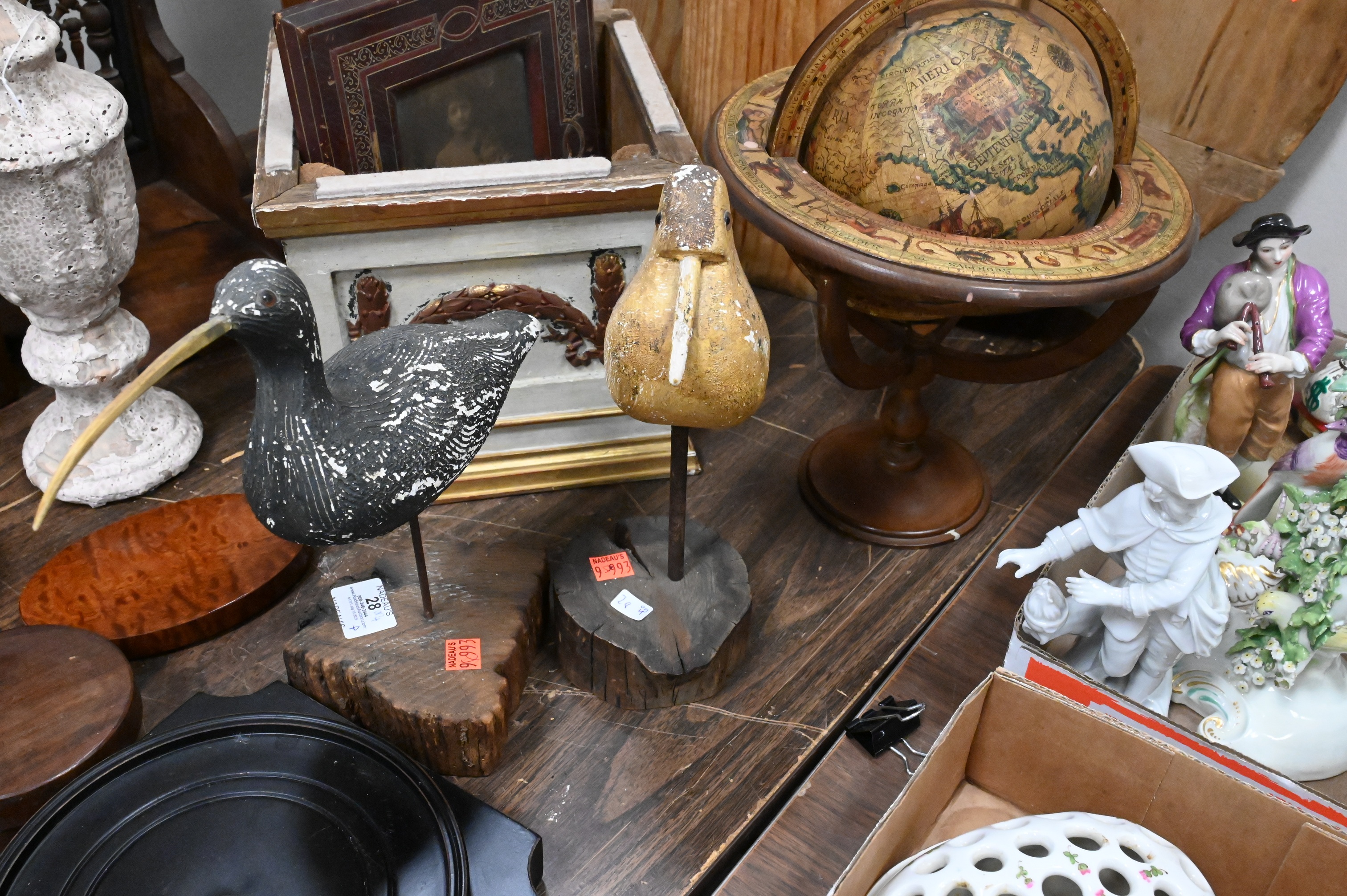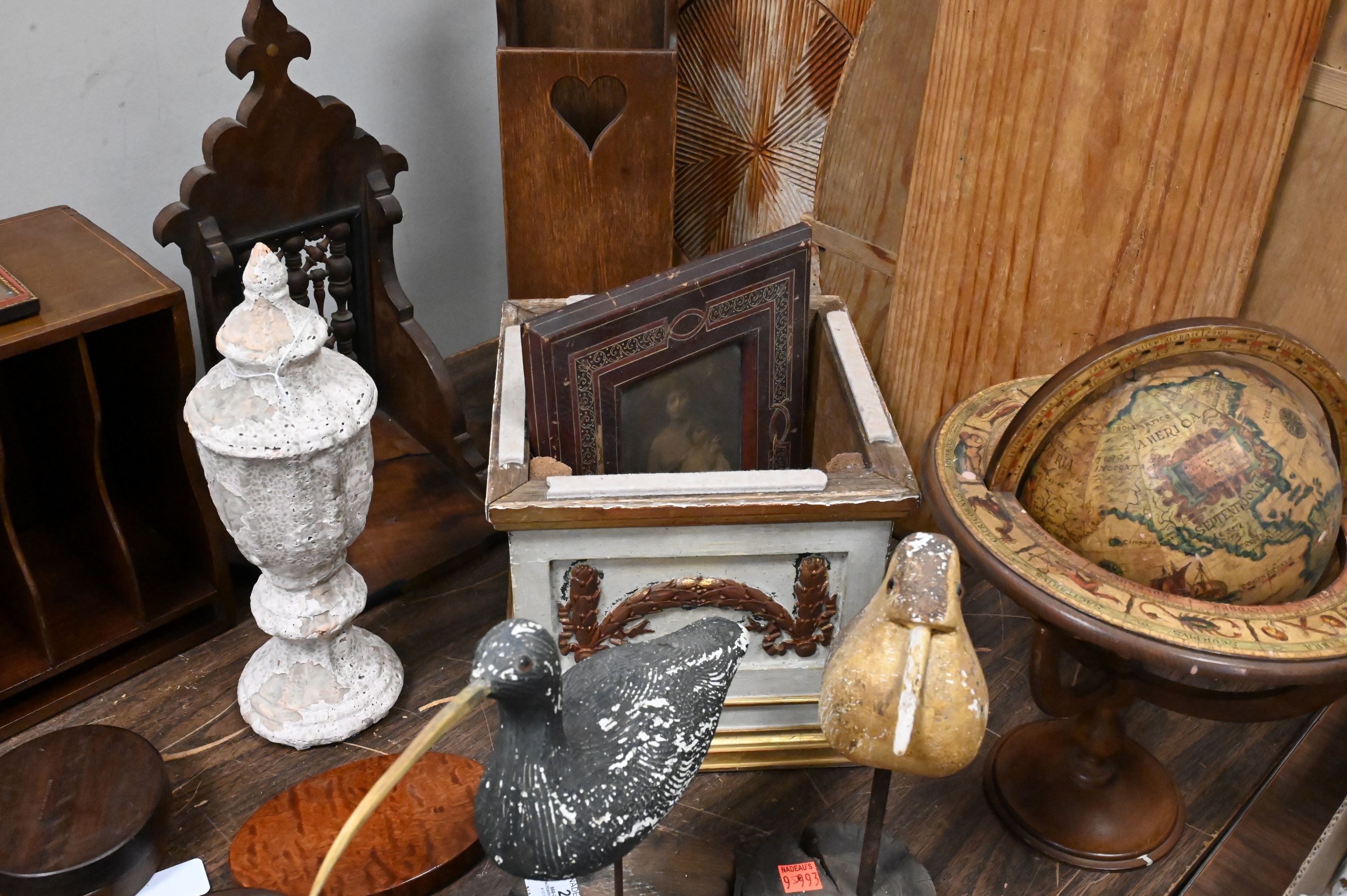 two carved and painted shorebirds, Edwardian inlaid mahogany letter caddy, Three Primitive Wooden Kitchen Tools, folk art double cheese drainer, rectangular bread board along with round board etc…