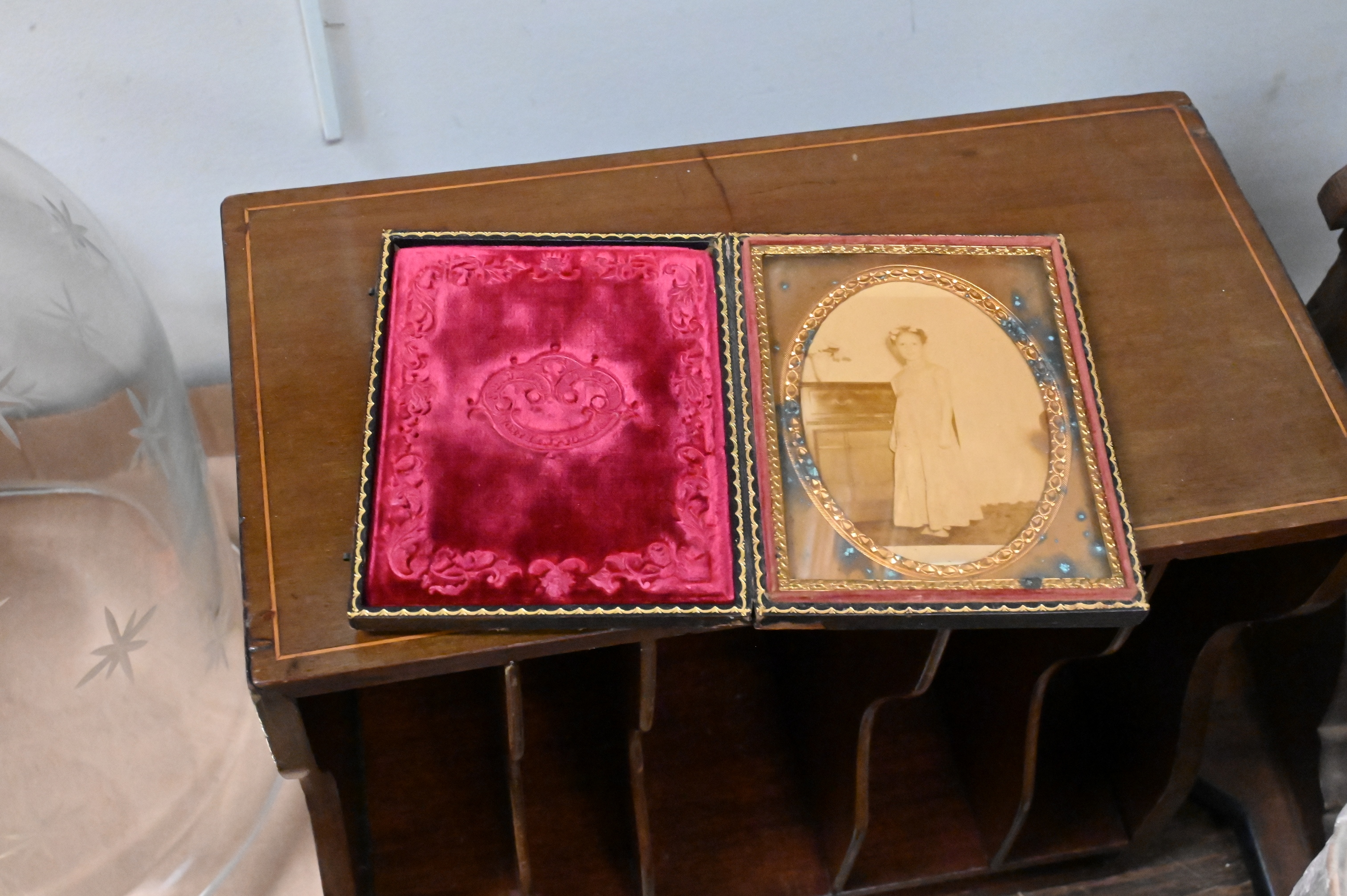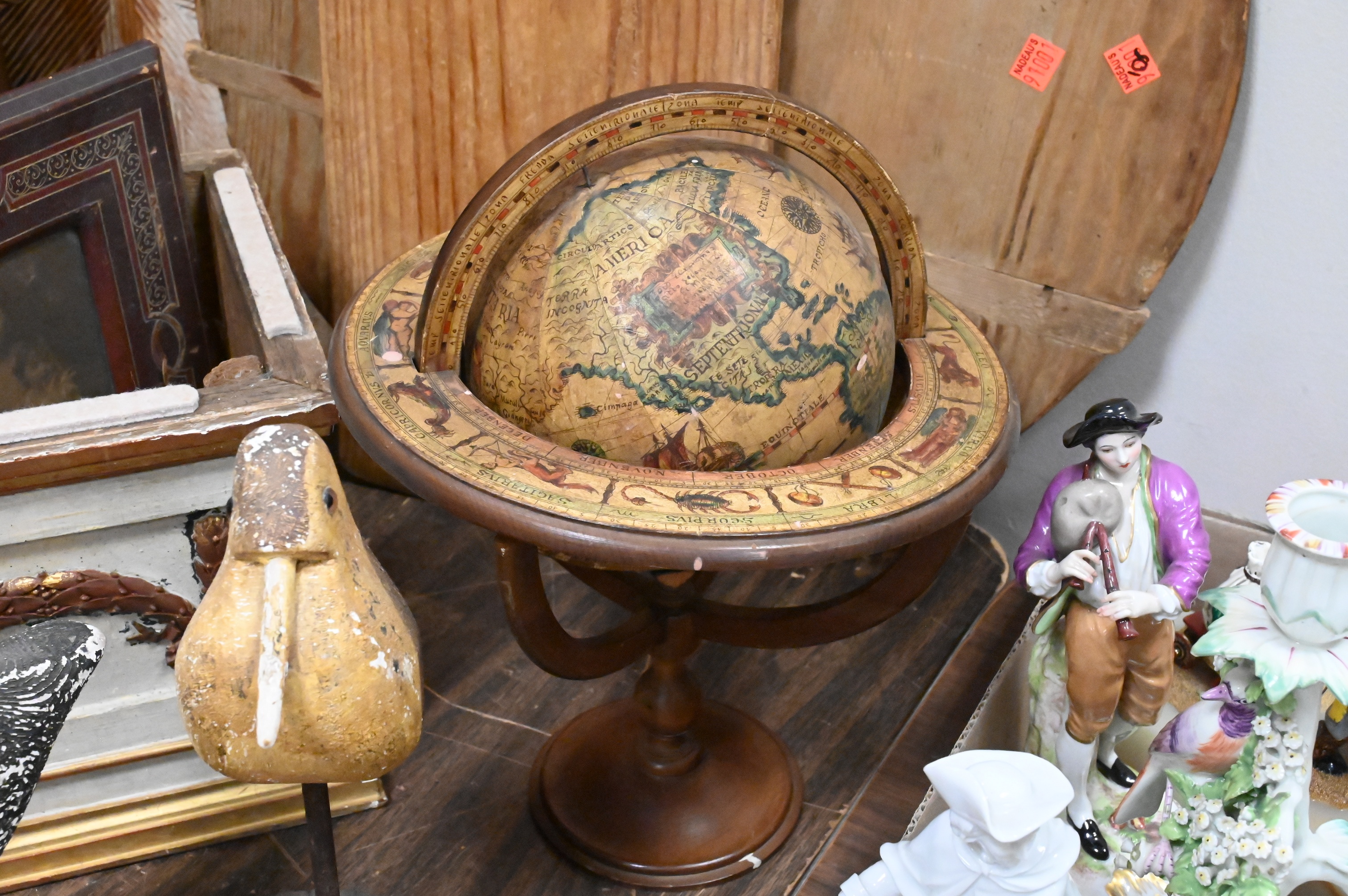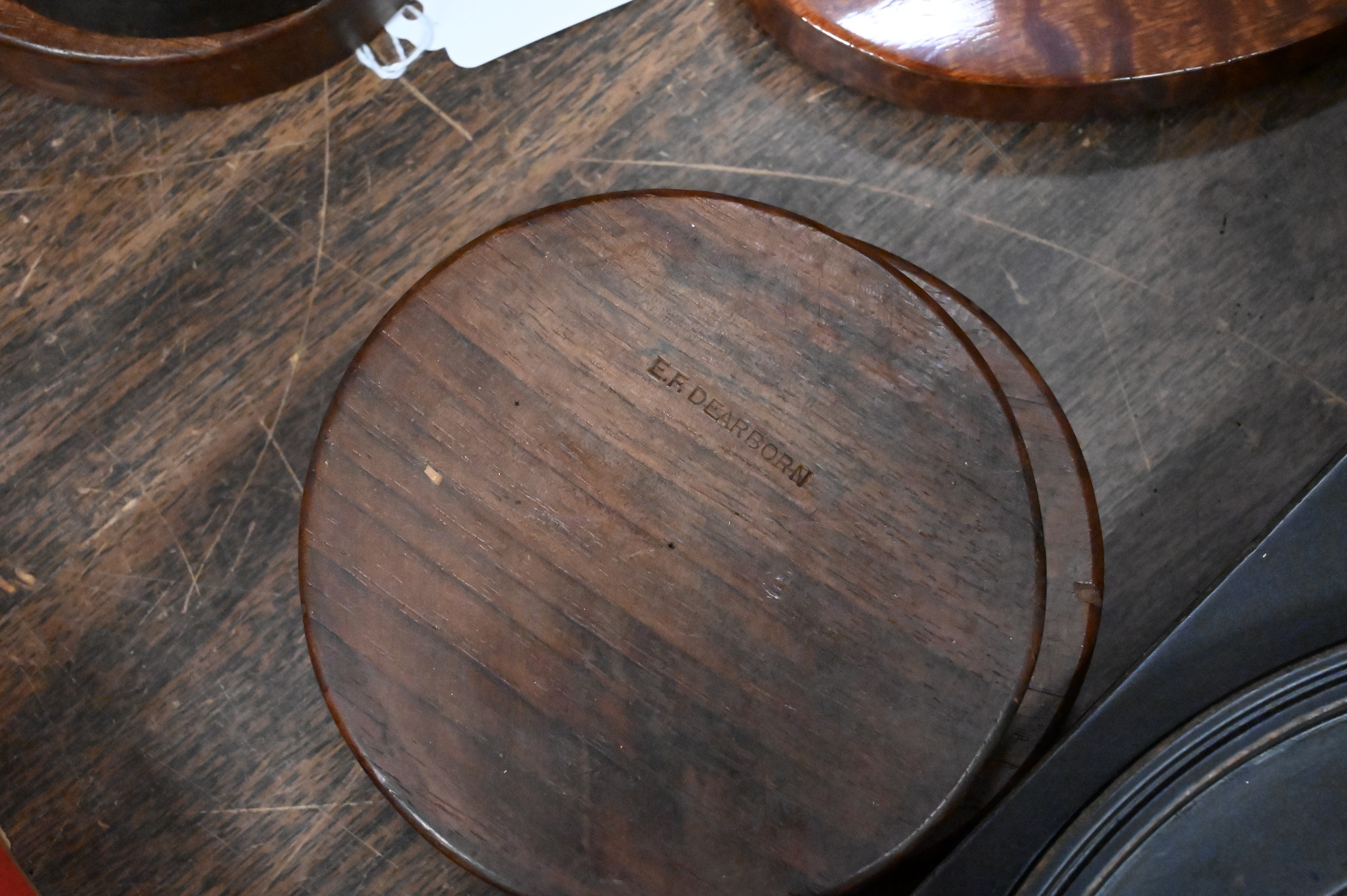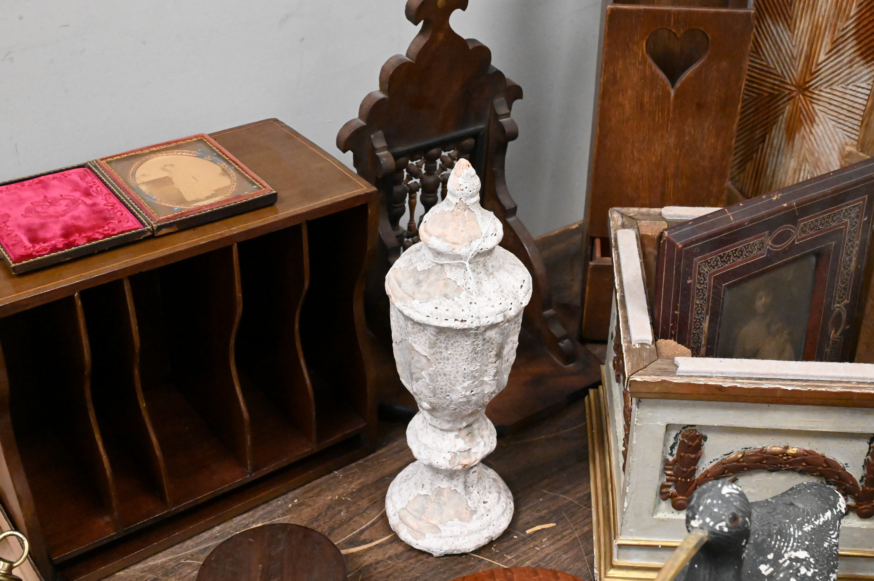 two carved and painted shorebirds, Edwardian inlaid mahogany letter caddy, Three Primitive Wooden Kitchen Tools, folk art double cheese drainer, rectangular bread board along with round board etc…