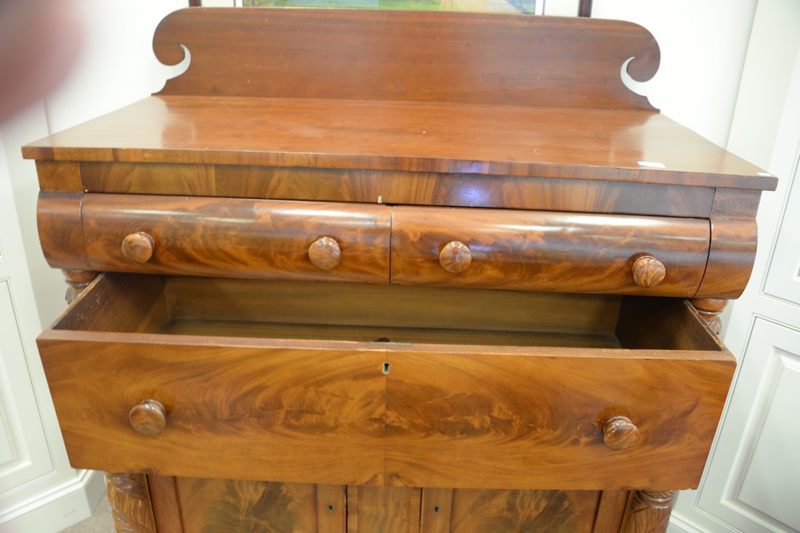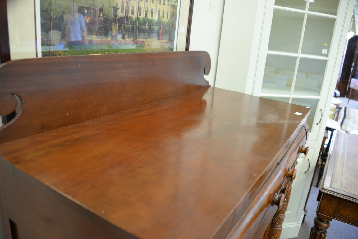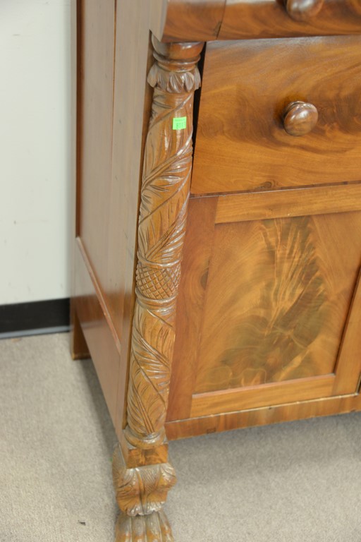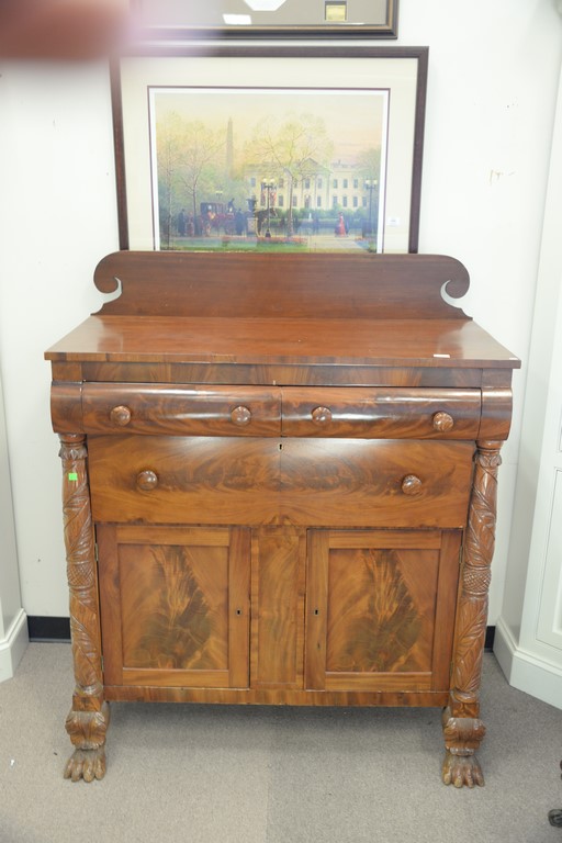 Lot 139: Federal mahogany and cherry server with carved columns and paw feet, circa 1840. ht. 48in., wd. 46in., dp. 21in.