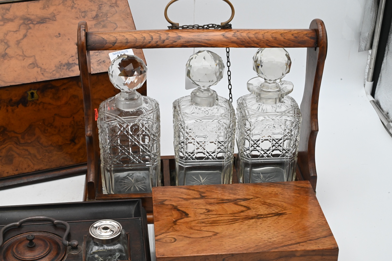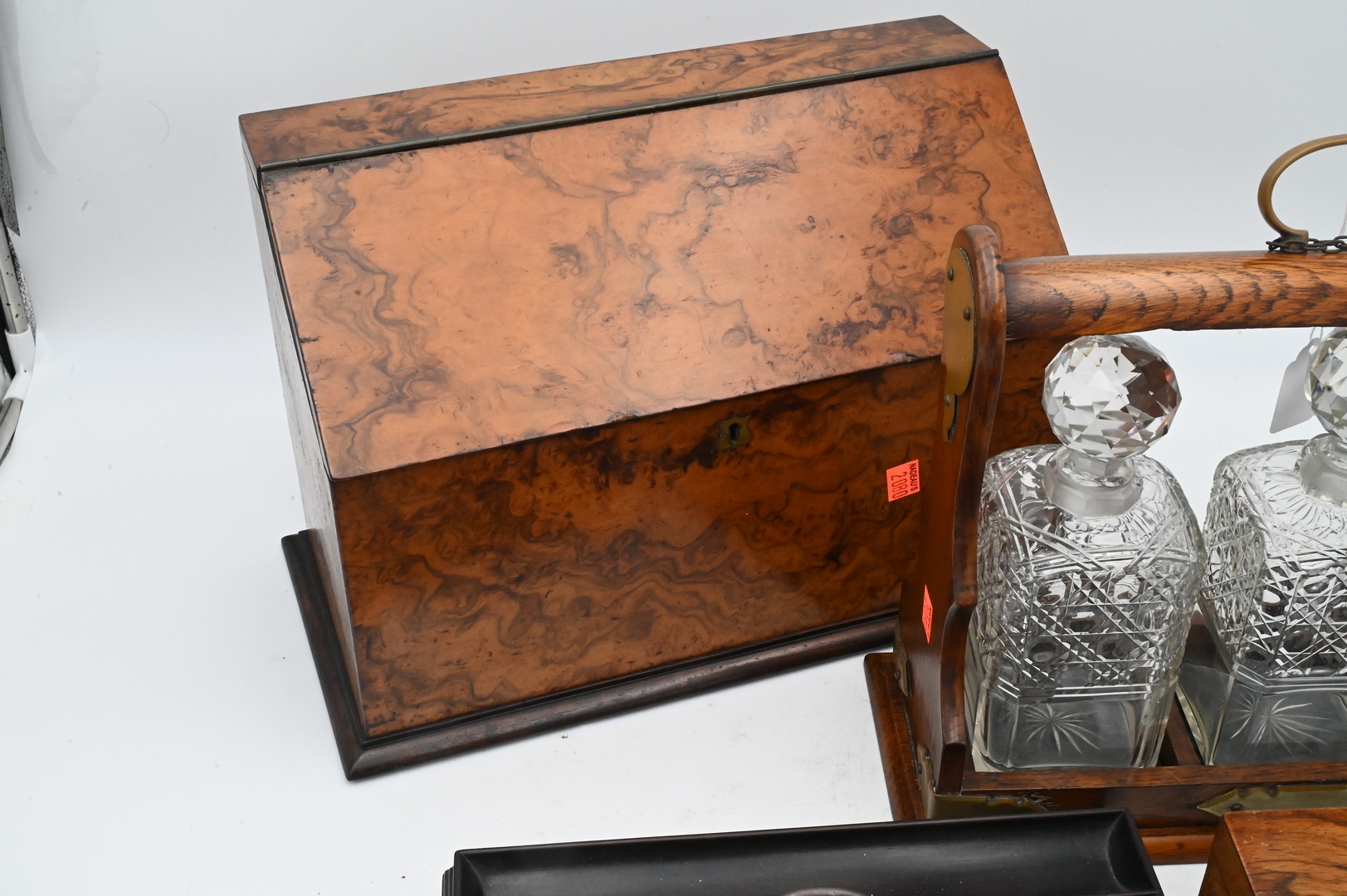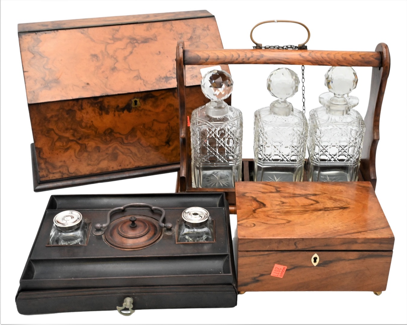 Four Piece Group, to include a Victorian oak tantalus, brass bound with three bottles; a small lift top box desk set with ink wells; along with a burl letter box; decanter height 8 inches.