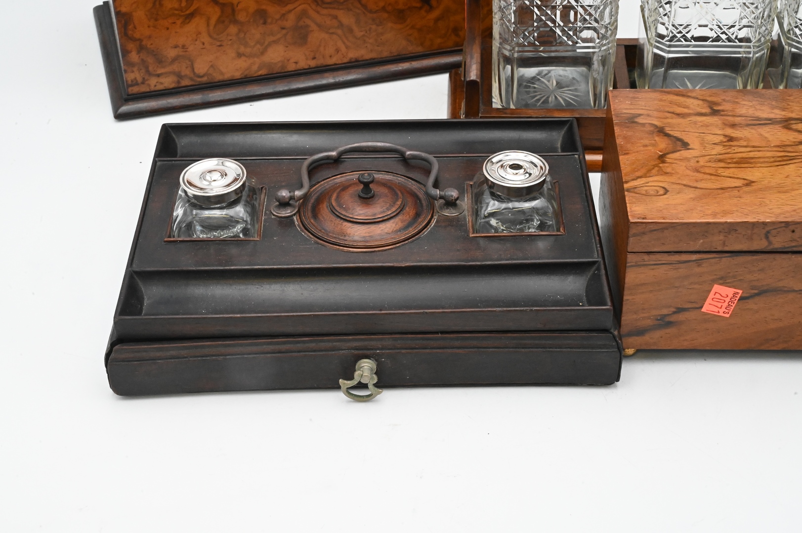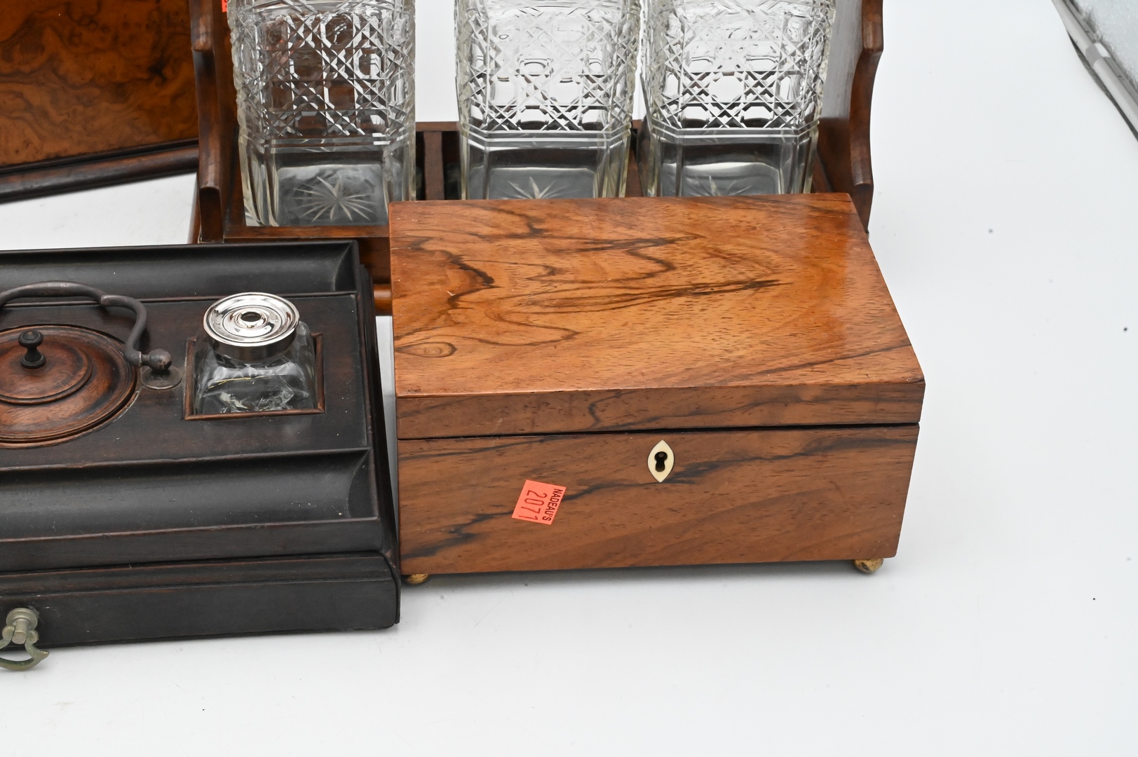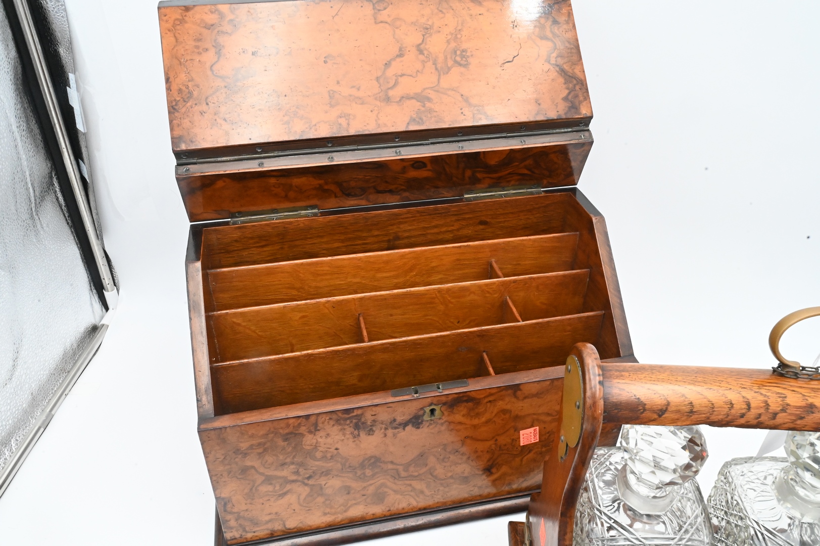 Four Piece Group, to include a Victorian oak tantalus, brass bound with three bottles; a small lift top box desk set with ink wells; along with a burl letter box; decanter height 8 inches.