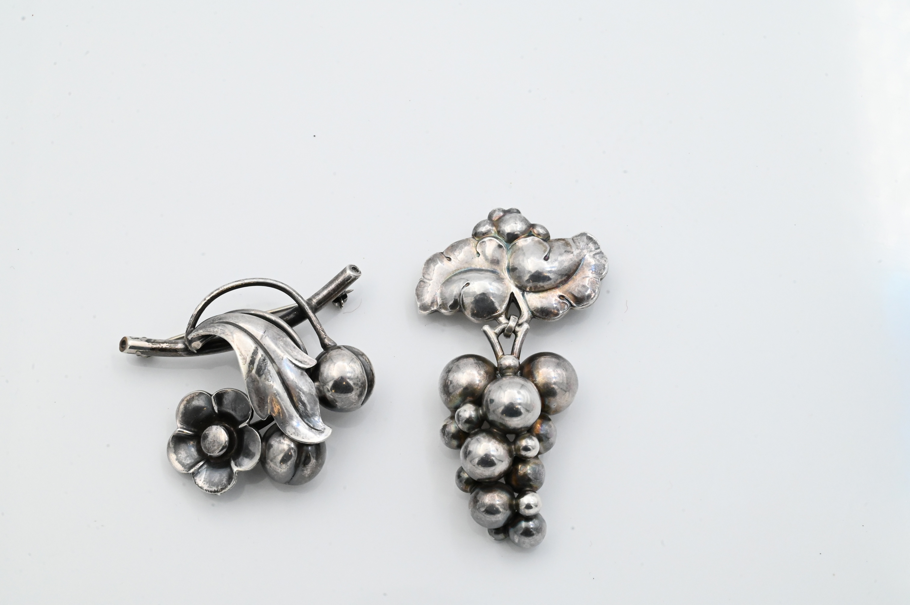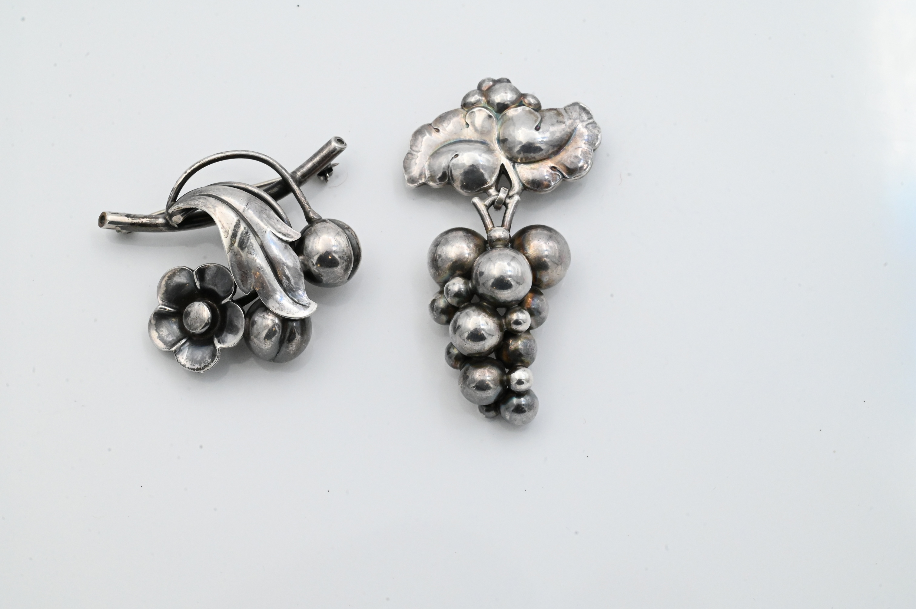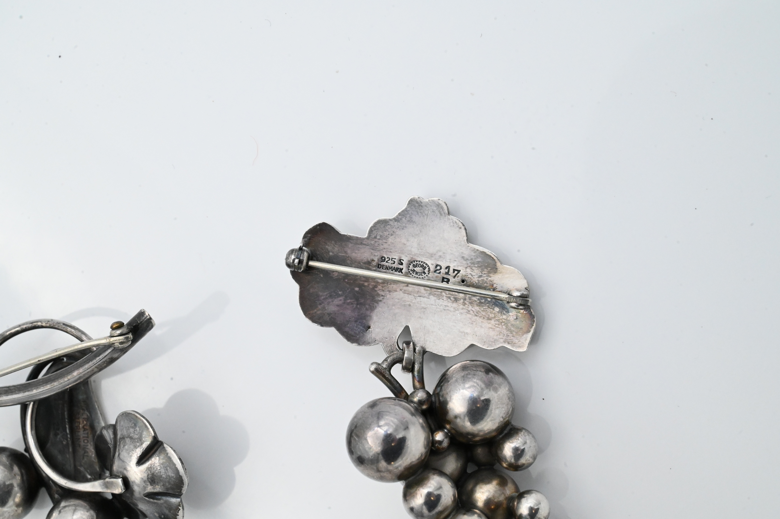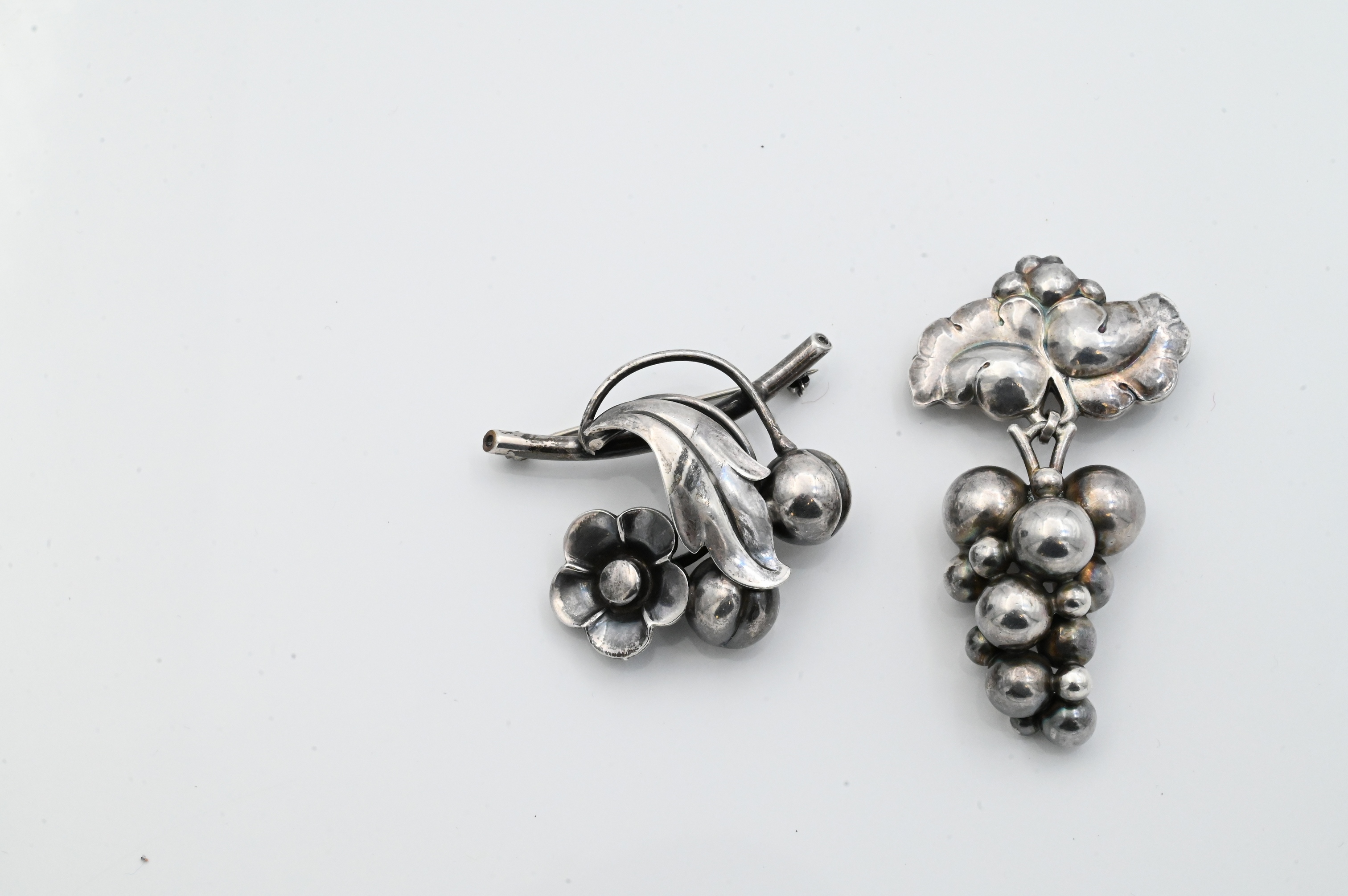 Including one Georg Jensen grape sterling silver brooch, design no. 217, Denmark, marked Georg Jensen 925S Denmark; together with one International Sterling floral brooch, marked International Sterling, Designed by J. Bellini, 234. Largest 3 inches long; total weight 1.3 t.oz..