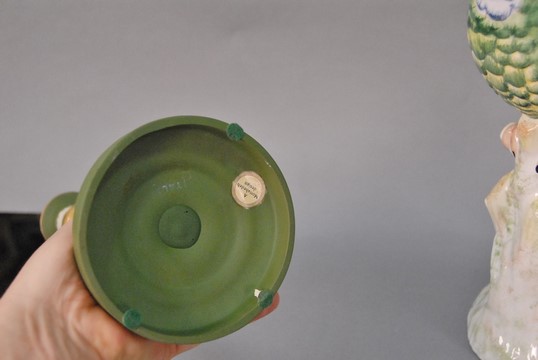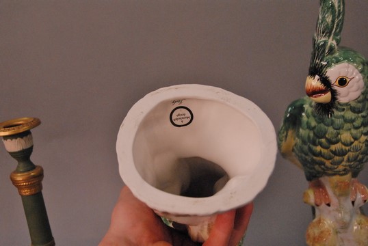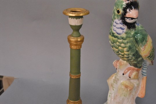Mottahedeh group to include a pair of 15 1/2 cockatoos and a pair of Wedgwood style candlesticks.