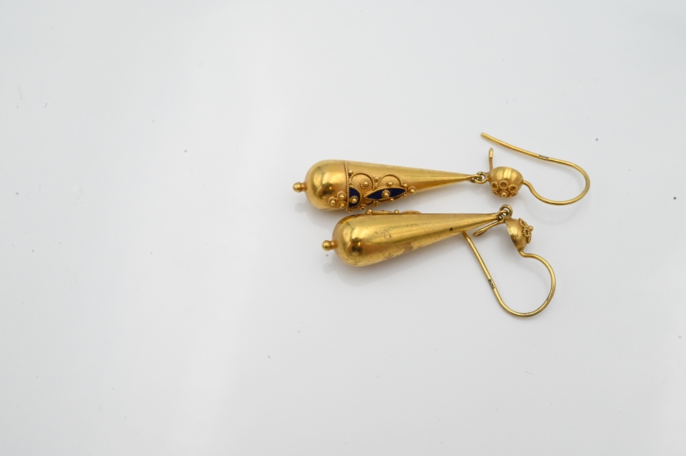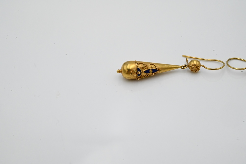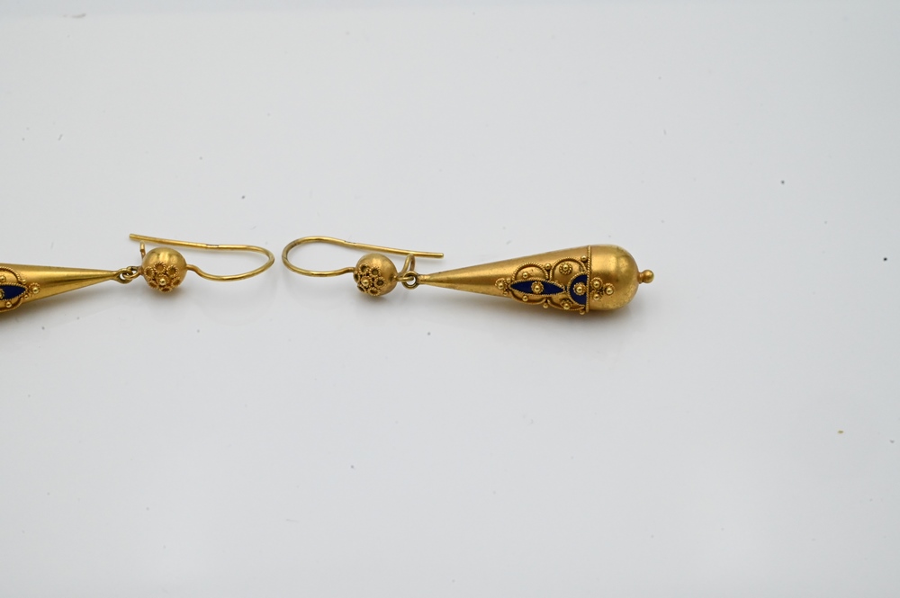 Pair of 18 Karat Gold Drop Earrings, having blue enameling, 4.8 grams.