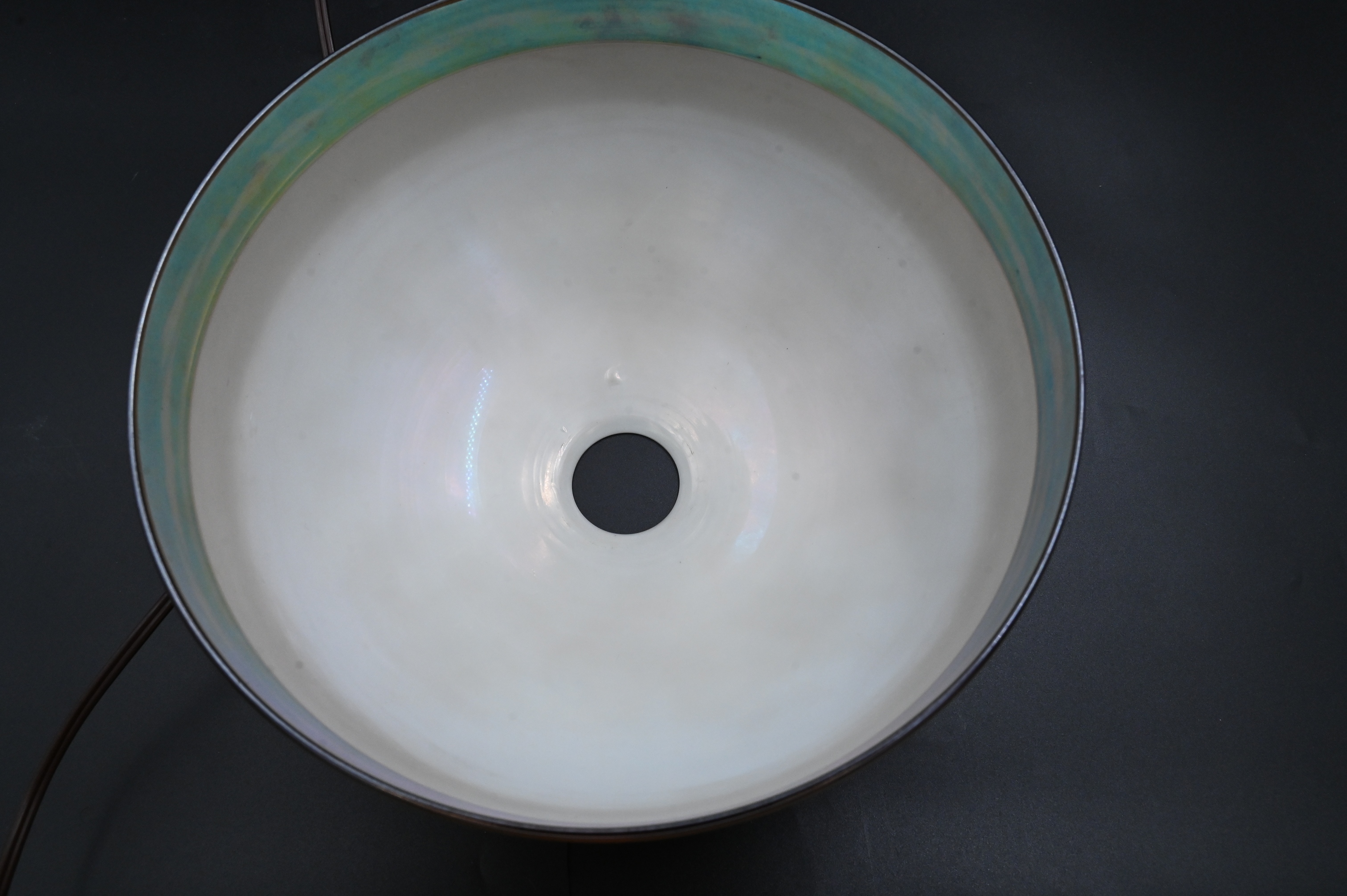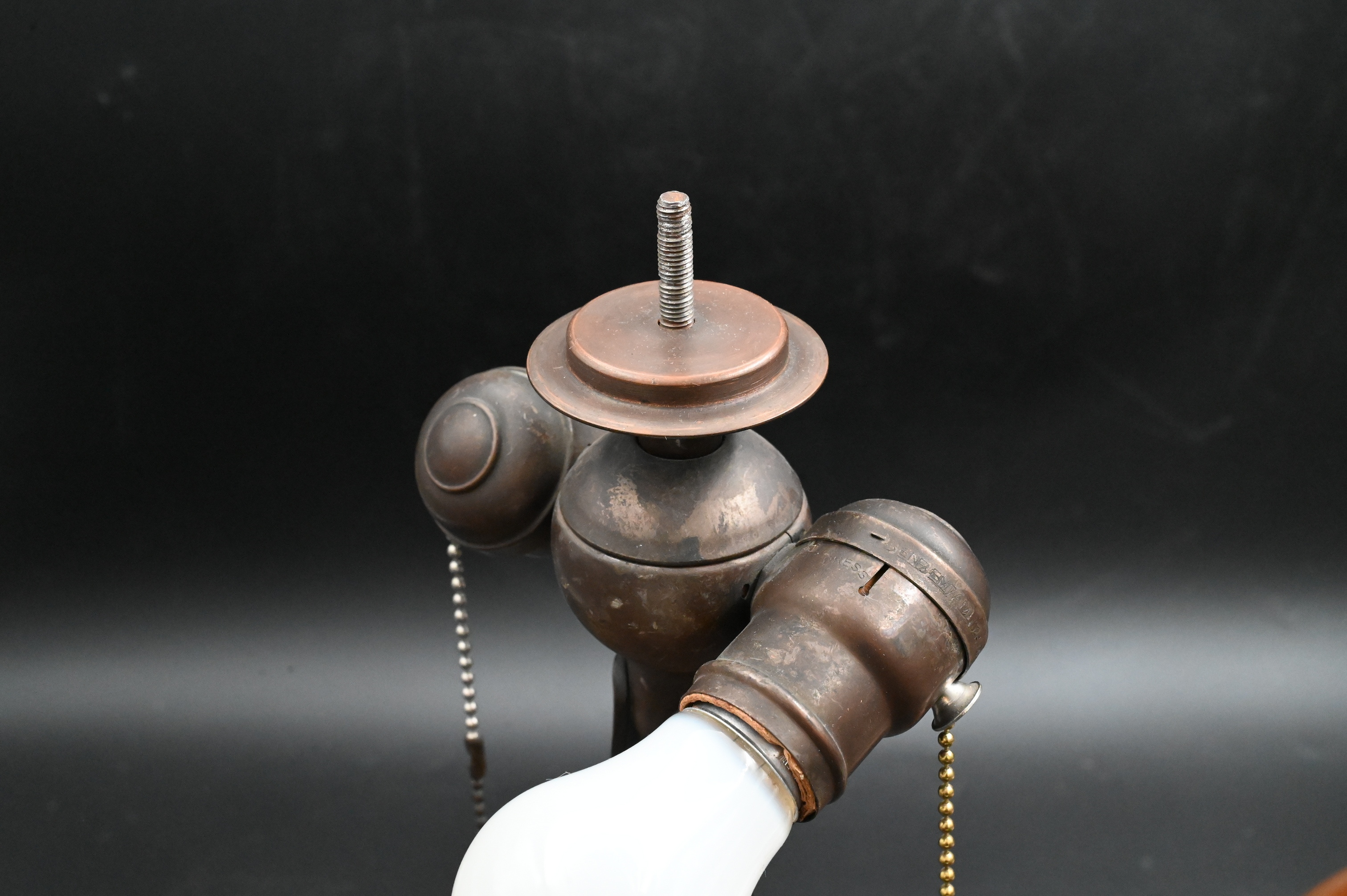 traces of blue and a geometric Egyptian motif in the band, shade rests on a three pronged hand-hammered copper base with triangular bottom plate, signed on base with Roycroft orb and cross mark, shade unmarked