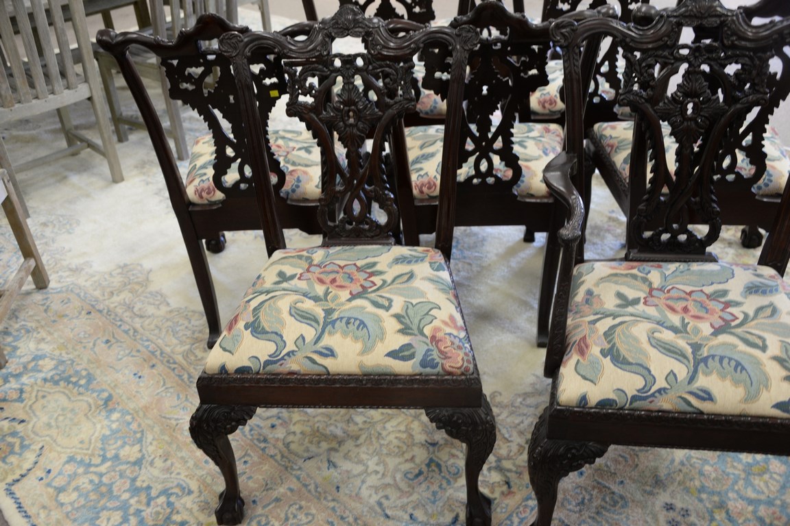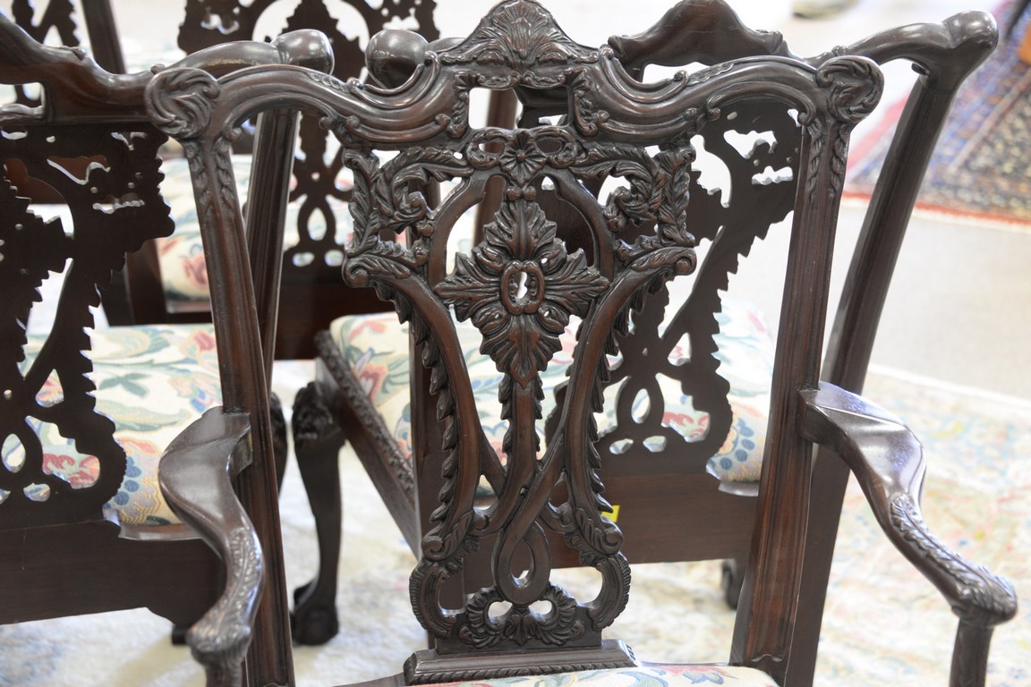 Set of eight mahogany Chippendale style dining chairs with ball and claw feet.