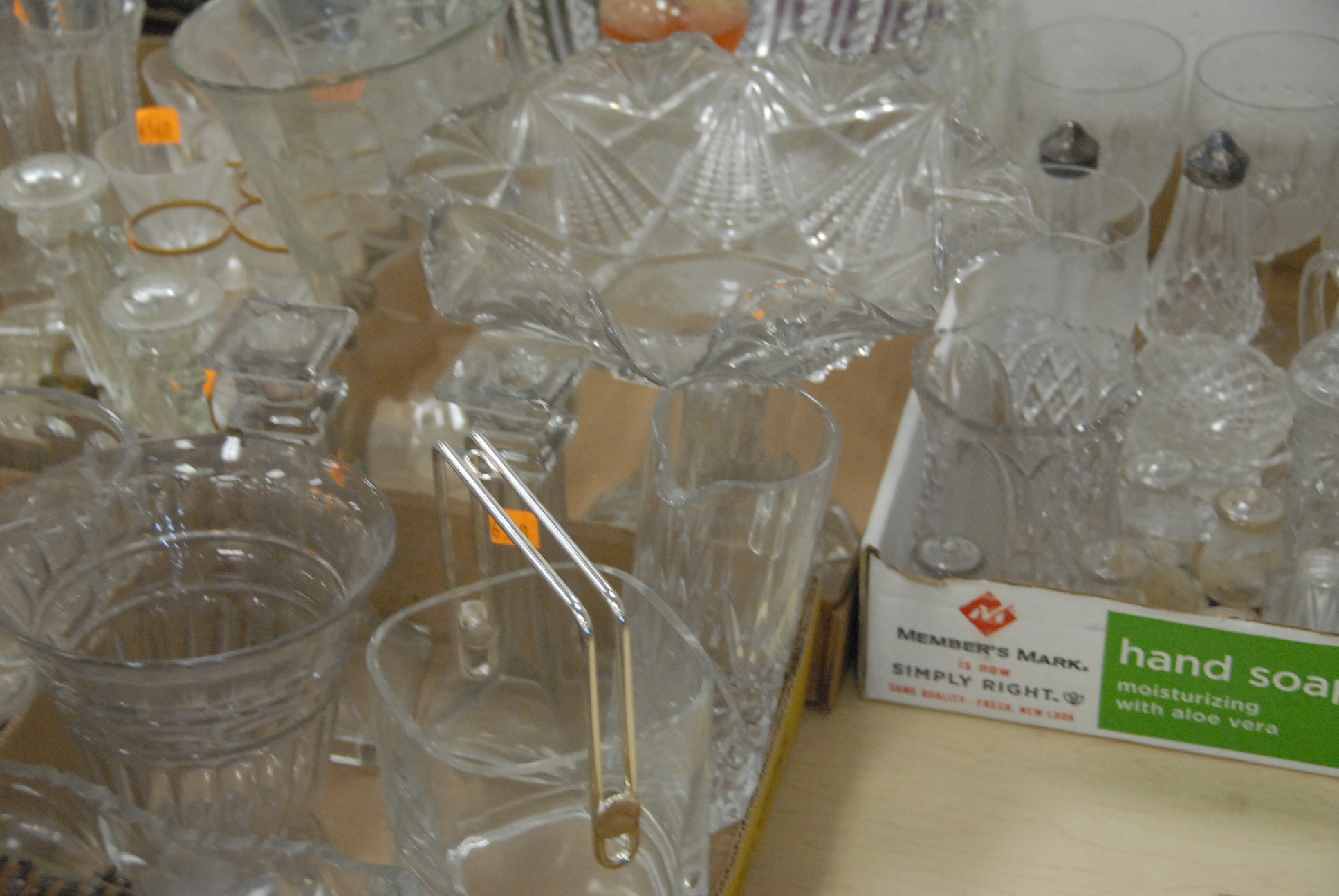 Seven box lots of pressed glass, pattern glass goblets and stems, cut glass, and sandwich glass compotes and whale oil lamp.