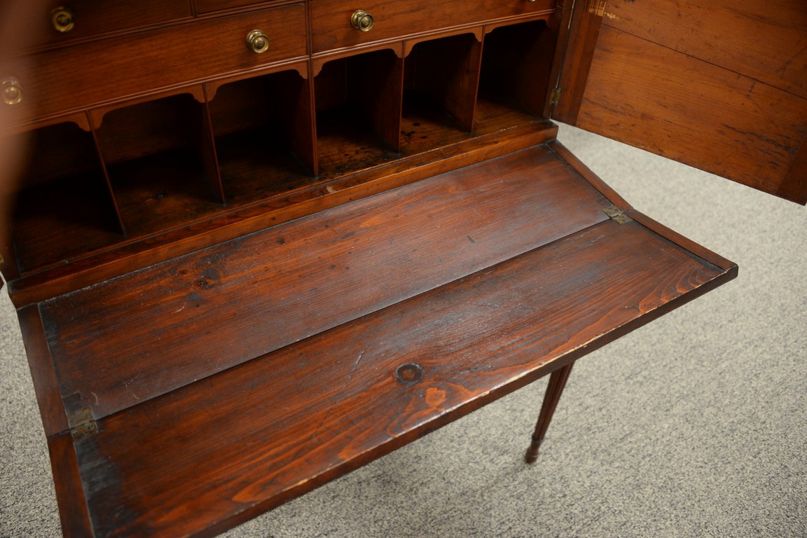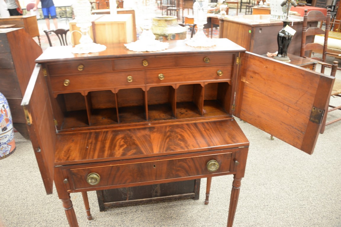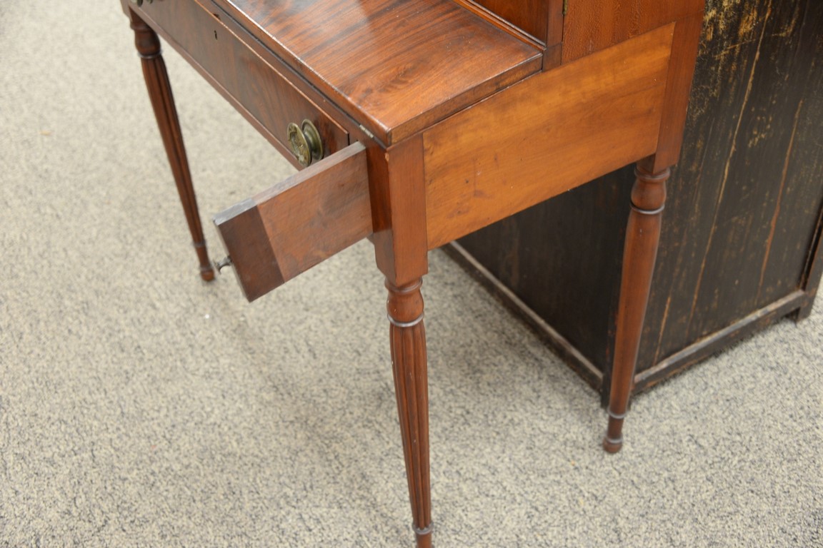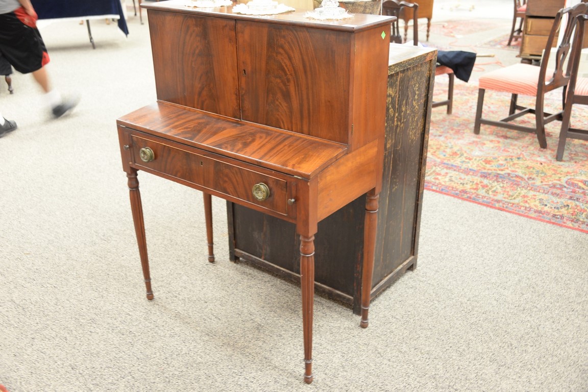 Lot 139: Sheraton mahogany secretary desk having two doors over flip lid writing surface over one drawer set on fluted and turned legs, circa…