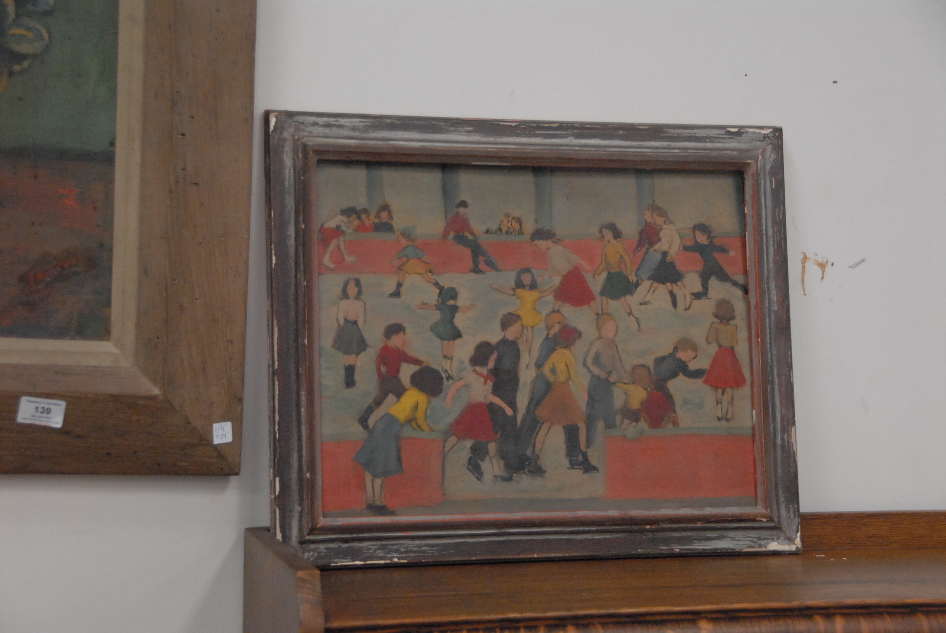 Six framed oil paintings including one still life signed Hellman, four signed indistinctly and one oil on board signed Jeptha Madison Indoor Skating, 10 x 7 1/2 to 31 x 26.