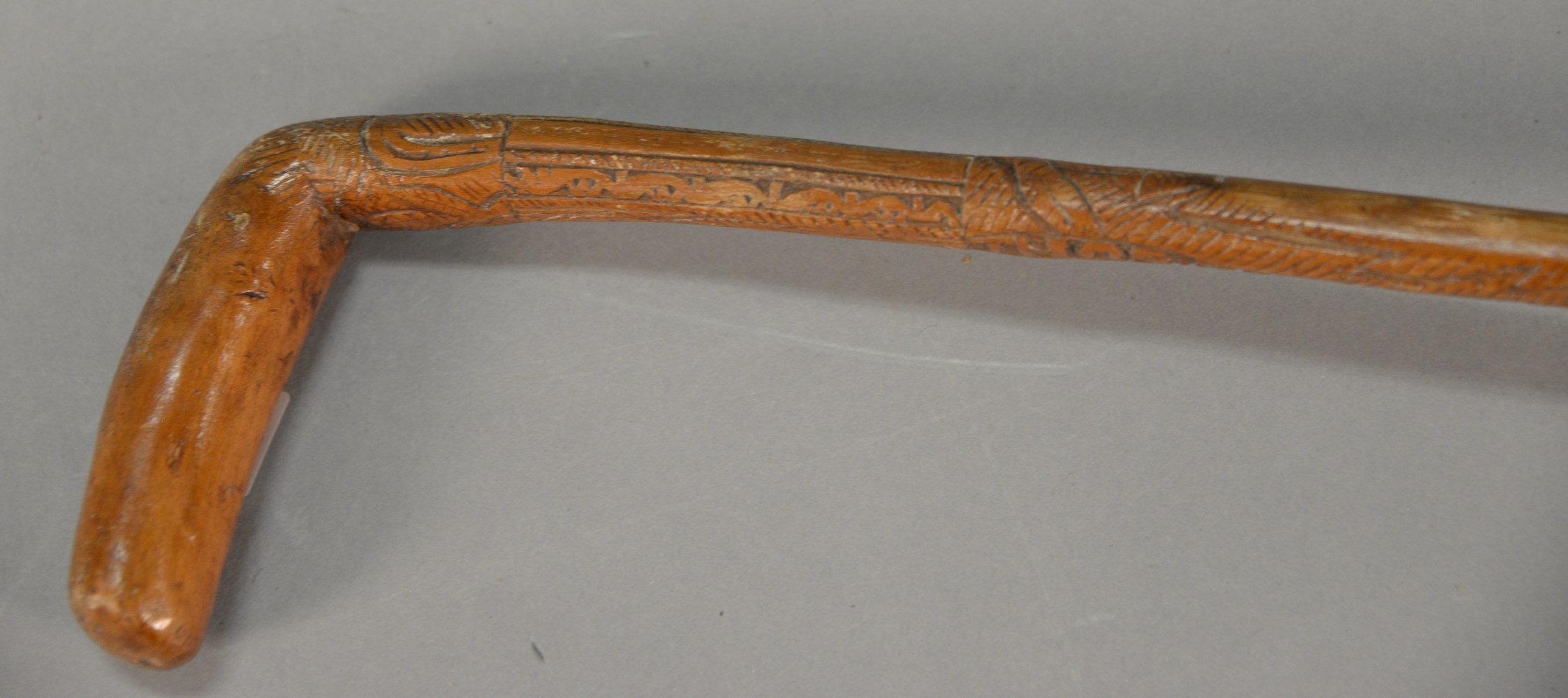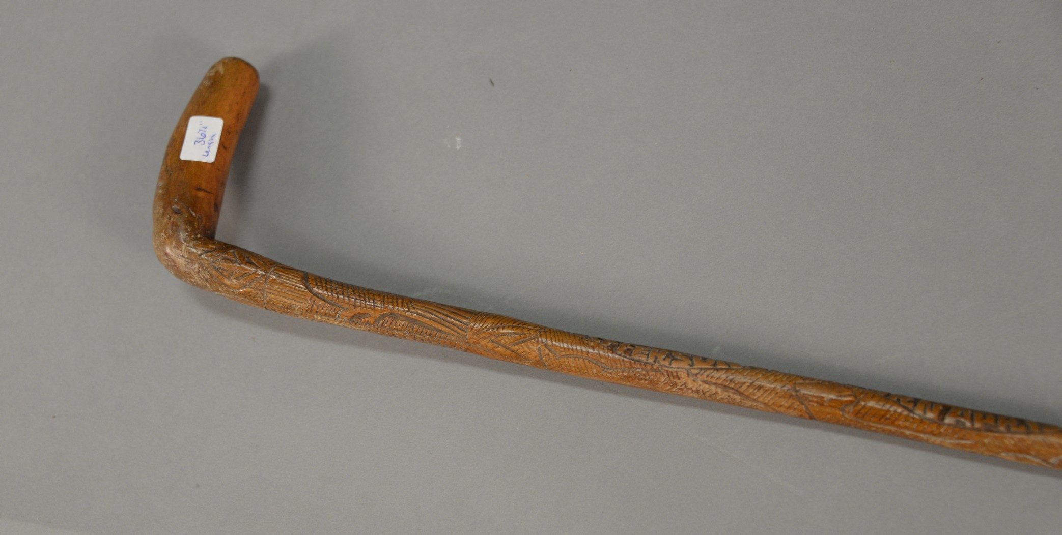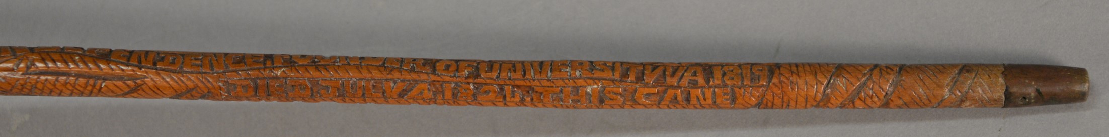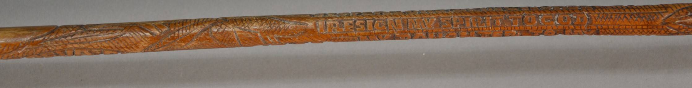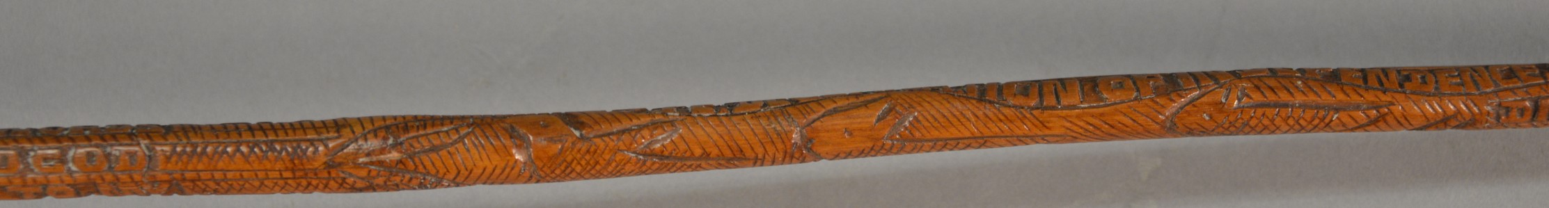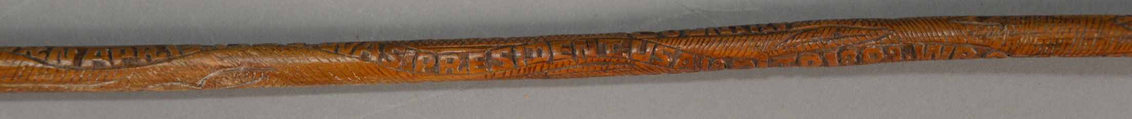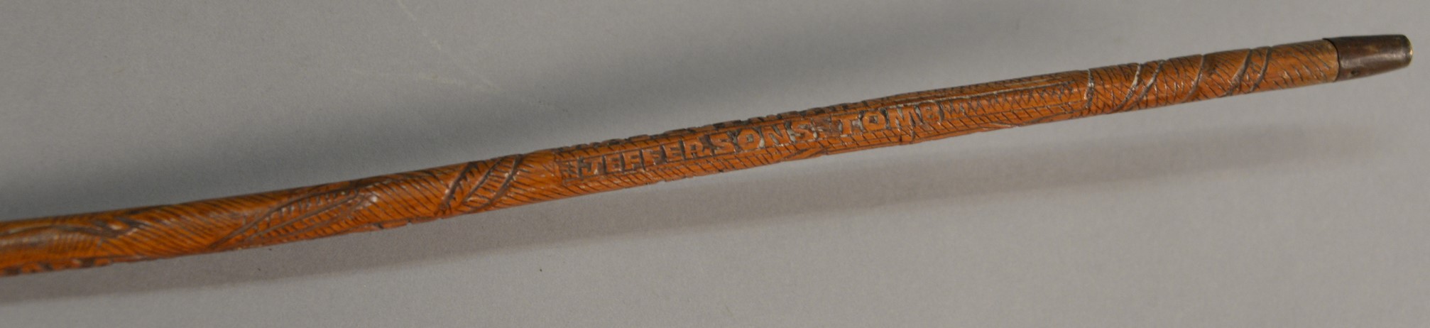 Thomas Jefferson Memorial Folk Art hand carved L shaped cane attributed to Craddock. Carved on cane: Thos. Jefferson, of Va. Born Apr. 13. 1743 was president USA 1801 to 1809. wrote declaration of independence, Founder of University VA. 1819, Jefferson’s dying words I resign my spirit to God, my daughter, to my country, and Died July 4 1821. This cane was cut near Jeffersons tomb. lg. 36 1/2 in.