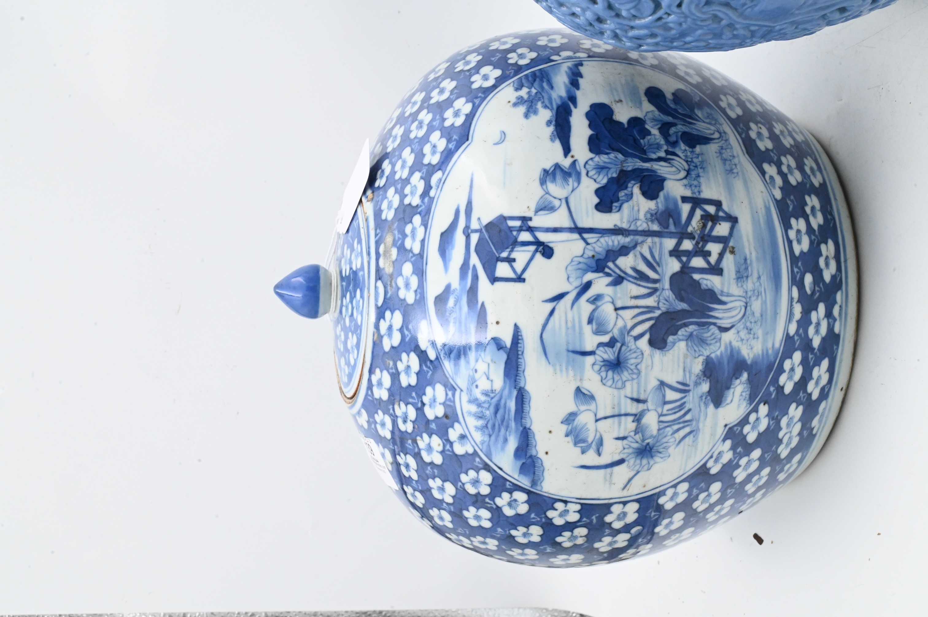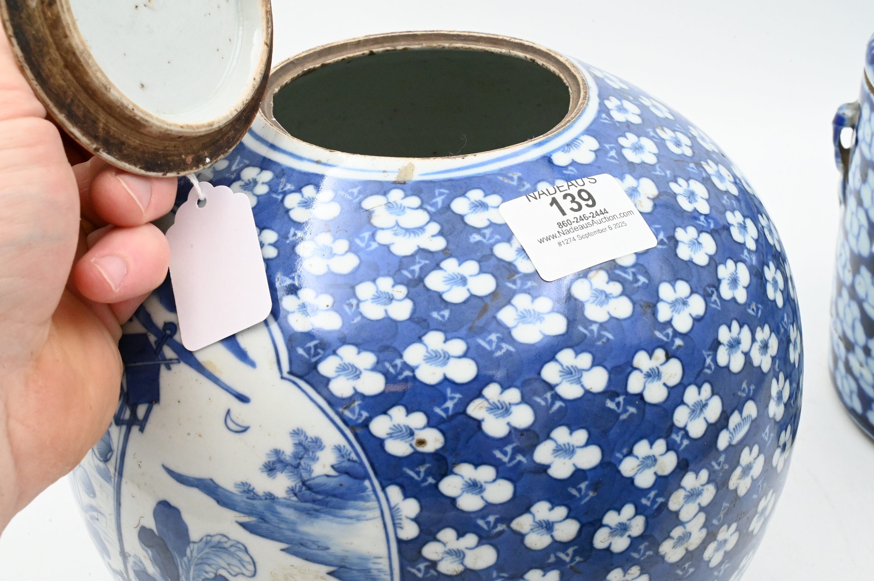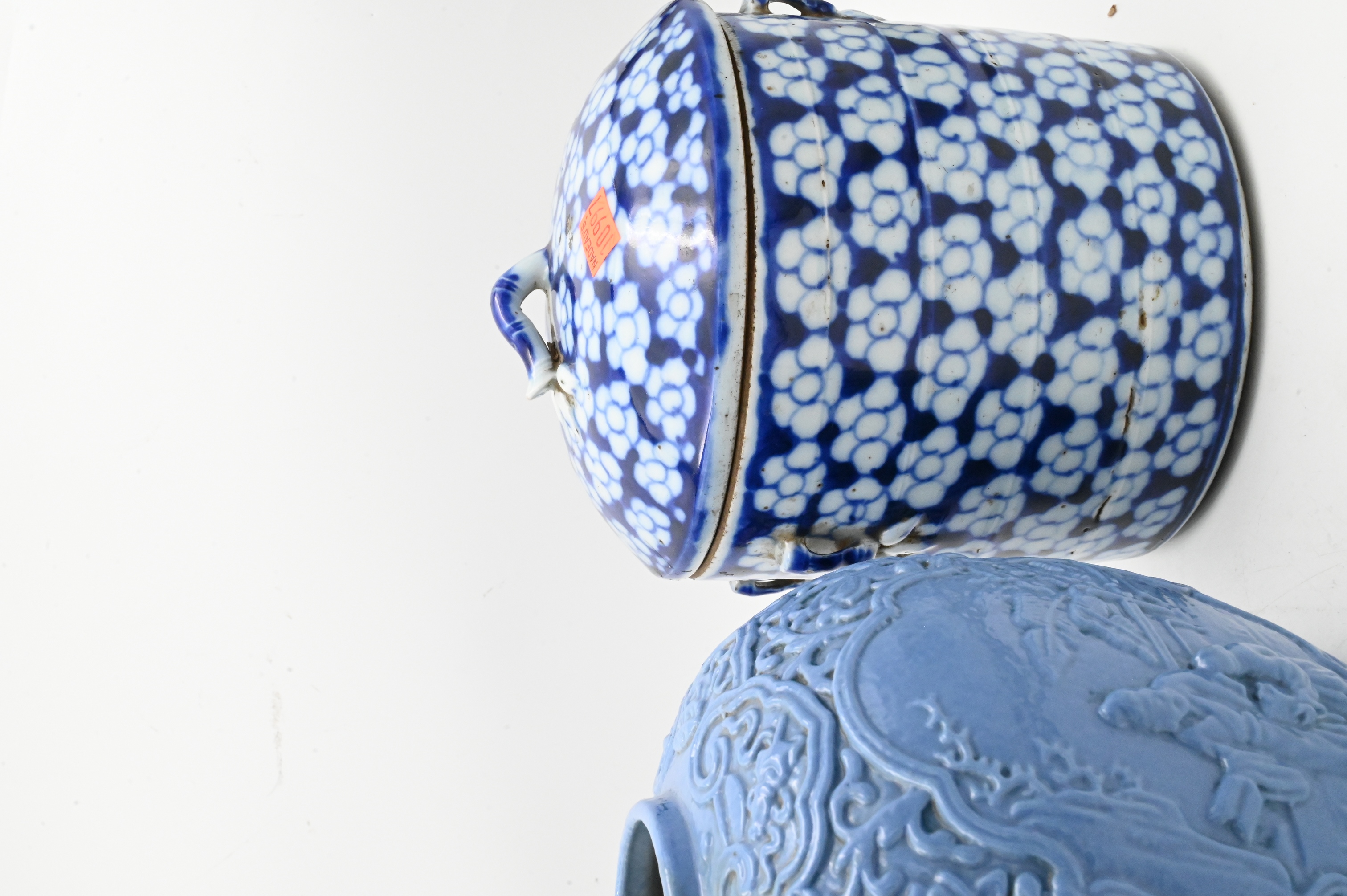 covered plum blossom jar with bamboo handles, round jar with blossom motif and cartouches having pond landscape, remnants of brown wax seal to underside along with Clair-de-lune periwinkle incised jar