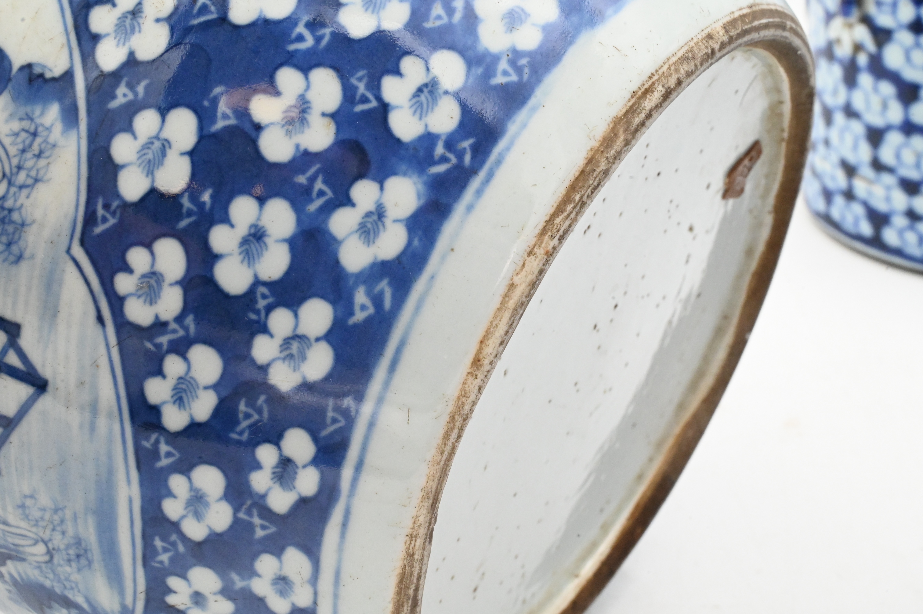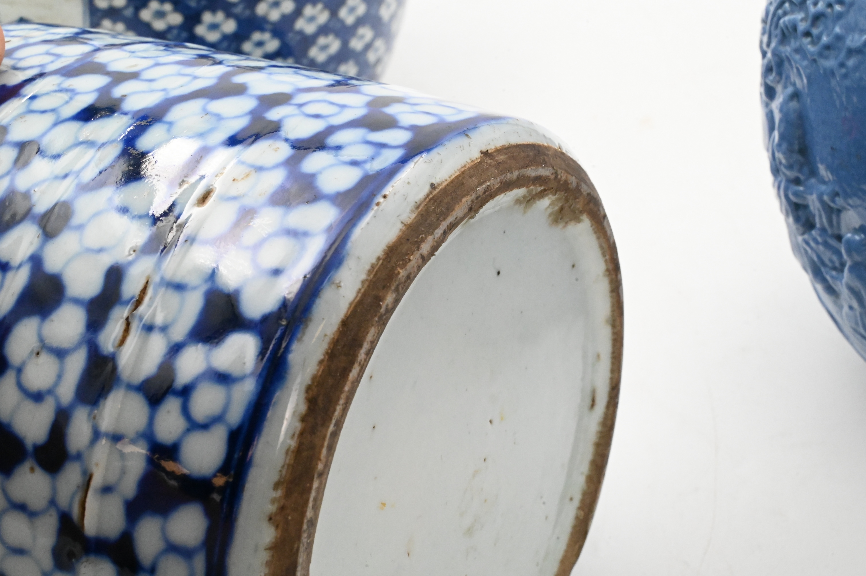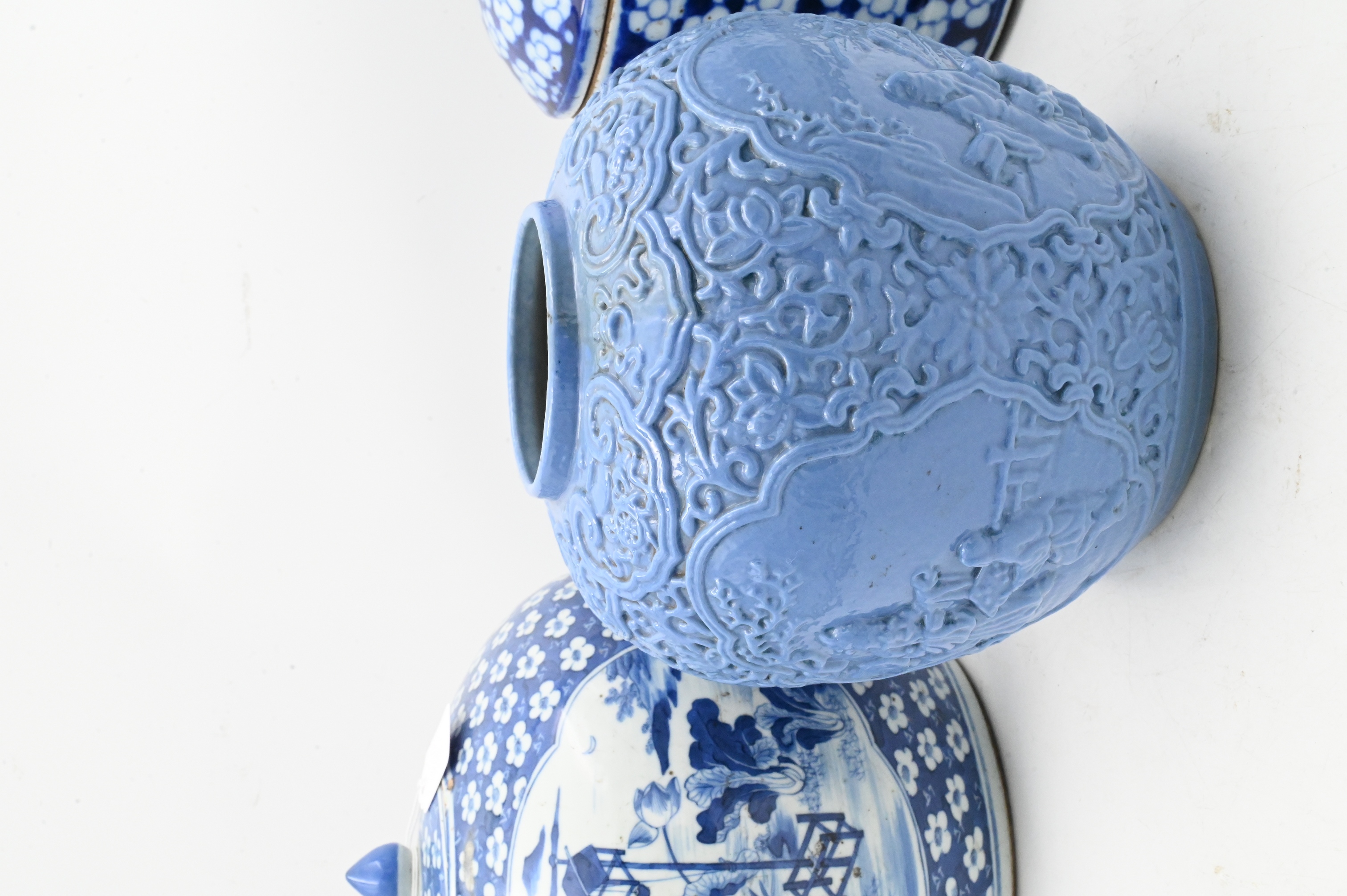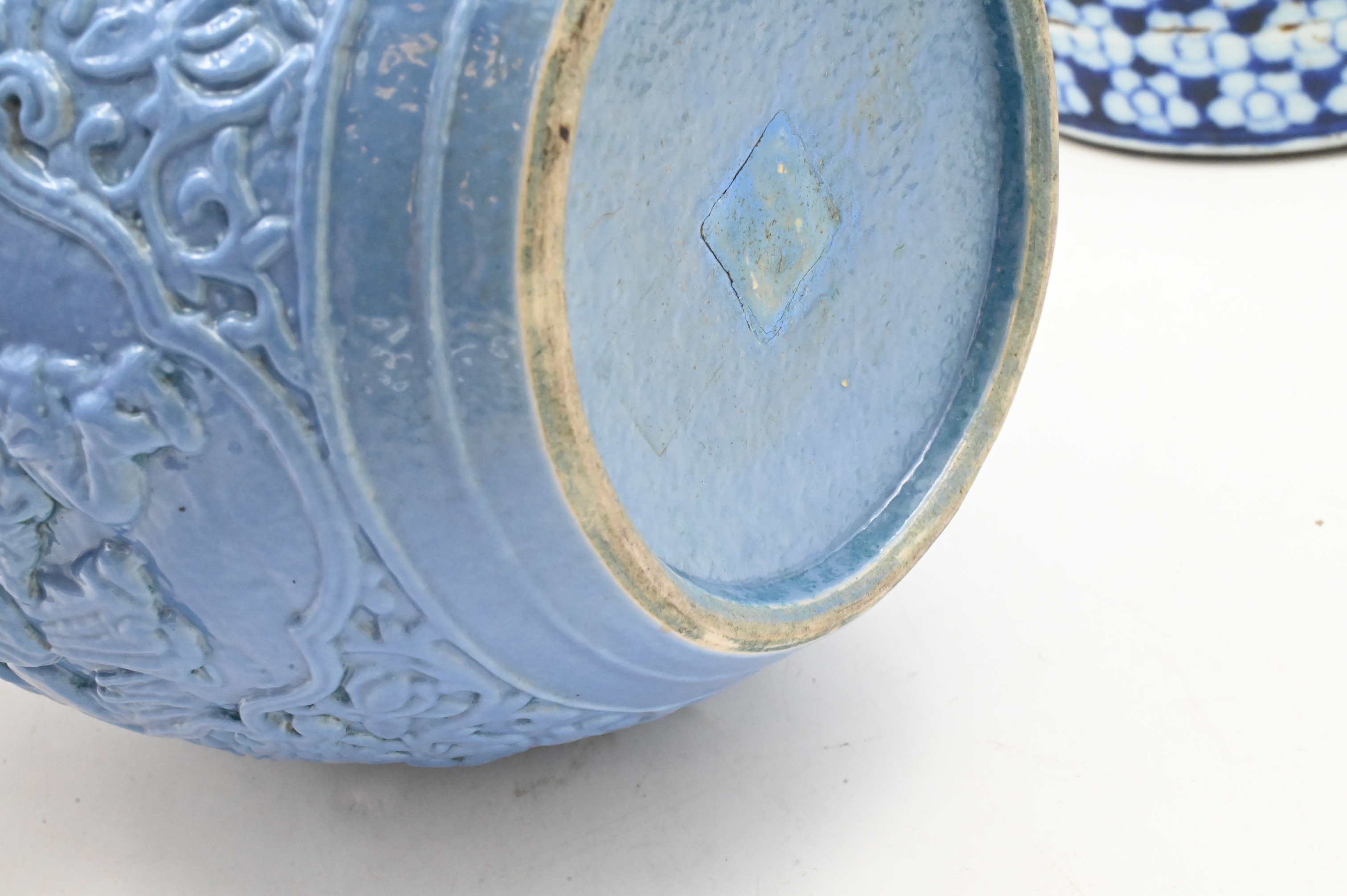 covered plum blossom jar with bamboo handles, round jar with blossom motif and cartouches having pond landscape, remnants of brown wax seal to underside along with Clair-de-lune periwinkle incised jar