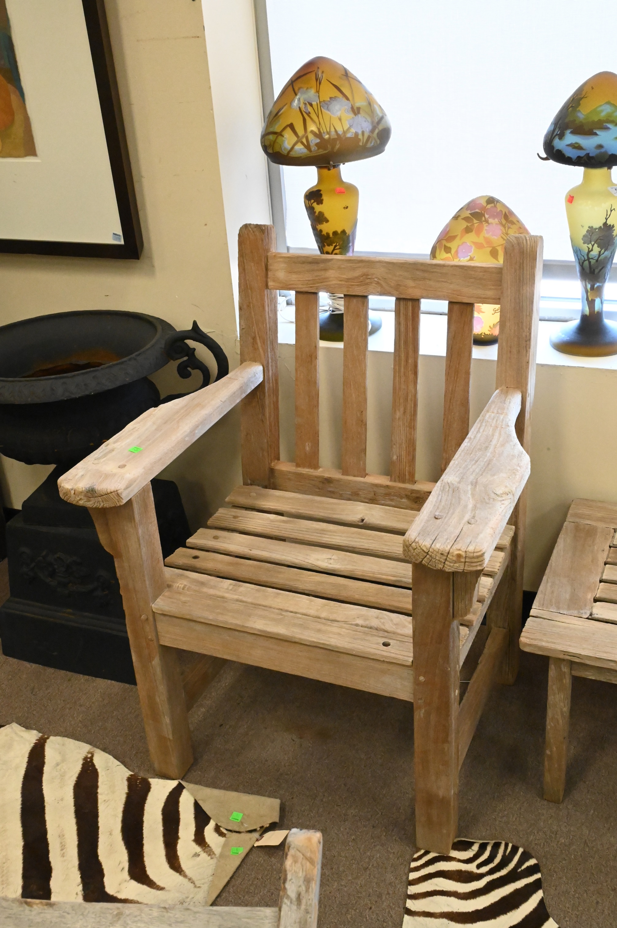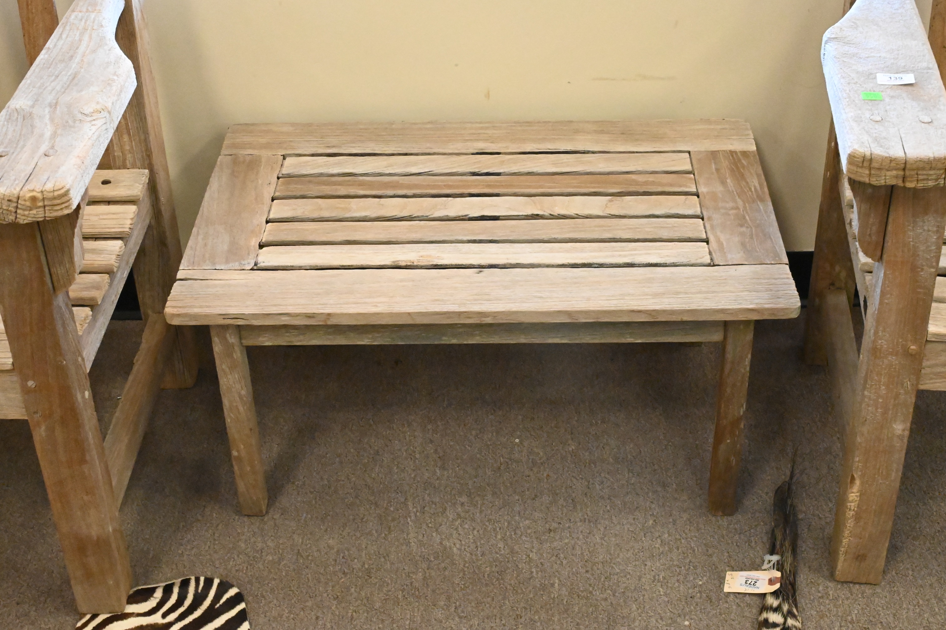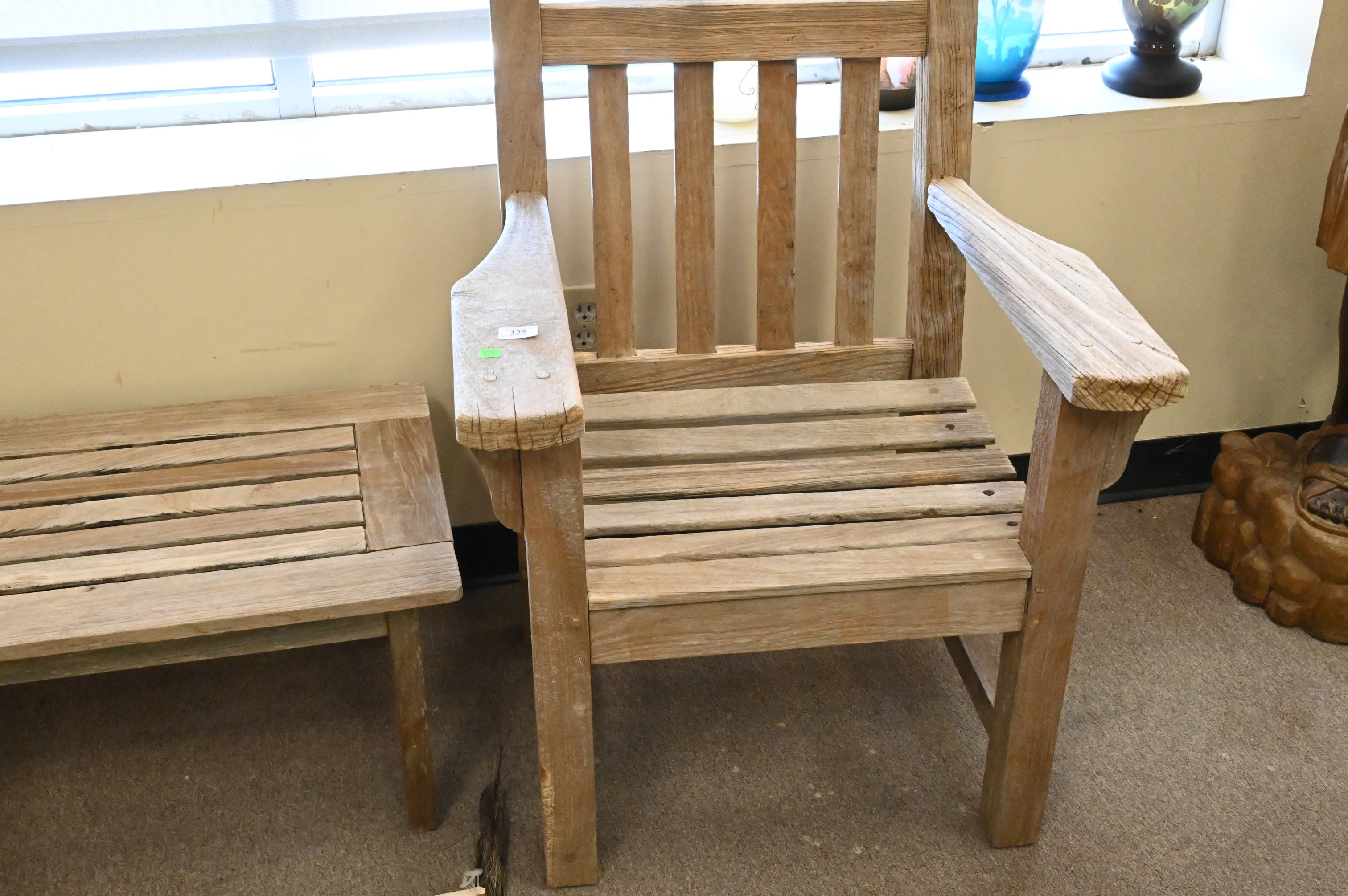 Three Piece Barlow Tyrie Outdoor Teak Lot, to include a pair of armchairs along with a side table, all marked Barlow Tyrie, chair height 35 inches, width 23 inches.