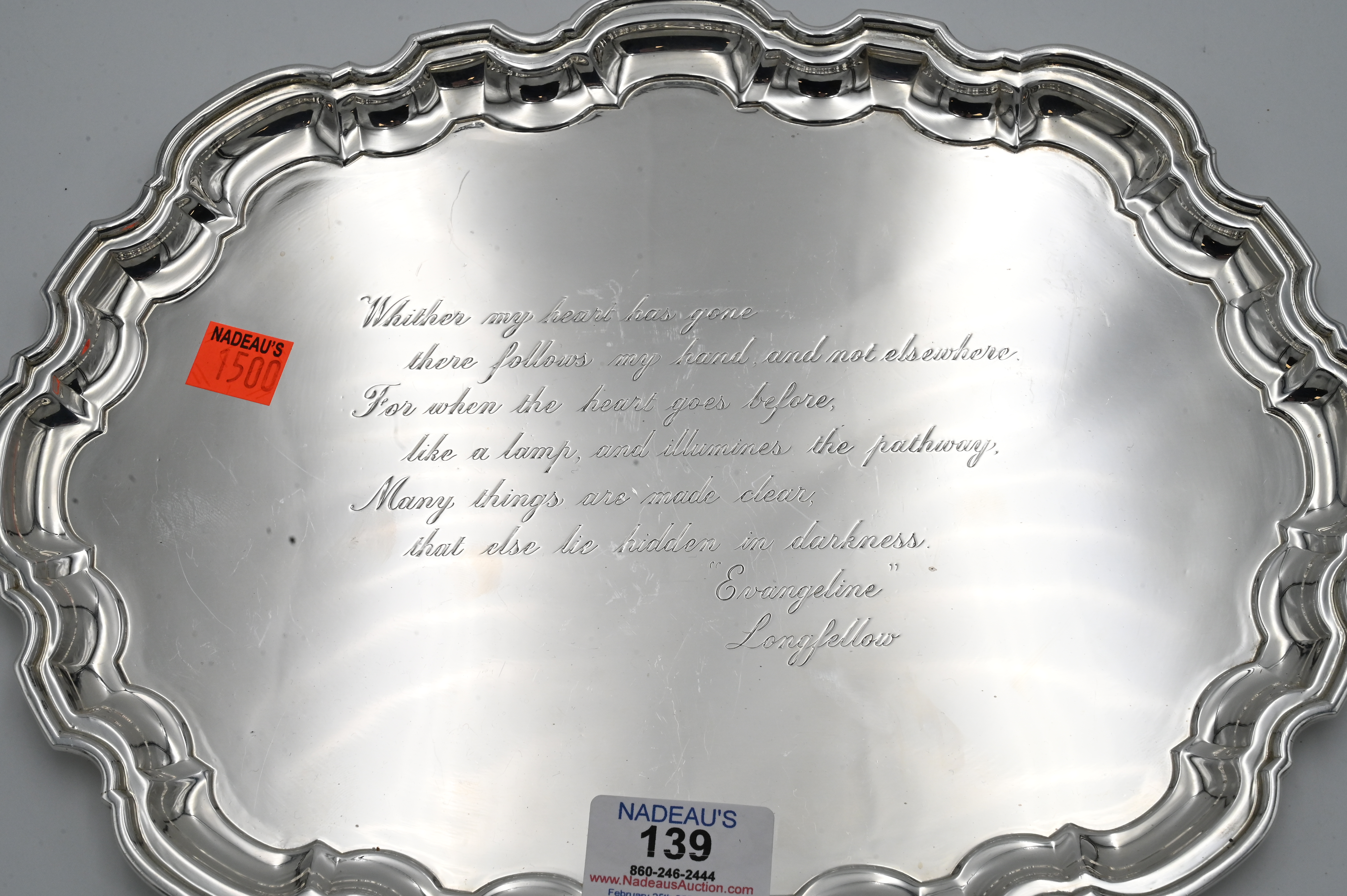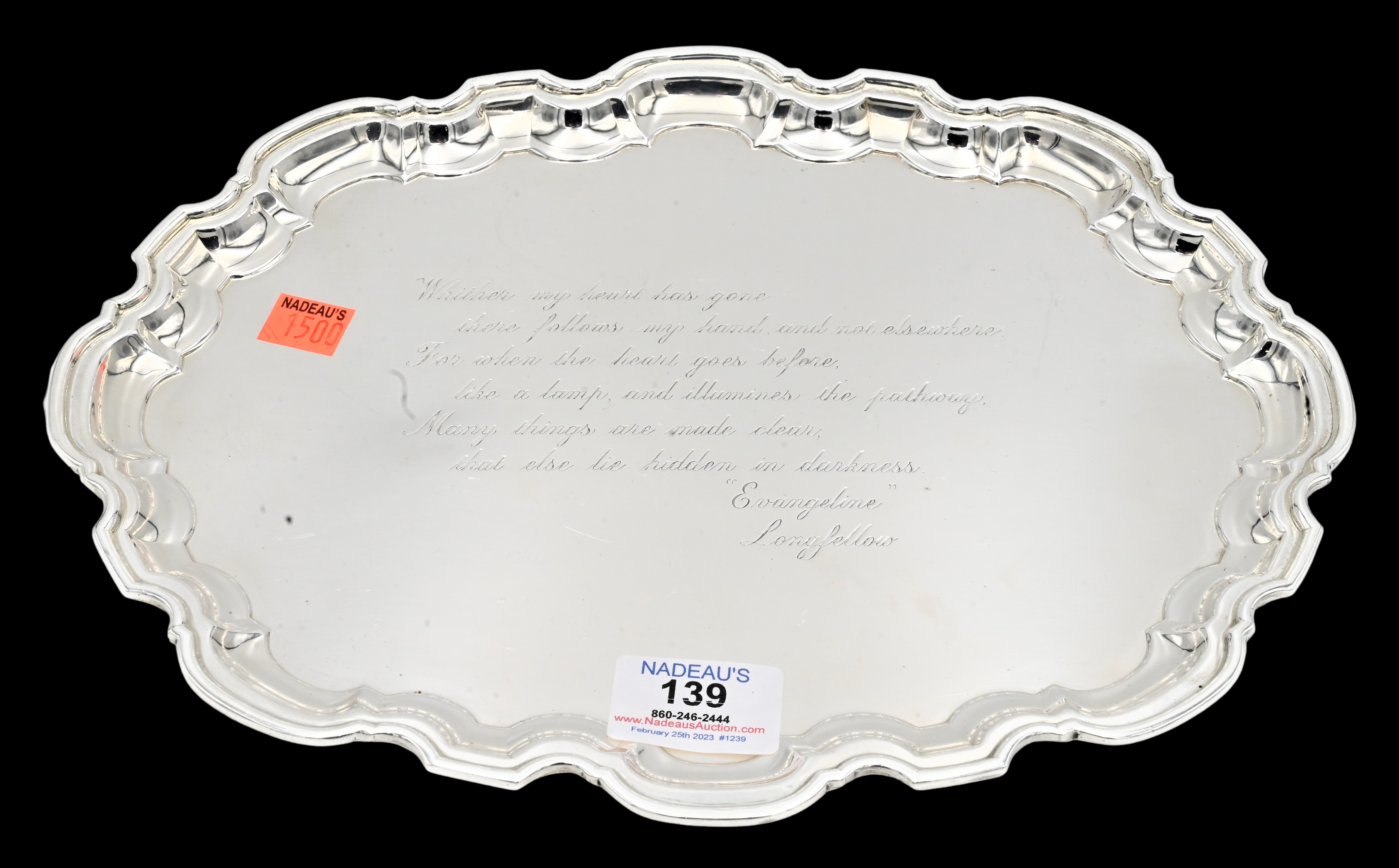 Tiffany & Company Sterling Silver Oval Tray, having Chippendale rim, top surface engraved with a stanza from Longfellow, length 12 1/4 inches, 18.0 t.oz.