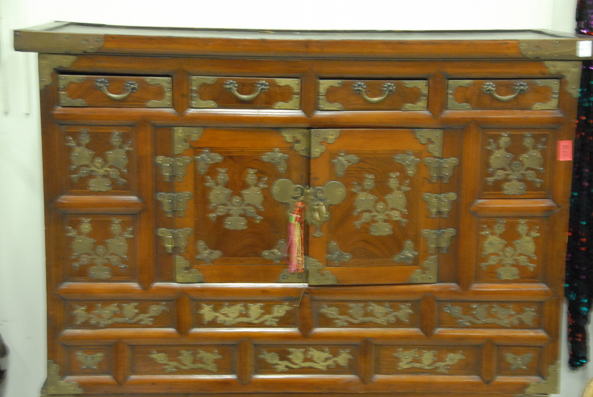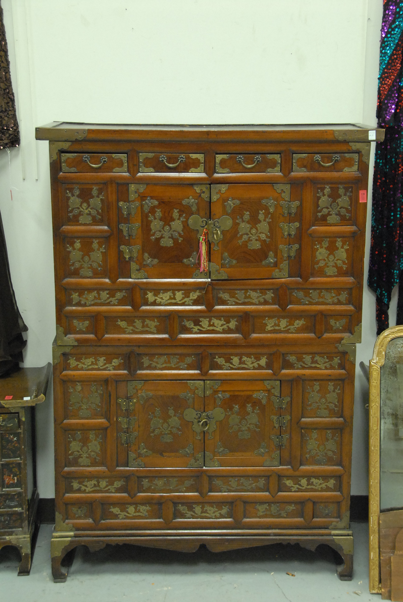 Lot 139: Two-part Japanese cabinet with brass mounts and brass decoration, inside cupboard with Japanese paper, ht. 55 1/2in. wd. 39in., pro…