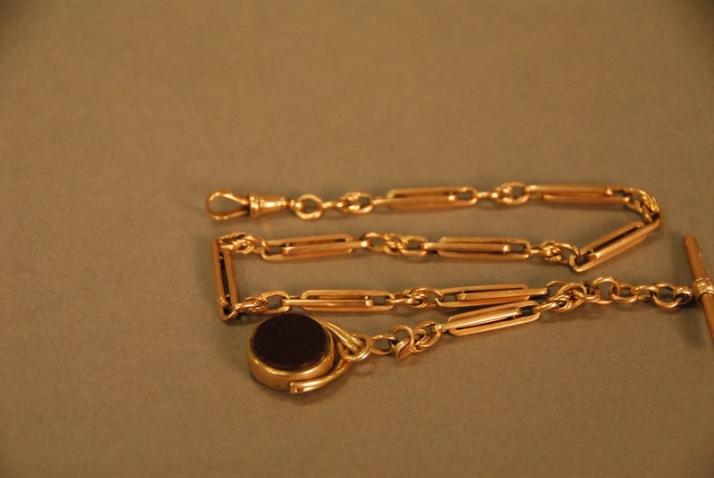 9K gold watch chain, English. total weight with fob. 32 grams lg. 13in.