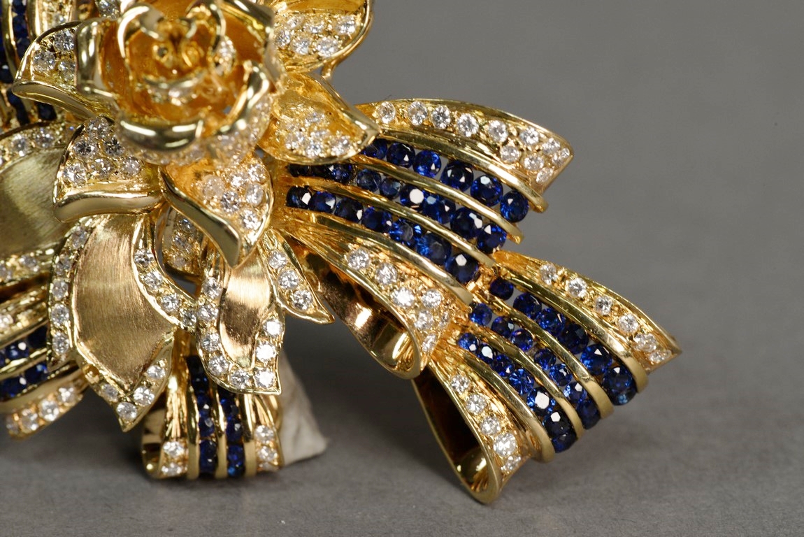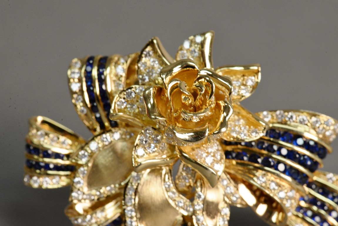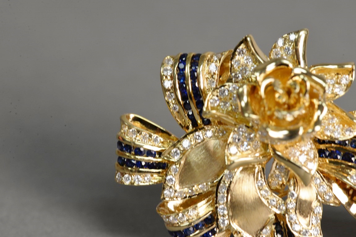 Lot 14: Channel and pave’ set sapphire and diamond pin with a flower and ribbon motif in 18K stamped yellow gold. The pin centers a flower…