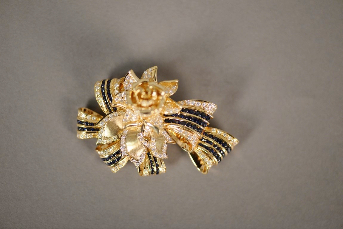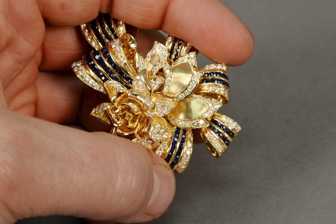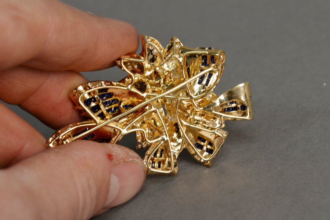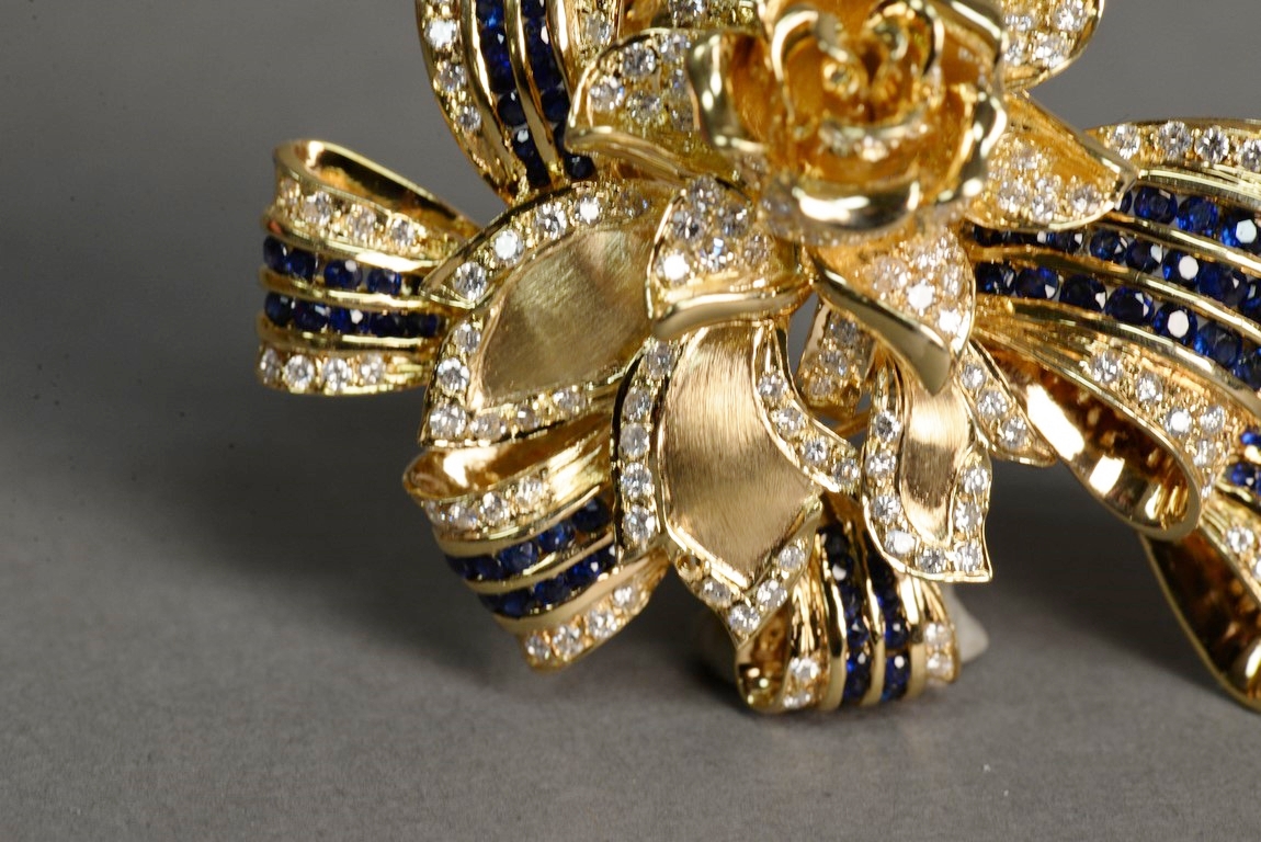 Lot 14: Channel and pave’ set sapphire and diamond pin with a flower and ribbon motif in 18K stamped yellow gold. The pin centers a flower…