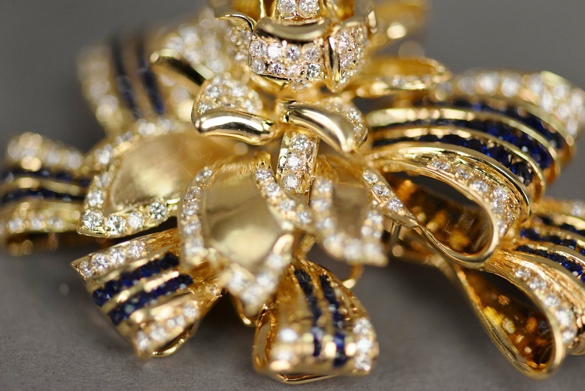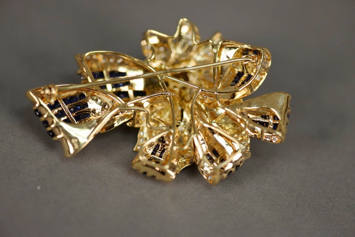 Channel and pave’ set sapphire and diamond pin with a flower and ribbon motif in 18K stamped yellow gold. The pin centers a flower with stem and leaves containing one hundred two 102 pave’ diamonds and six sections of ribbon containing a total of ninety-four 94 channel set round faceted sapphires and sixty 60 diamonds. The pin measures approximately 2 3/48 x 1 5/8 and weighs 42.7 grams, including stones. Total estimated sapphire weight – 4.65 carats. Total estimated diamond weight – 2.40 carats, color G-H, clarity SI.