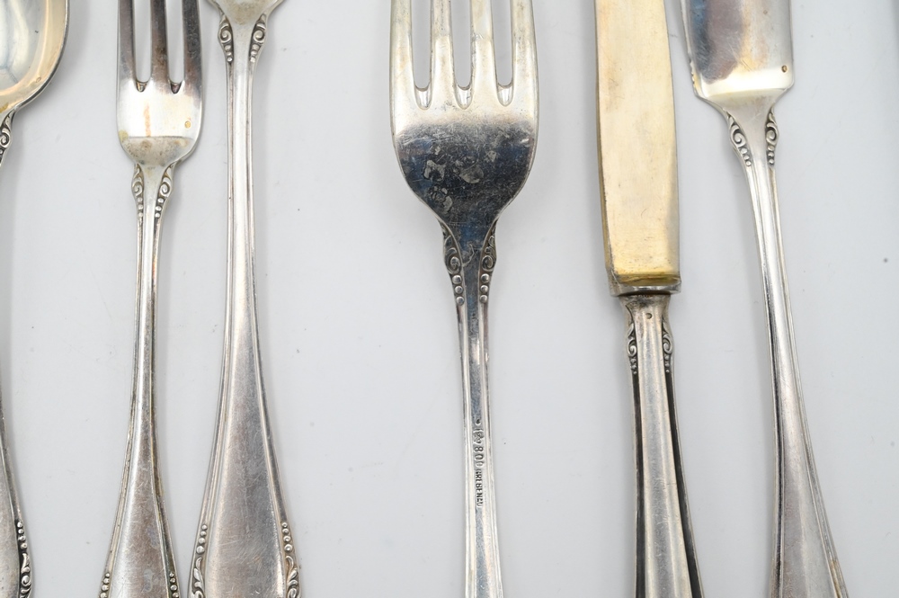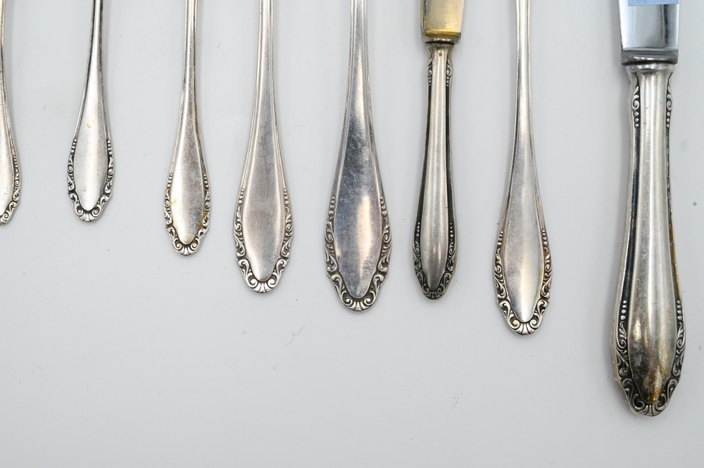 Continental Silver Flatware Setting, 74 pieces to include 6 dinner forks, 6 salad forks, 6 cocktail forks, 6 olive forks, 1 large olive fork, 6 place spoons, 5 teaspoons, 5 bouillon spoons, 4 demitasse spoons, 7 fish knives, 1 sugar spoon, 1 fish serving knife, 1 ladle, 1 serving spoon, 6 dinner knives, 6 luncheon knives, 6 small knives, length of larges 9 inches, 71.4 t.oz. plus 18 handles.