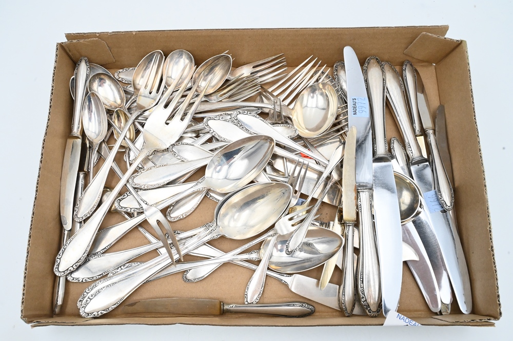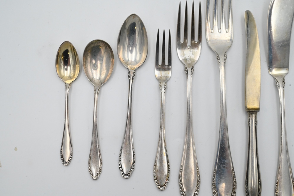 Lot 14: Continental Silver Flatware Setting, 74 pieces to include 6 dinner forks, 6 salad forks, 6 cocktail forks, 6 olive forks, 1 large olive fork, 6 place spoons, 5 teaspoons, 5 bouillon spoons, 4 demitasse spoons, 7 fish knives, 1 sugar spoon, 1 fish serving knife, 1 ladle, 1 serving spoon, 6 dinner knives, 6 luncheon knives, 6 small knives, length of larges 9 inches, 71.4 t.oz. plus 18 handles.