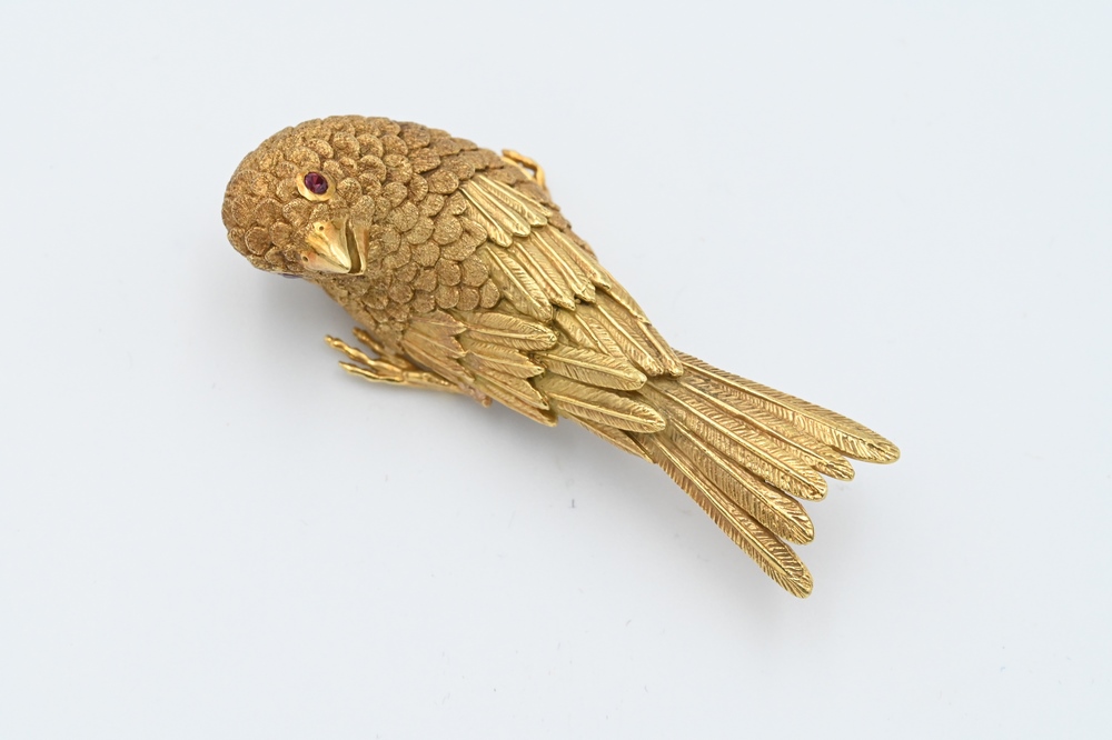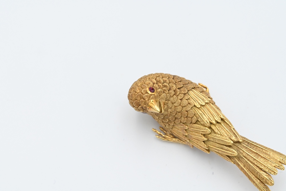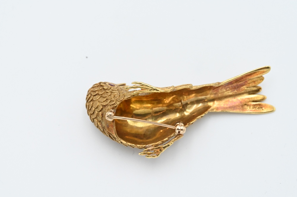 Lot 14: Erwin Pearl 18 Karat Gold Bird Brooch, having ruby eye, height 2 1/4 inches, 21.3 grams.