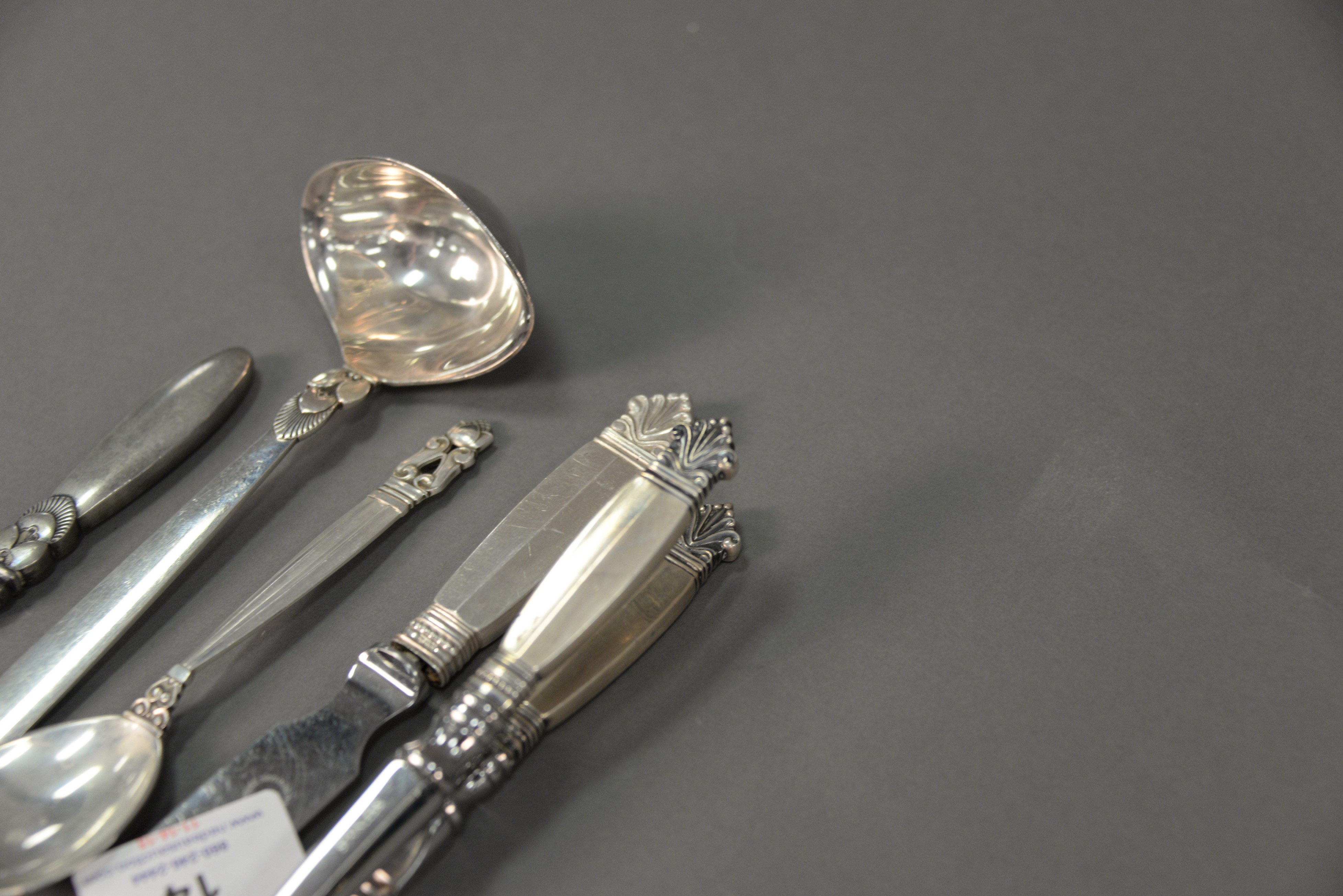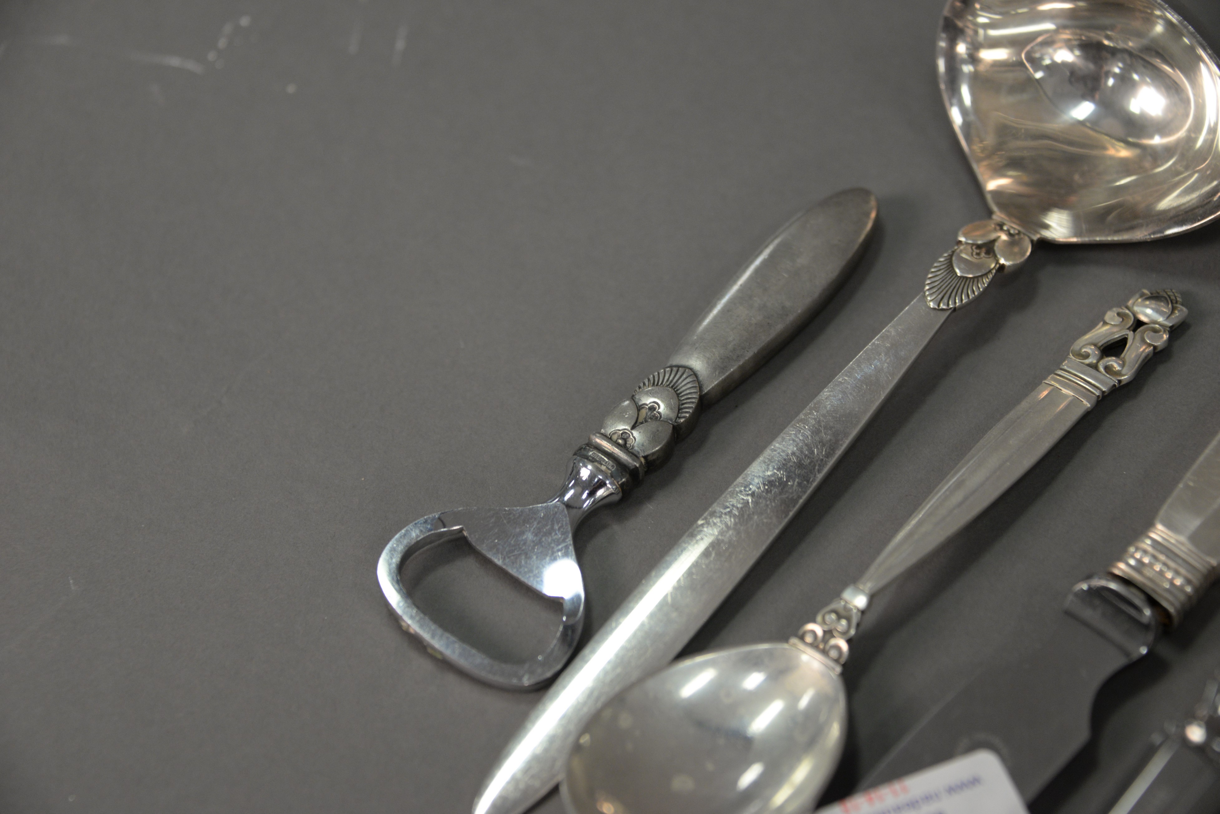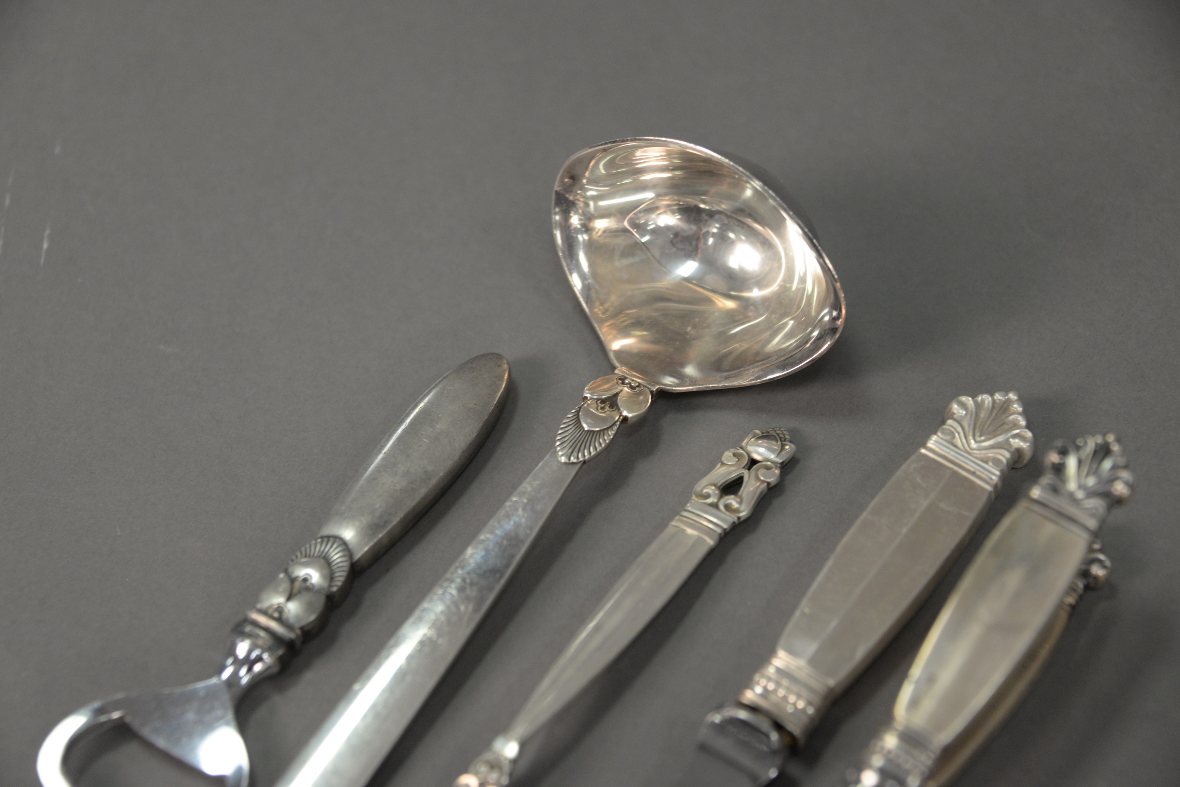 Lot 14: Five Georg Jensen pieces to include ladle, spoon, knife, bottle opener, and nut cracker. 3.30 weighable silver