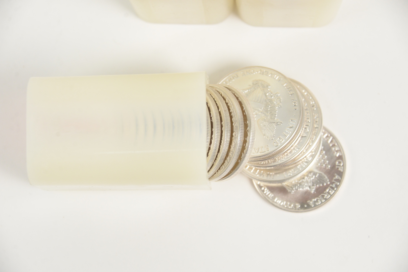 Lot 14: Five Rolls of Liberty Silver Eagles, one hundred 1987 coins total.