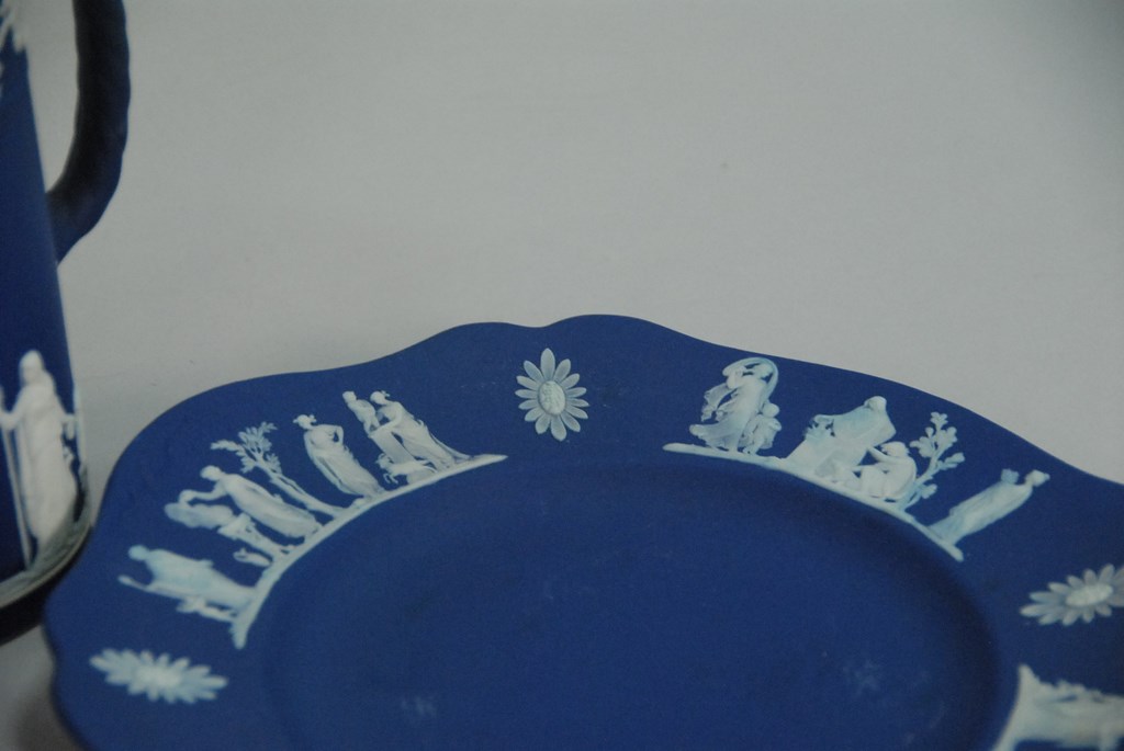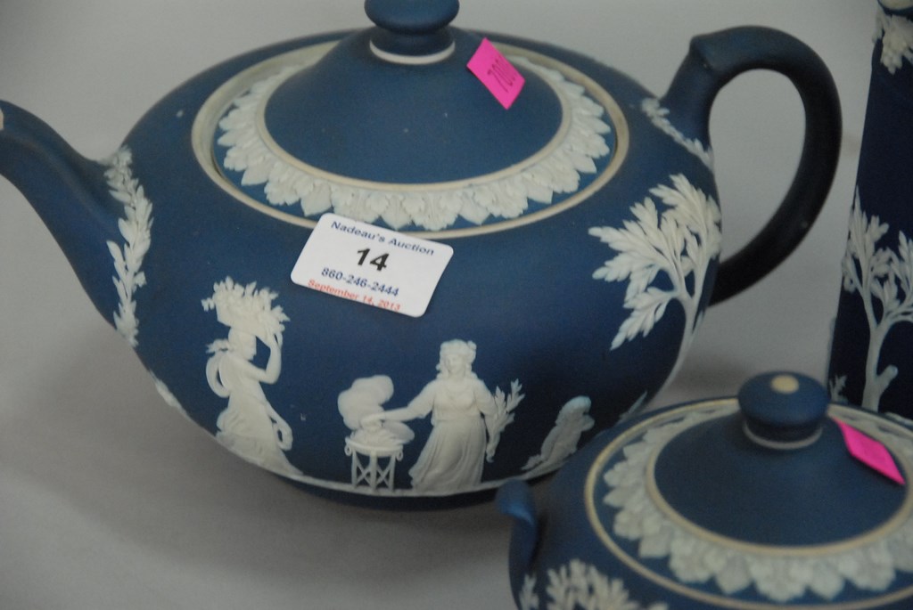 Lot 14: Four piece lot of blue Wedgwood minor flake on spout.
