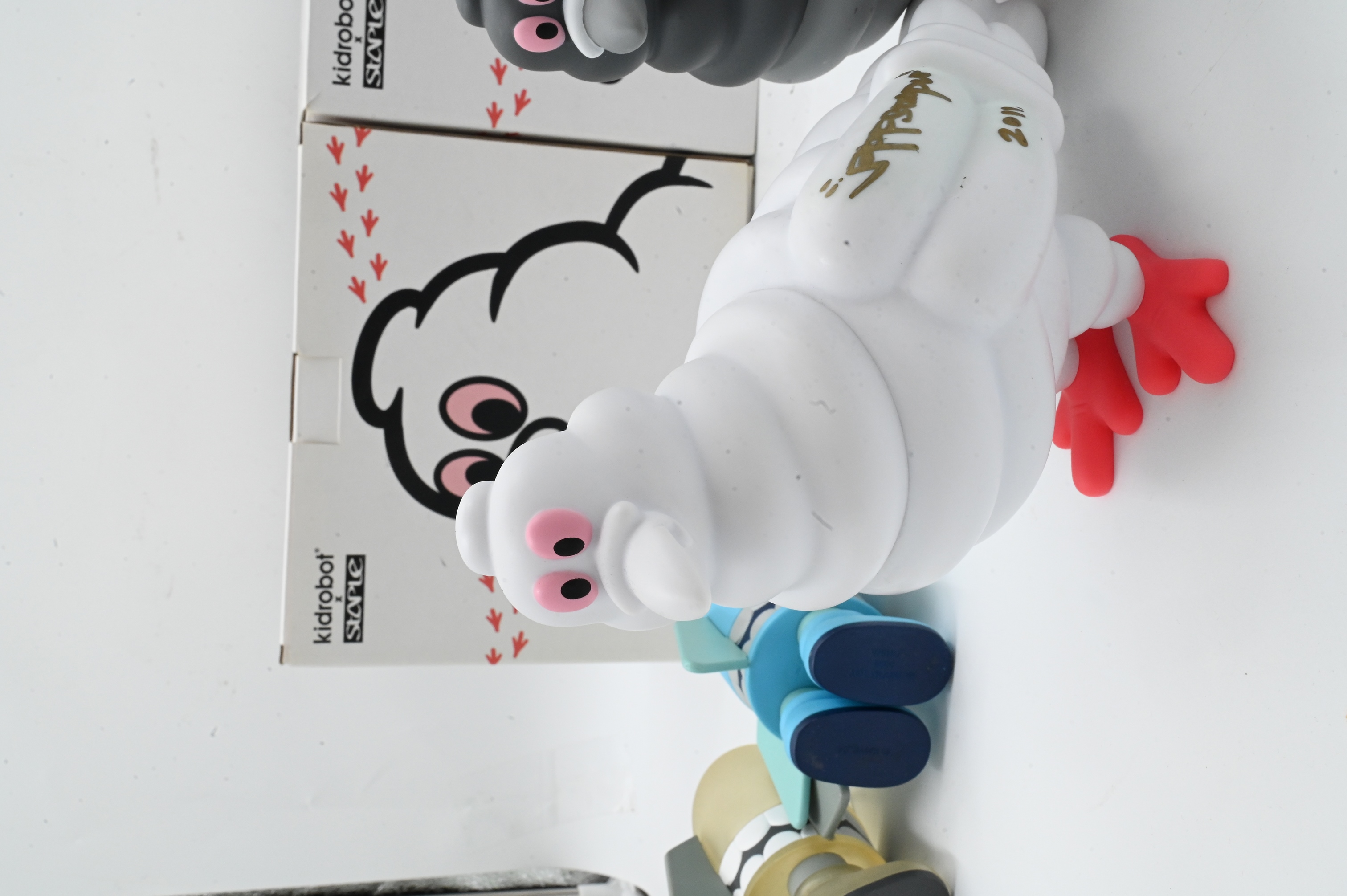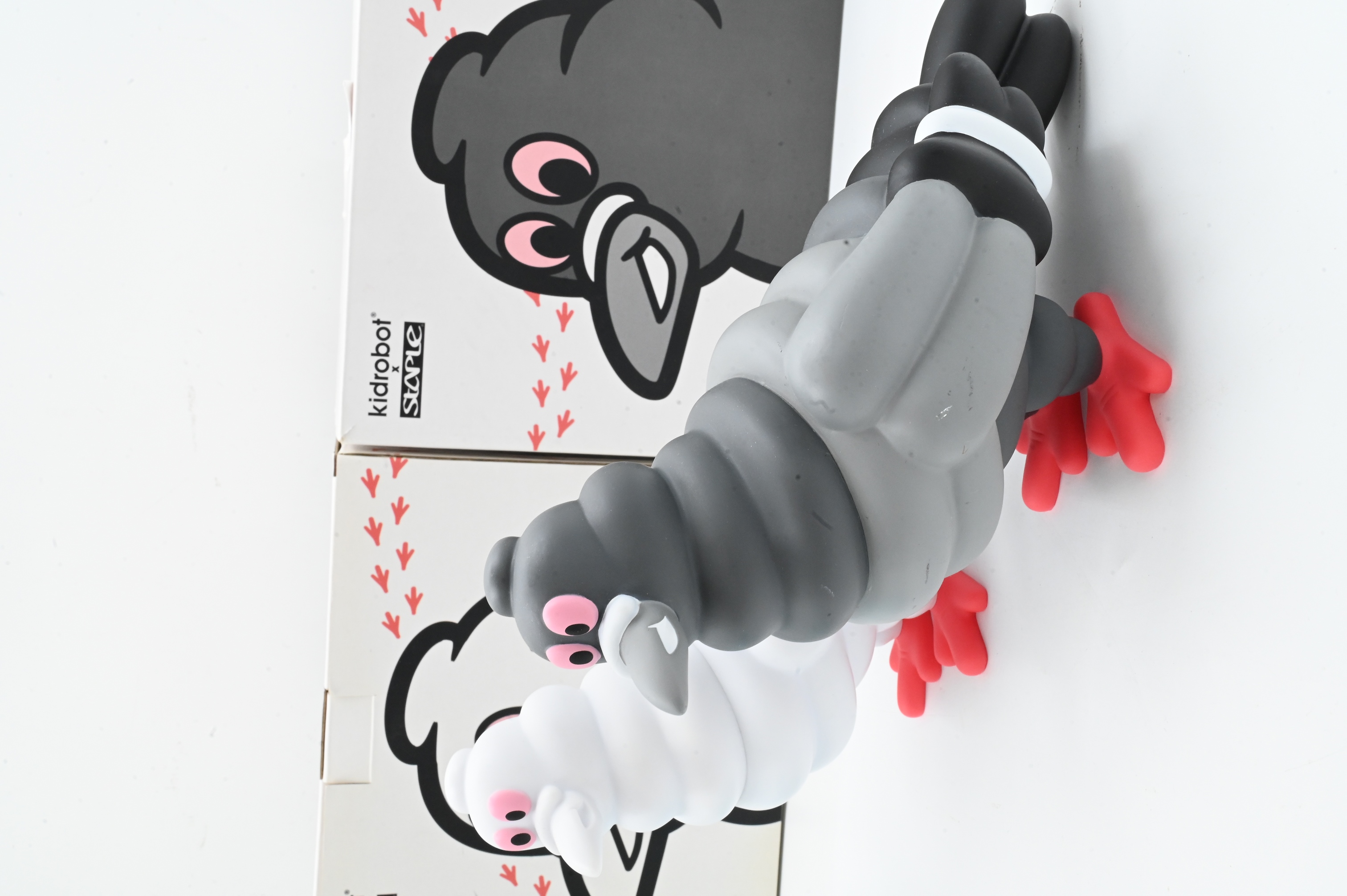 to include two Staple Pigeon Vinyl Toys, 2011, one grey and one white vinyl figures, edition of 800, almost new with original packaging,