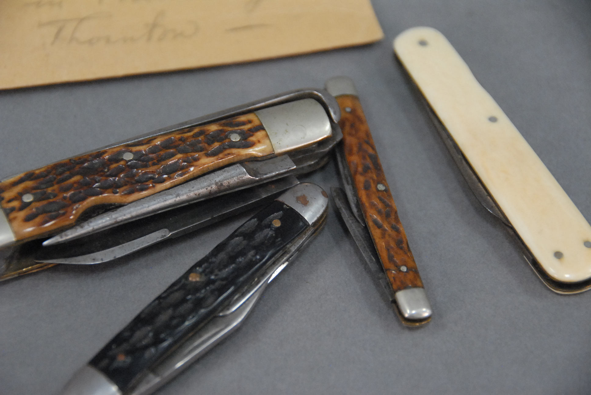 Group of jack-knives including one with old tag which states Knife carried in France by Thorton by G. Barnett Newark Provenance: Estate of Nancy Sachse, Hamden, Connecticut