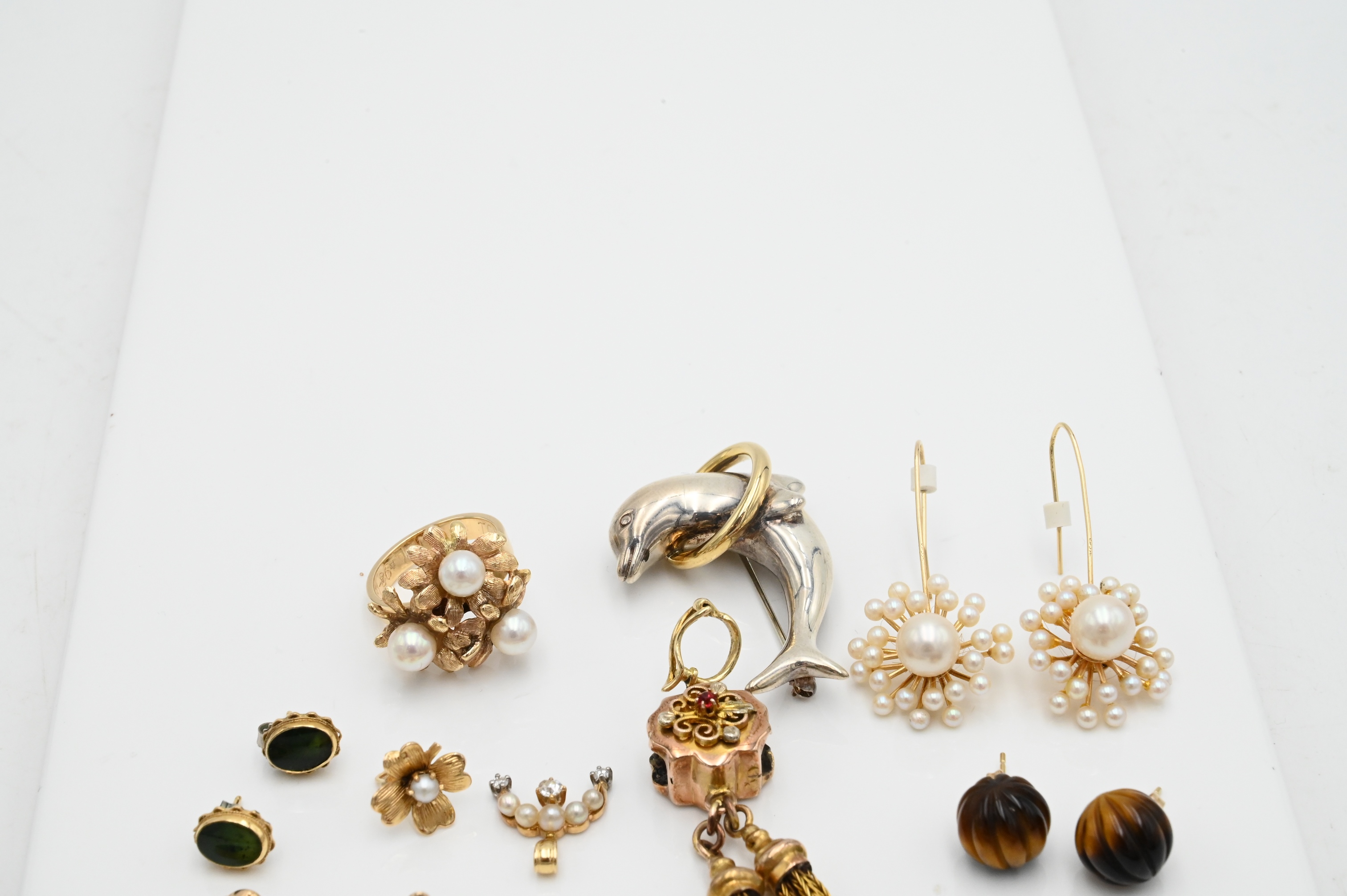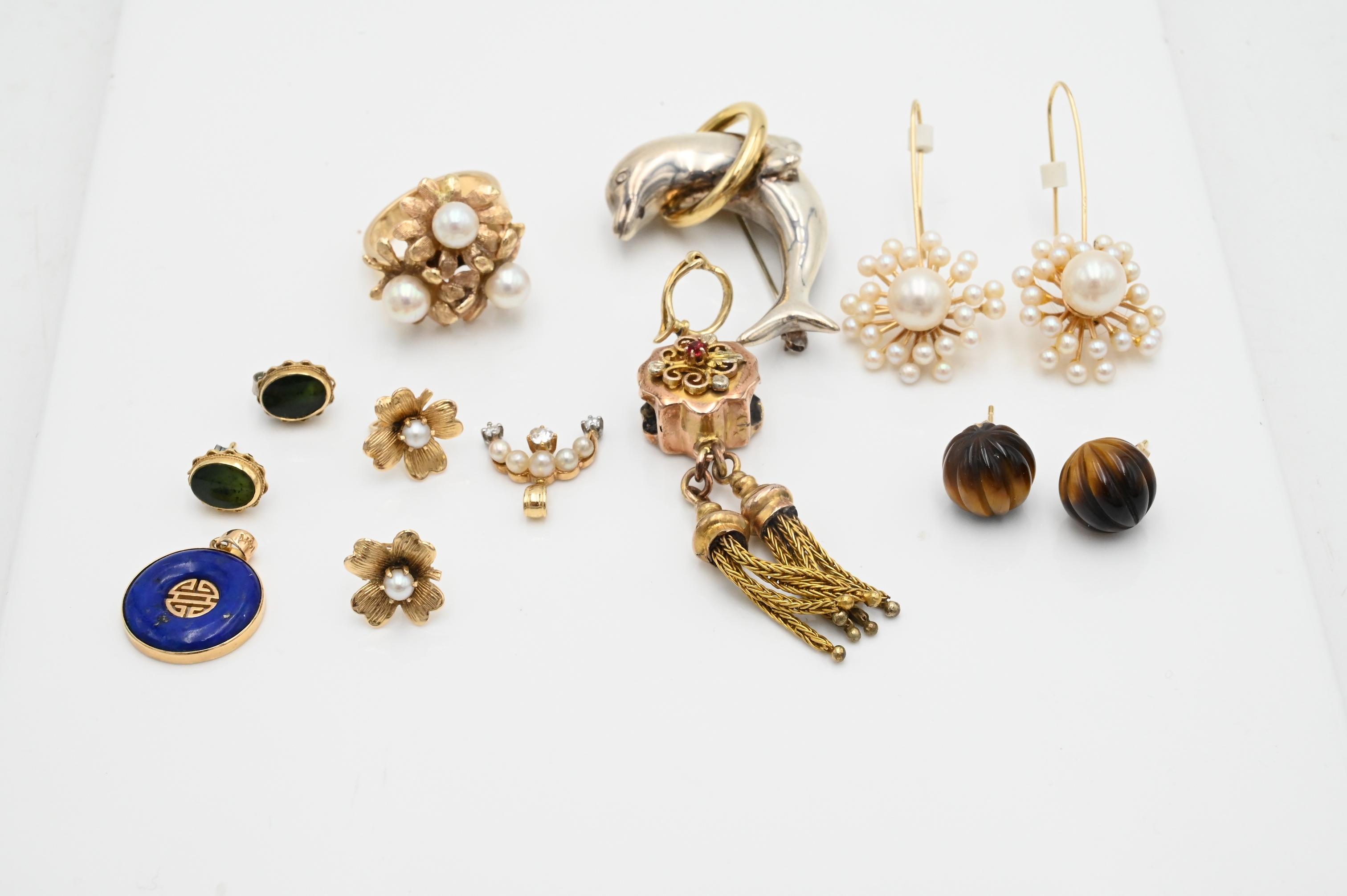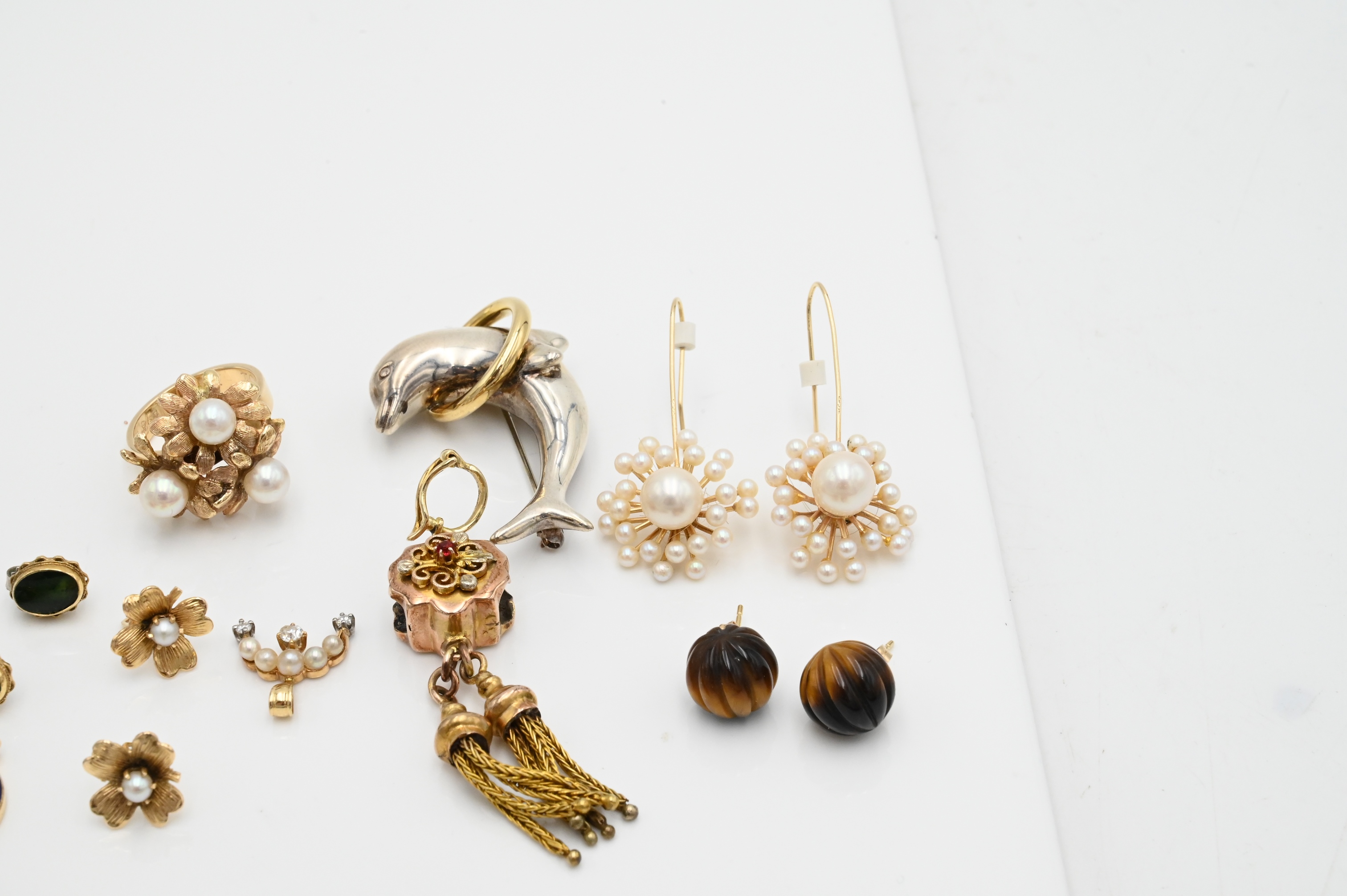 Lot of Gold, to include a ring with three pearls, earrings with pearls, small earrings, silver dolphin, charm.