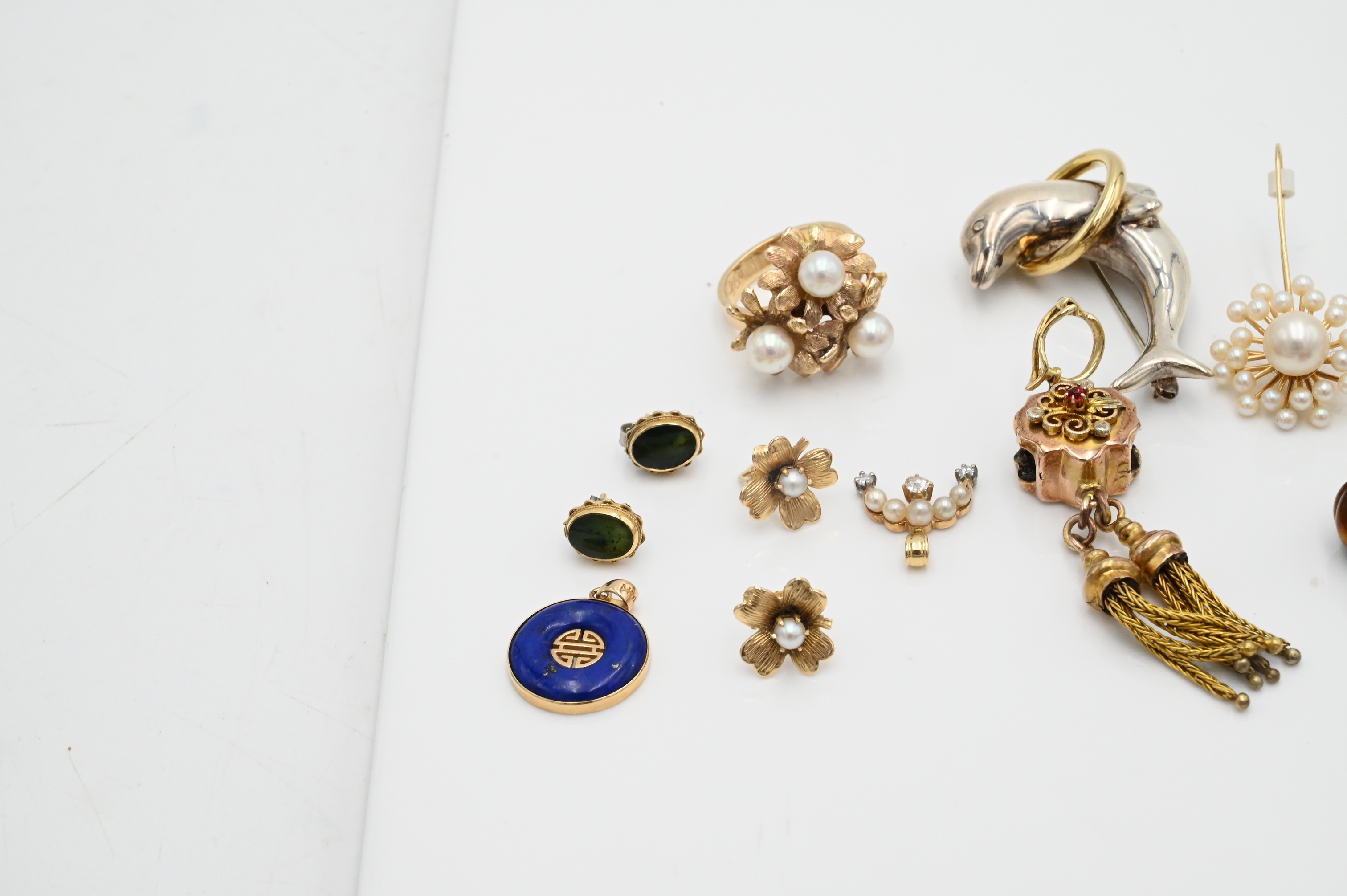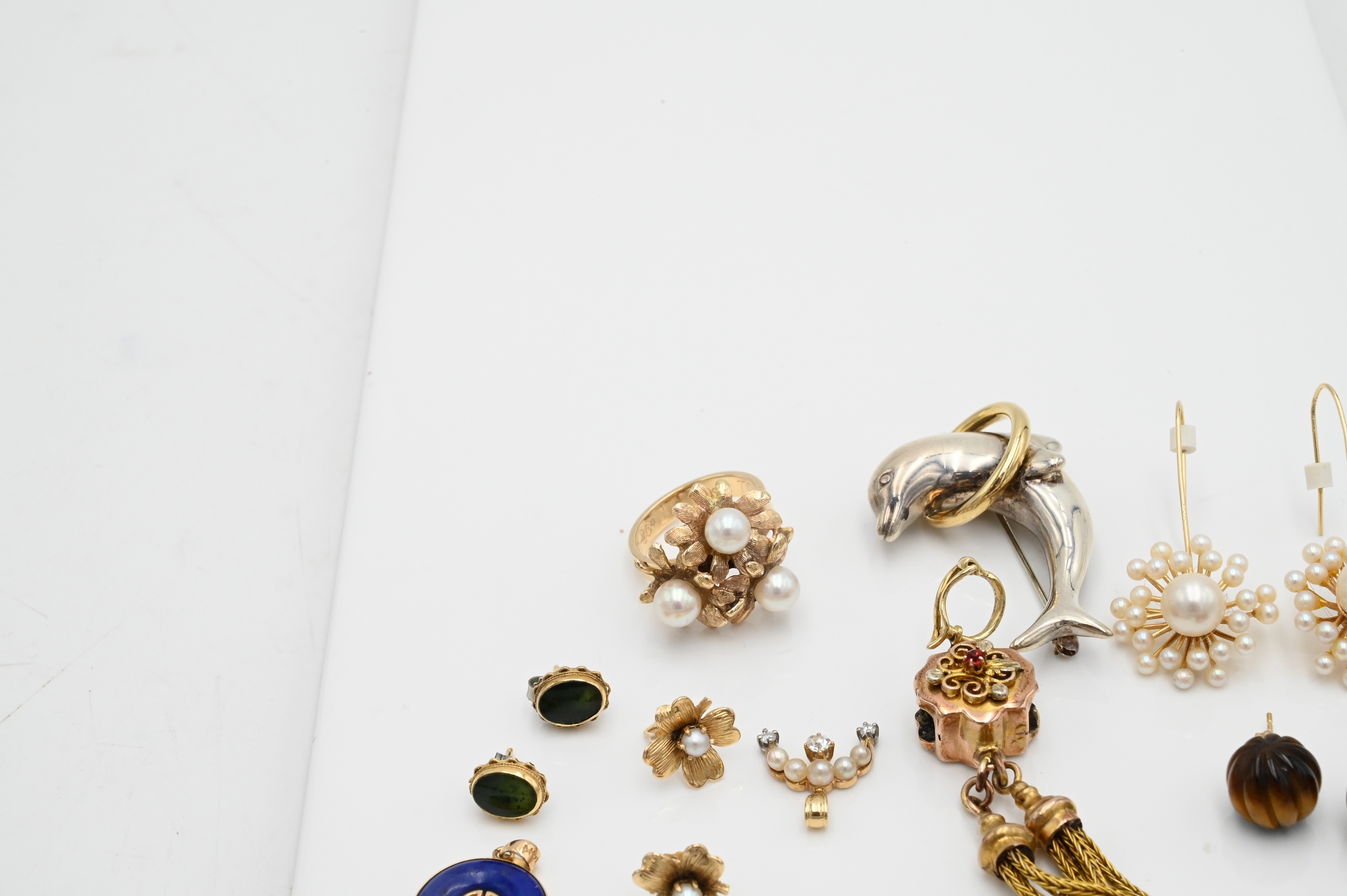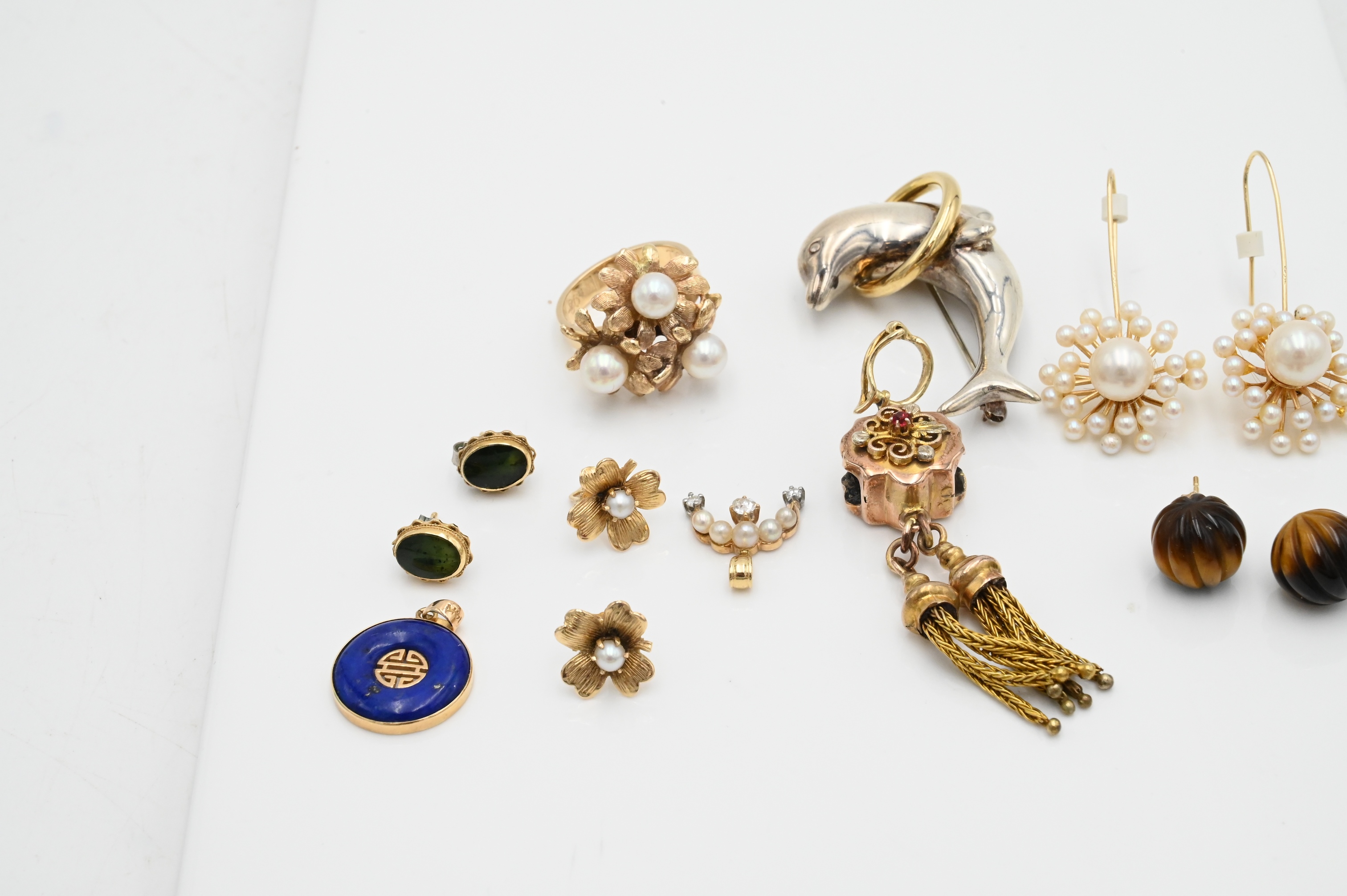 Lot of Gold, to include a ring with three pearls, earrings with pearls, small earrings, silver dolphin, charm.