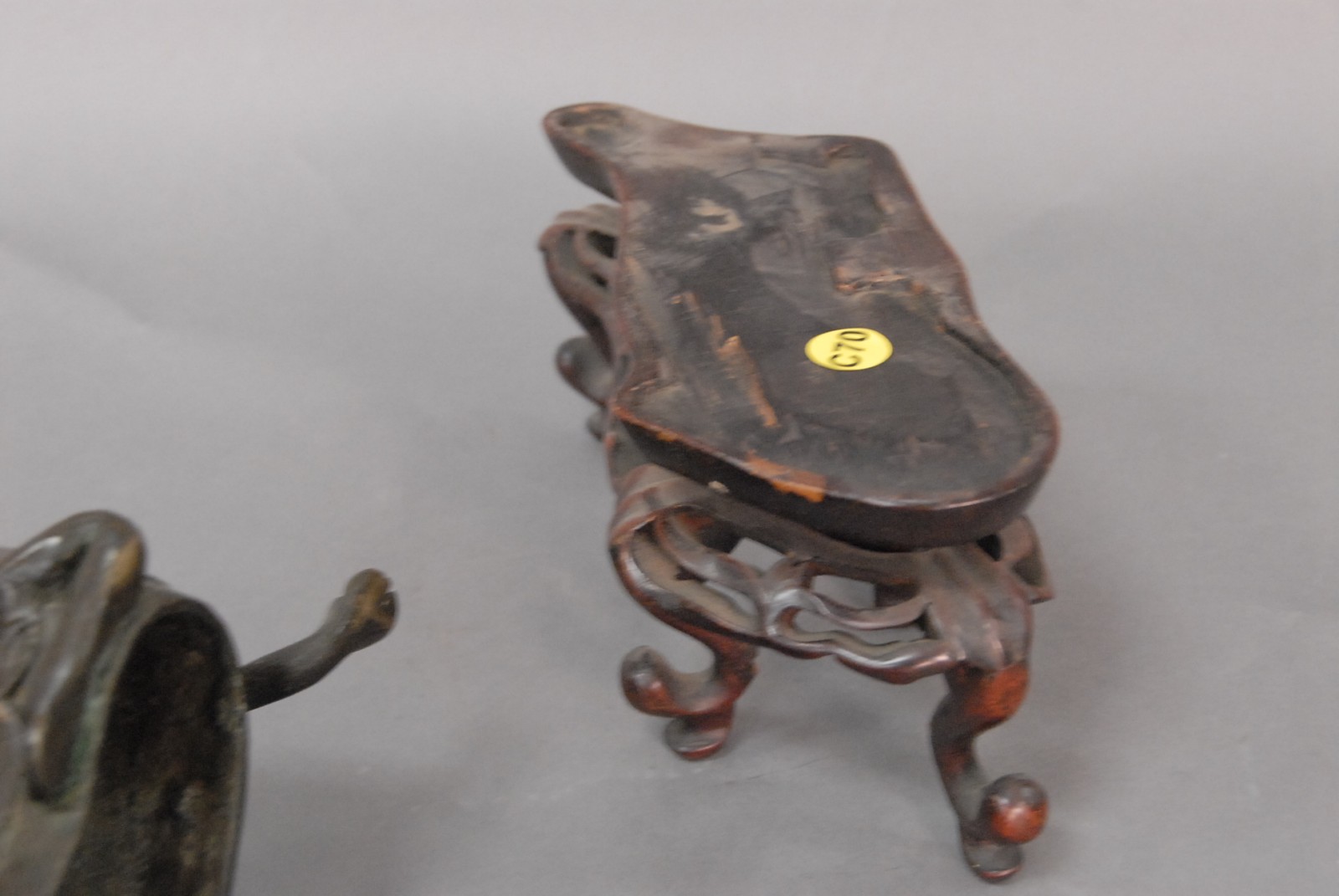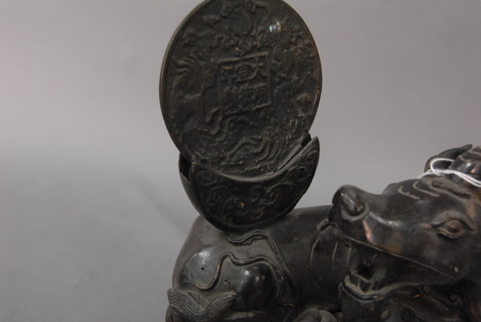 Pair of Chinese bronzes of reclining kilins carrying half moon stand and disk, with fitted footed wood stands, one disc seperated, 18th century – 19th century.