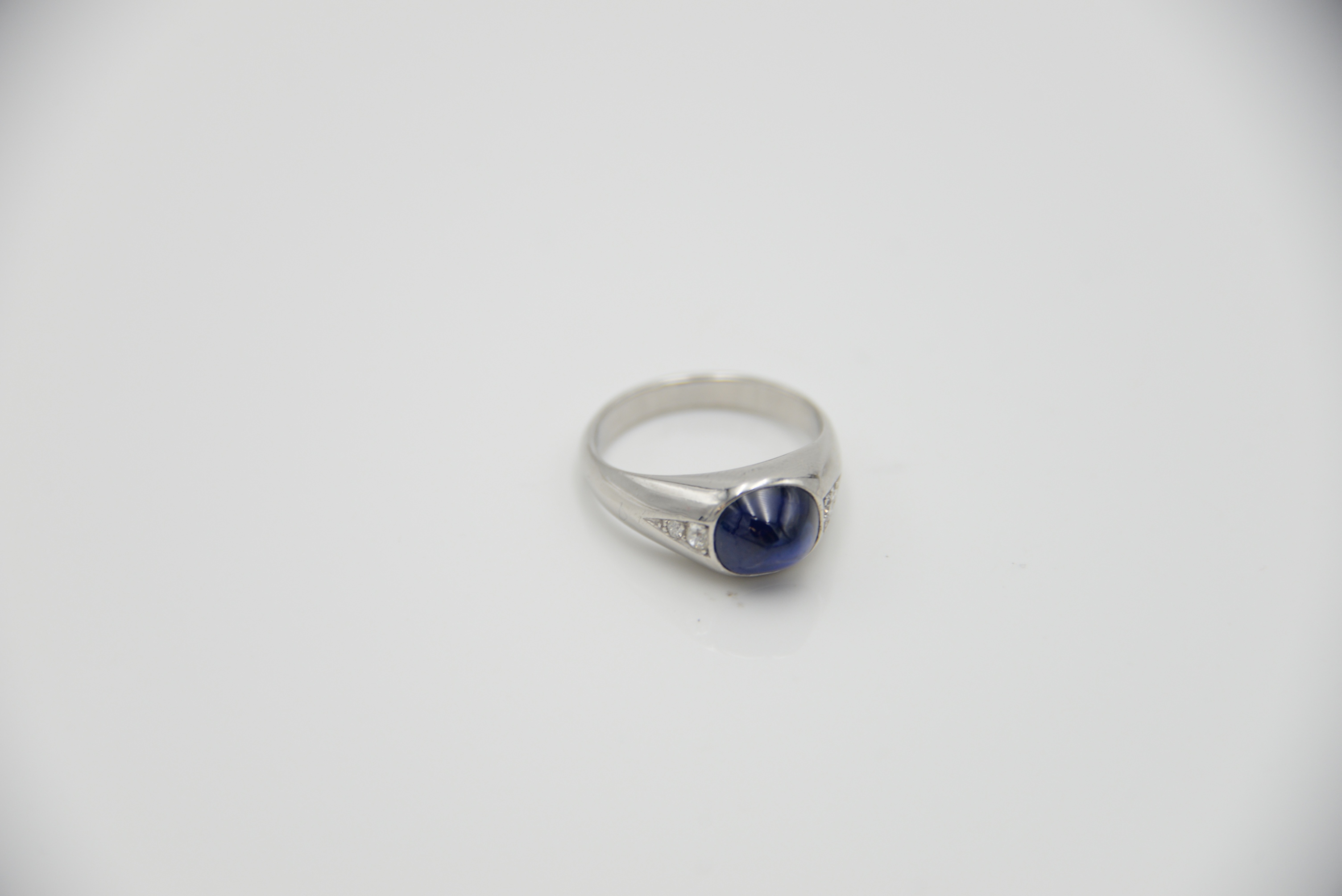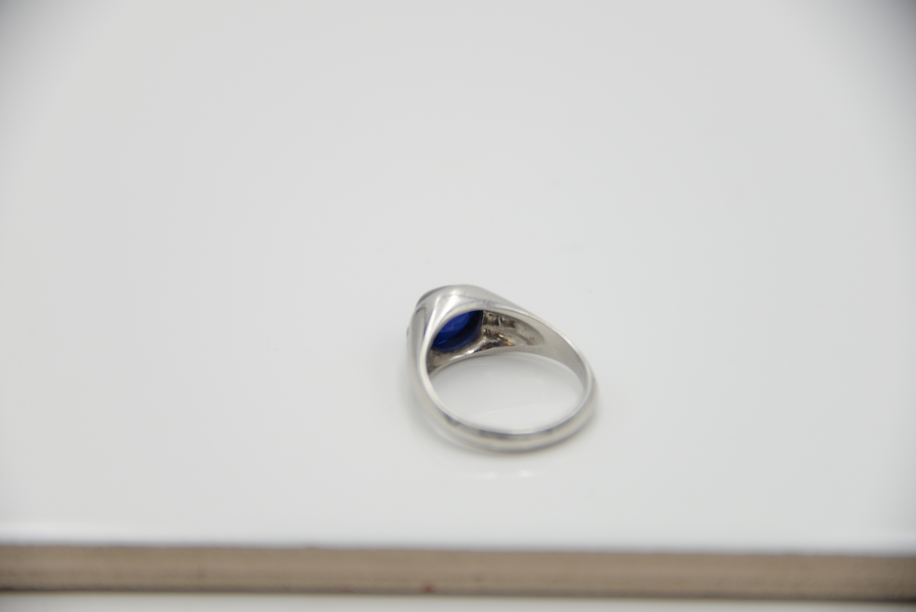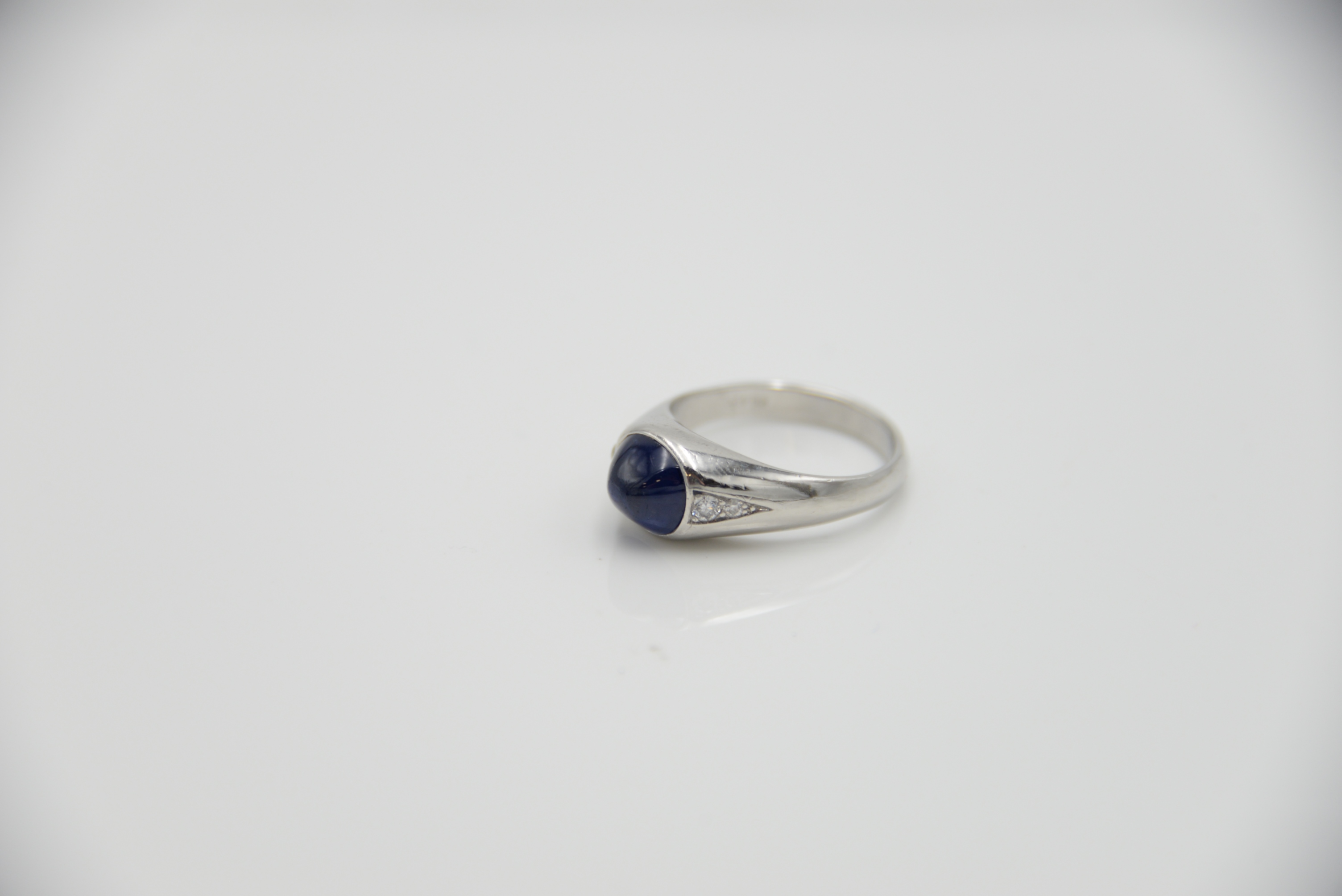 Platinum Ring set with cabochon cut blue sapphire flanked by two diamonds on either side size 7 3/4, 9.5 grams.