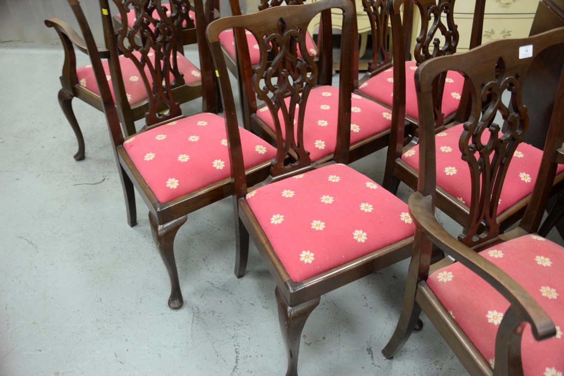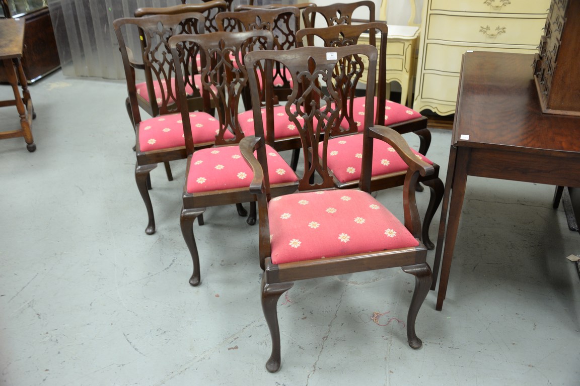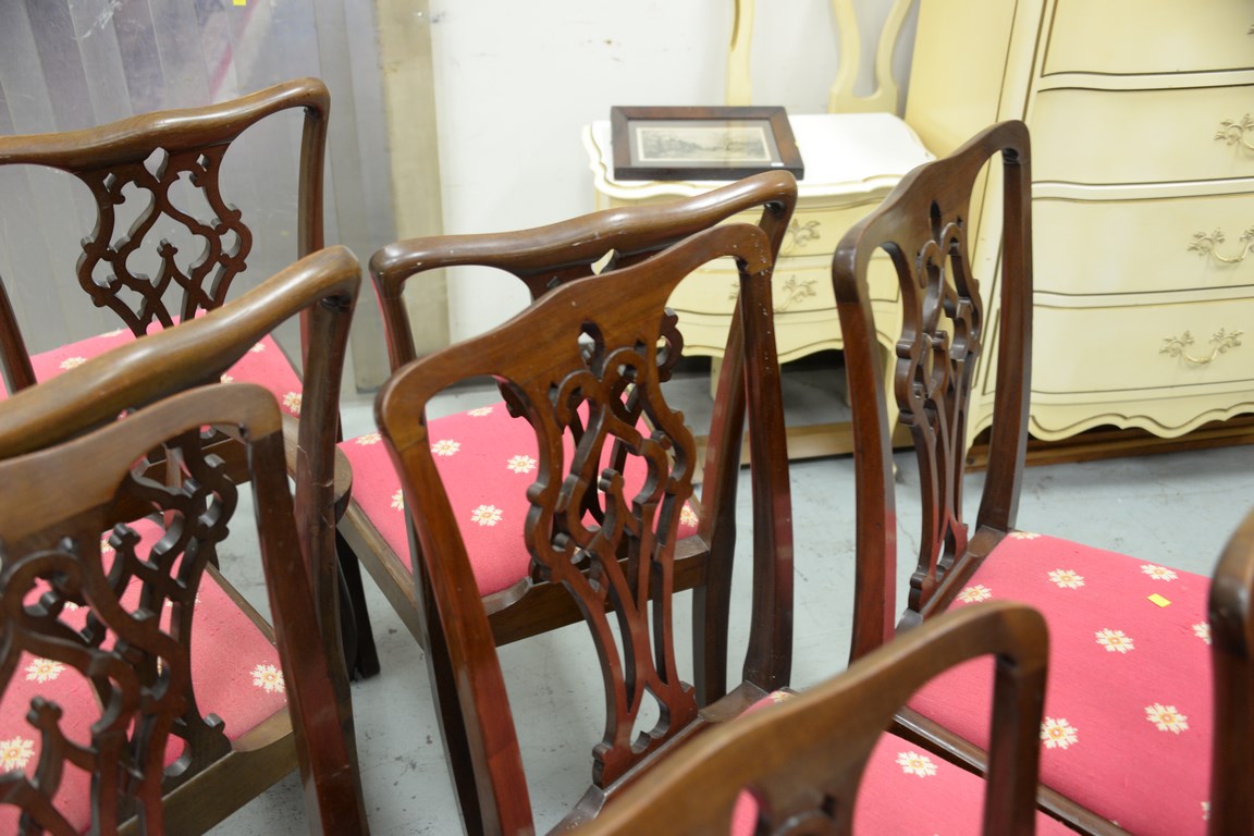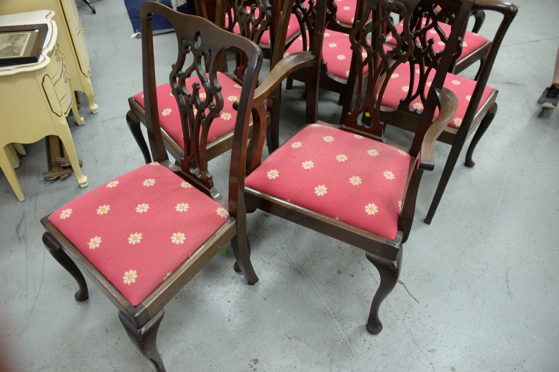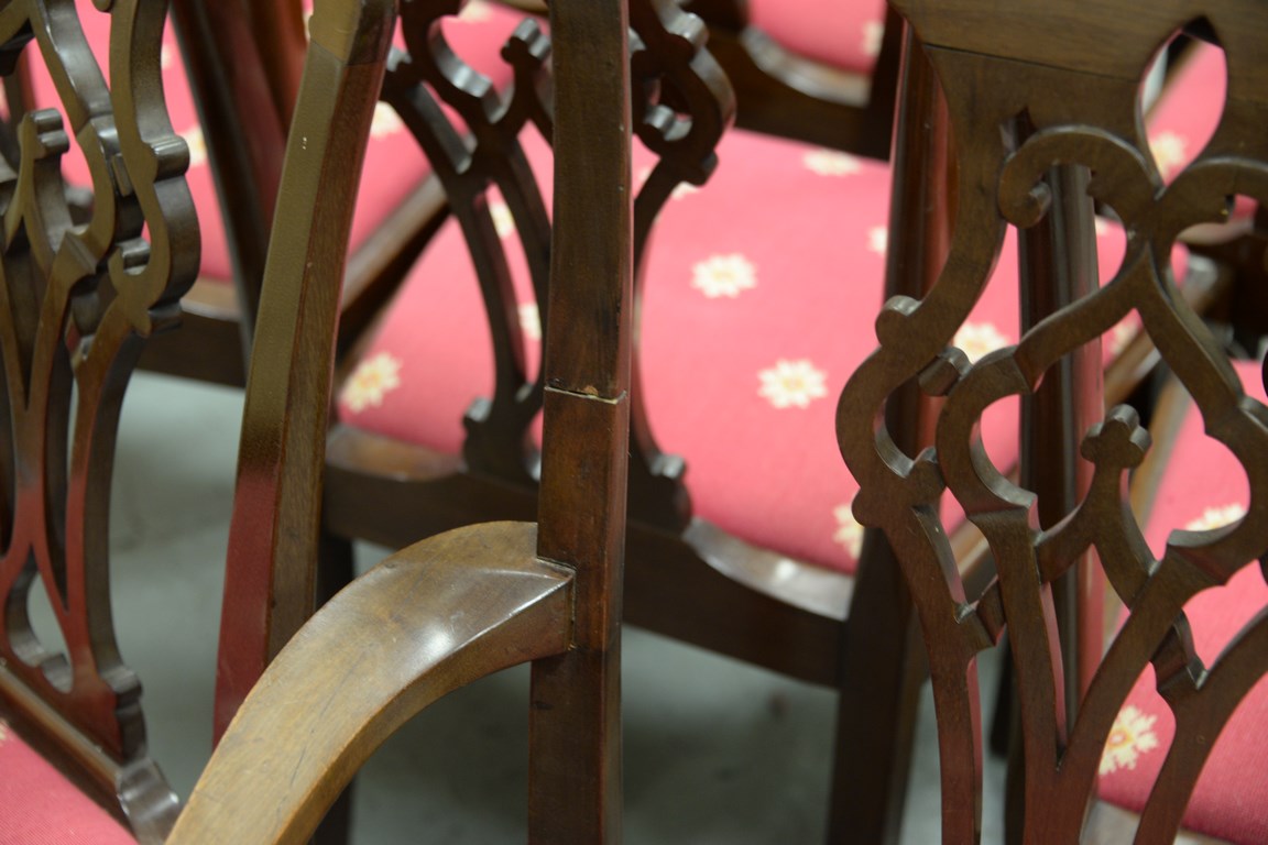 Set of nine mahogany dining chairs, two armchairs and seven side chairs one armchair as is.