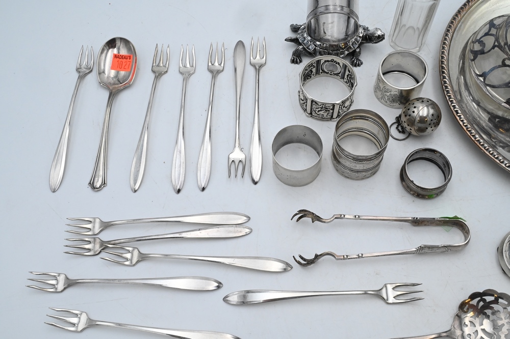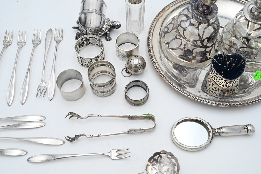 Lot 14: Silver Mirror with Lipstick Case, along with two silver overlay bottles; Caldwell tongs; Tiffany tongs; silver plated turtle napkin ring; silver plated plate; sterling napkin rings; 6.2 weighable sterling, Provenance: Fifty Year Personal Collection of Clocks and American Antiques from Thomas Bailey, Manchester, Connecticut.