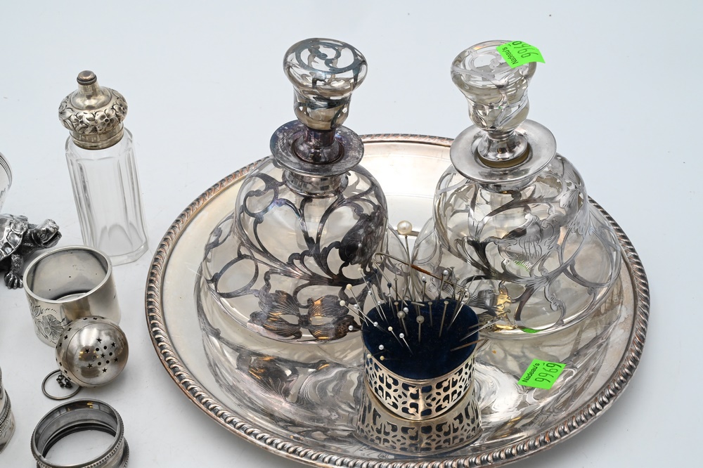 Silver Mirror with Lipstick Case, along with two silver overlay bottles; Caldwell tongs; Tiffany tongs; silver plated turtle napkin ring; silver plated plate; sterling napkin rings; 6.2 weighable sterling, Provenance: Fifty Year Personal Collection of Clocks and American Antiques from Thomas Bailey, Manchester, Connecticut.